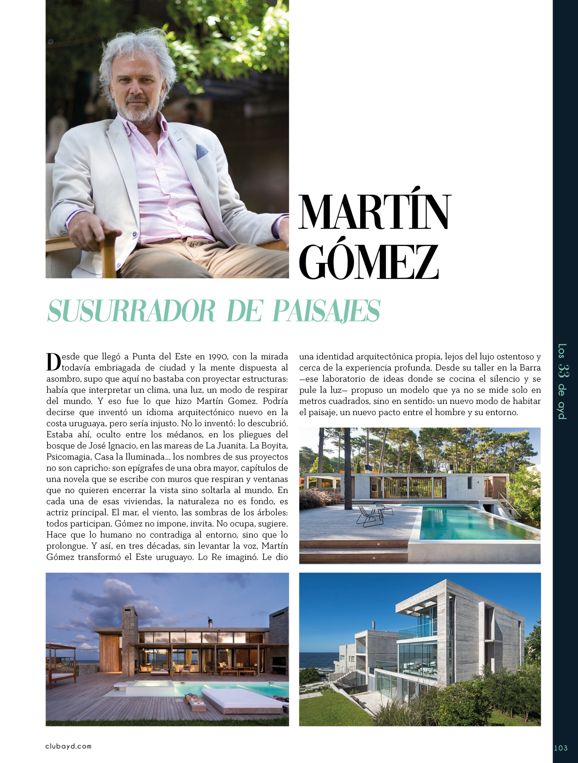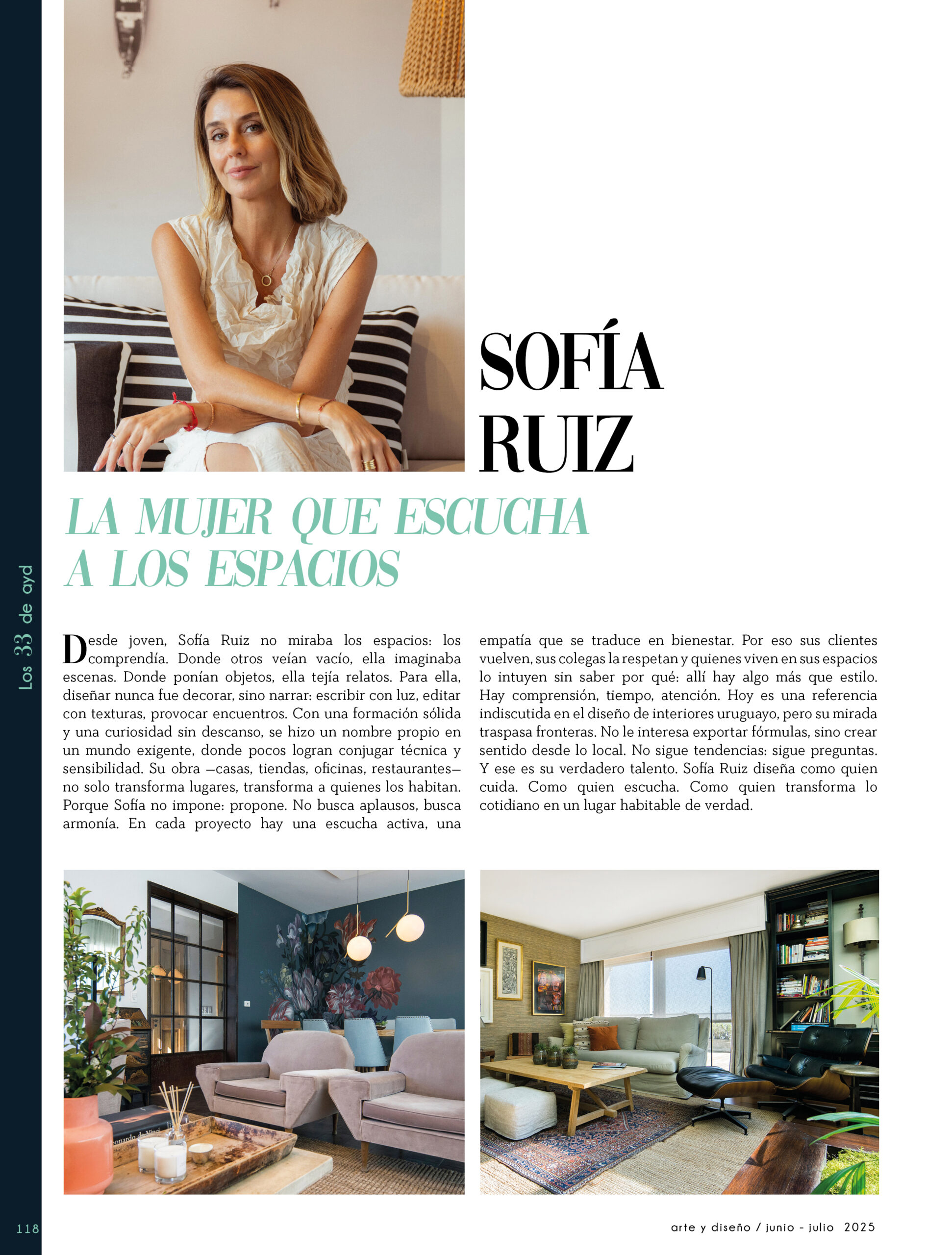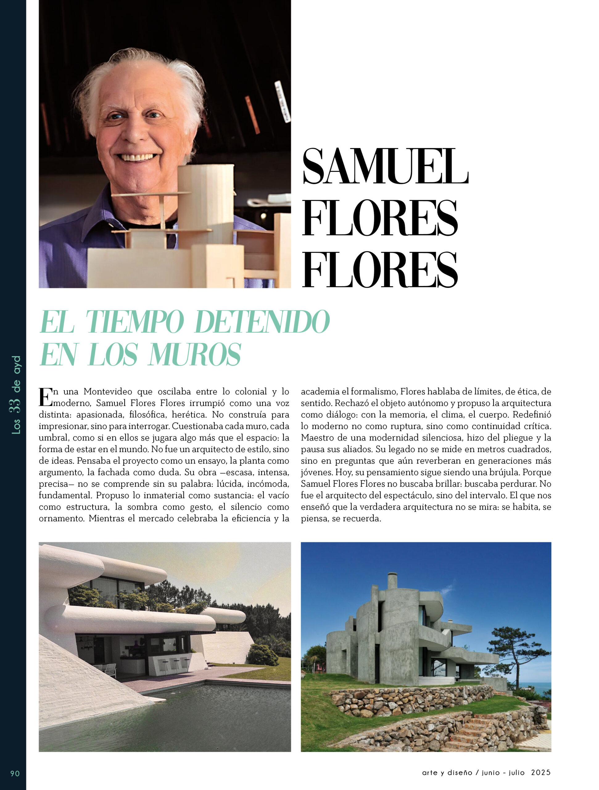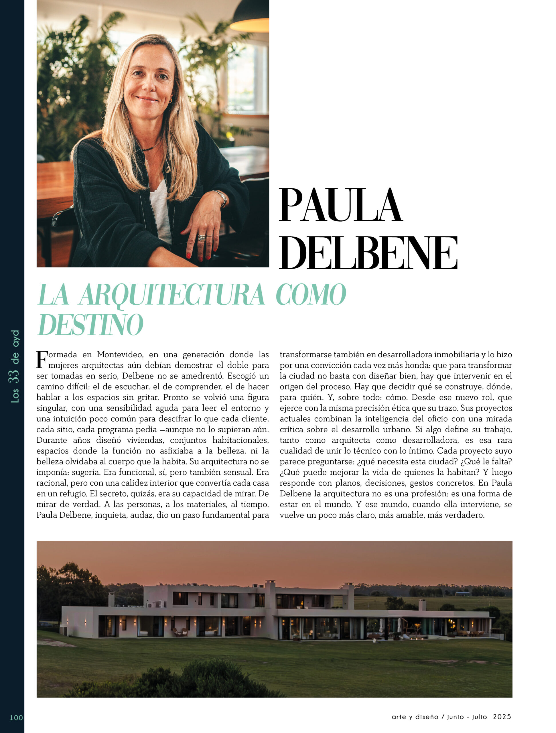 Dicho así, parece apenas un número entero. Pero cada uno de esos años tuvo su forma, su textura, su ritmo. Y juntos hacen una historia, la piel de esta revista, que es la nuestra. Prácticamente nací con ayd. Mientras otros aprendían a caminar, yo aprendía a reconocer un buen papel, a oler la tinta fresca, a distinguir una foto. Crecí entre planos, conversaciones sobre arquitectura y diseño, y viajes por casas que todavía no existían. Mi padre, fundó esta revista sin saber que estaba sembrando algo mucho más grande que una editorial, se trataba de una manera de mirar, de entender, de contar la arquitectura y el diseño en Uruguay. No como espectadores, sino como testigos y protagonistas de un tiempo que cambia —y que también nos define. Hoy, al cumplir treinta y tres años, siento que ayd ya no nos pertenece solo a nosotros. No es solo de mi padre, ni mía, ni de nuestra familia. Es de todos los que alguna vez encontraron en sus páginas una idea, inspiración, un gesto que les abrió un camino, una idea. Es de quienes entendieron que ayd habla y cuenta de cómo elegimos habitar el mundo. Por eso elegimos este título. Treinta y tres. Lo que el tiempo nos enseñó, es un acto de gratitud. El tiempo nos enseñó a escuchar antes de opinar. A mirar con atención antes de afirmar. A editar con respeto. A saber, que el diseño es forma, sí, pero también es cultura, identidad y memoria. Es una sinergia entre lo que fuimos y lo que está por venir. Porque la historia no es algo que se archiva: es algo que se vive, se revisa, se proyecta. Y aunque aprendimos mucho, sabemos que lo mejor aún está por descubrir, nuevas generaciones, nuevas formas de habitar, nuevas preguntas, nuevas plataformas para contar lo que vemos. Y en ese camino hacia lo que viene, elegimos detenernos un instante para mirar con atención lo que fuimos y lo que somos.