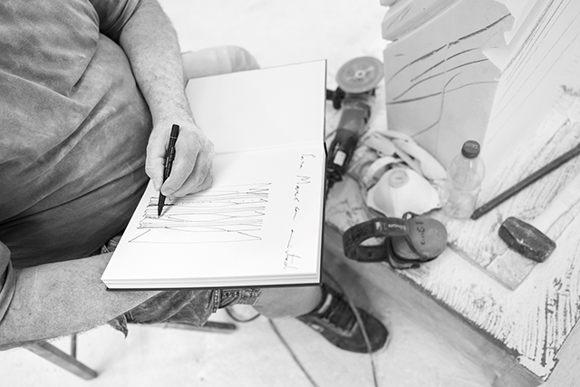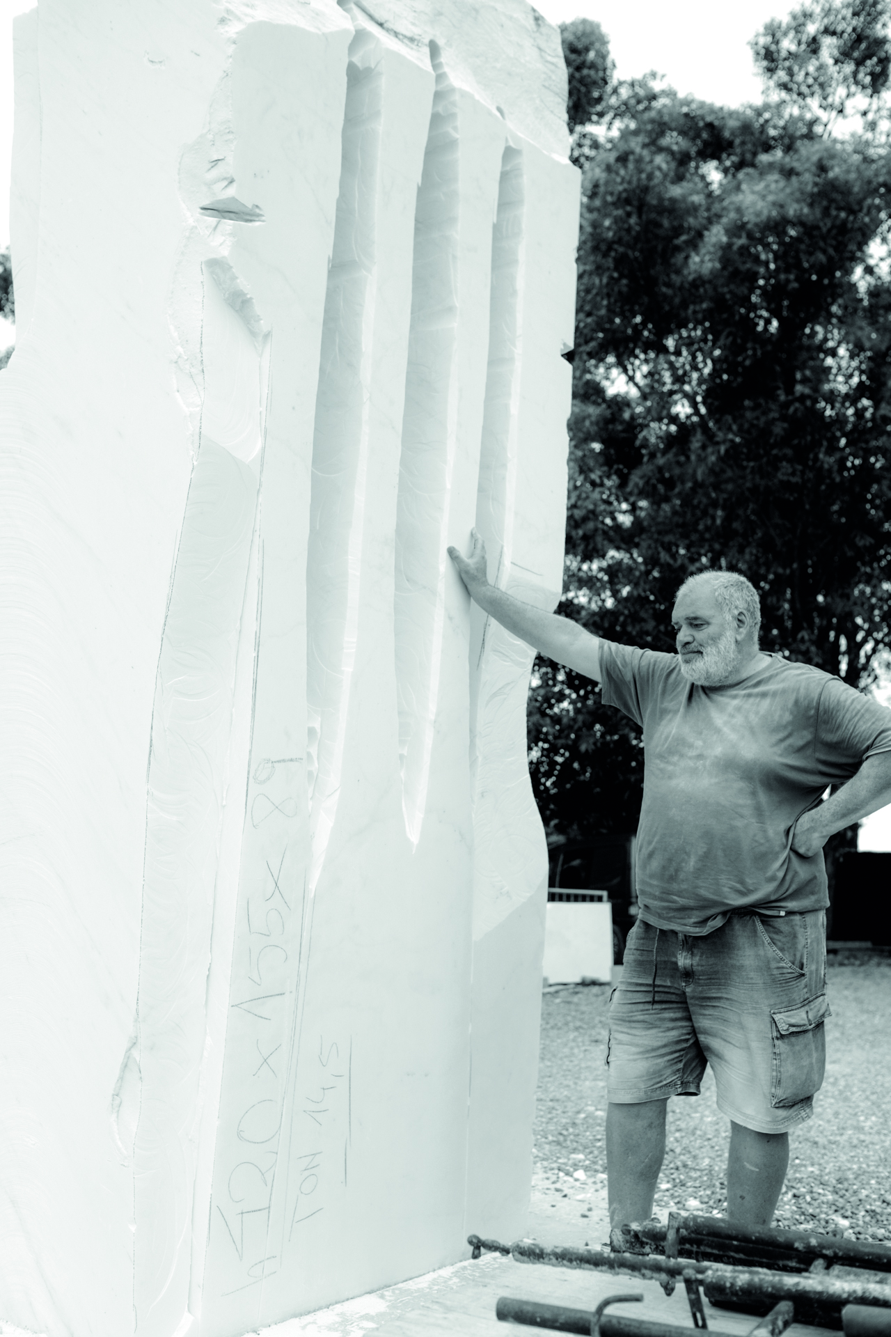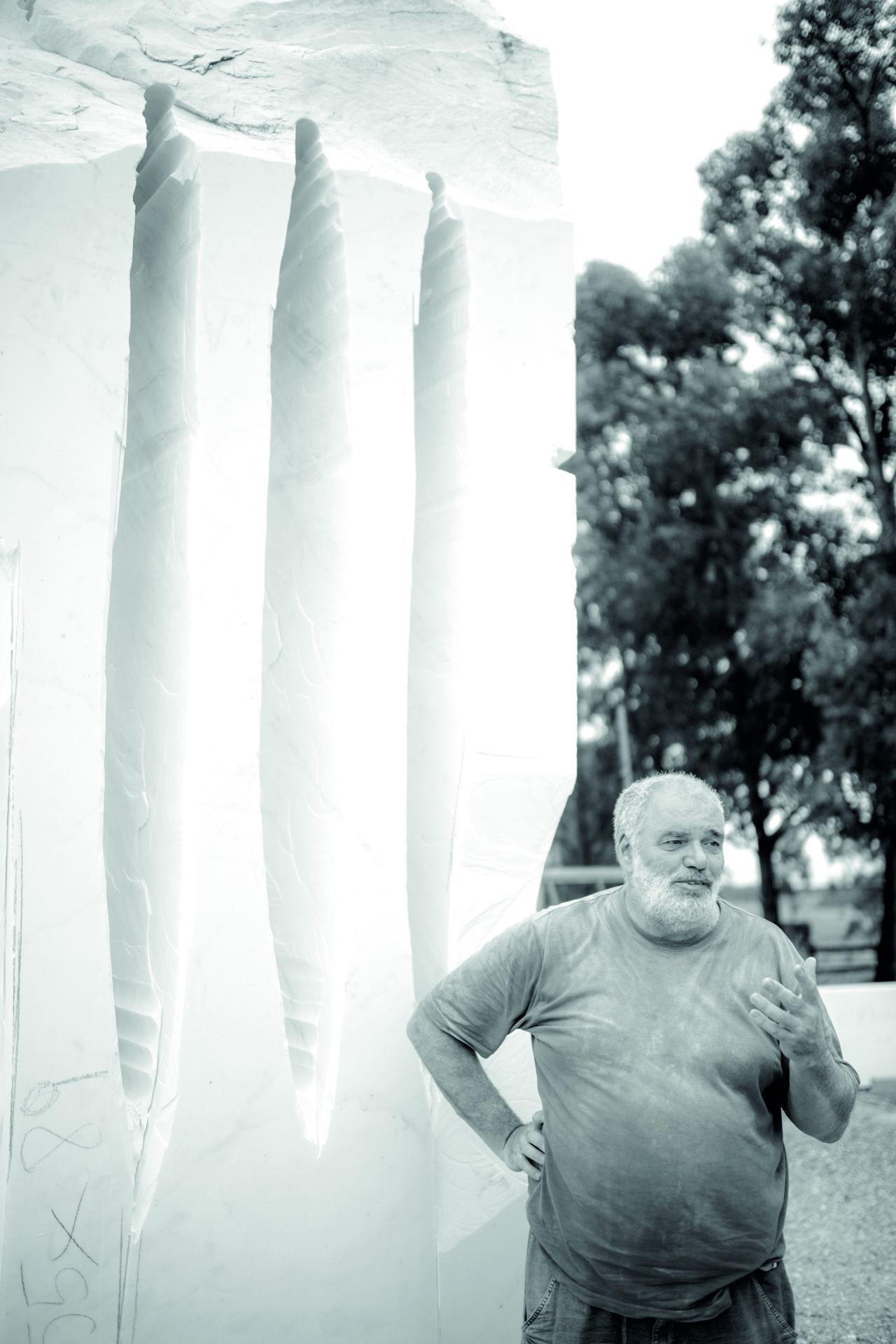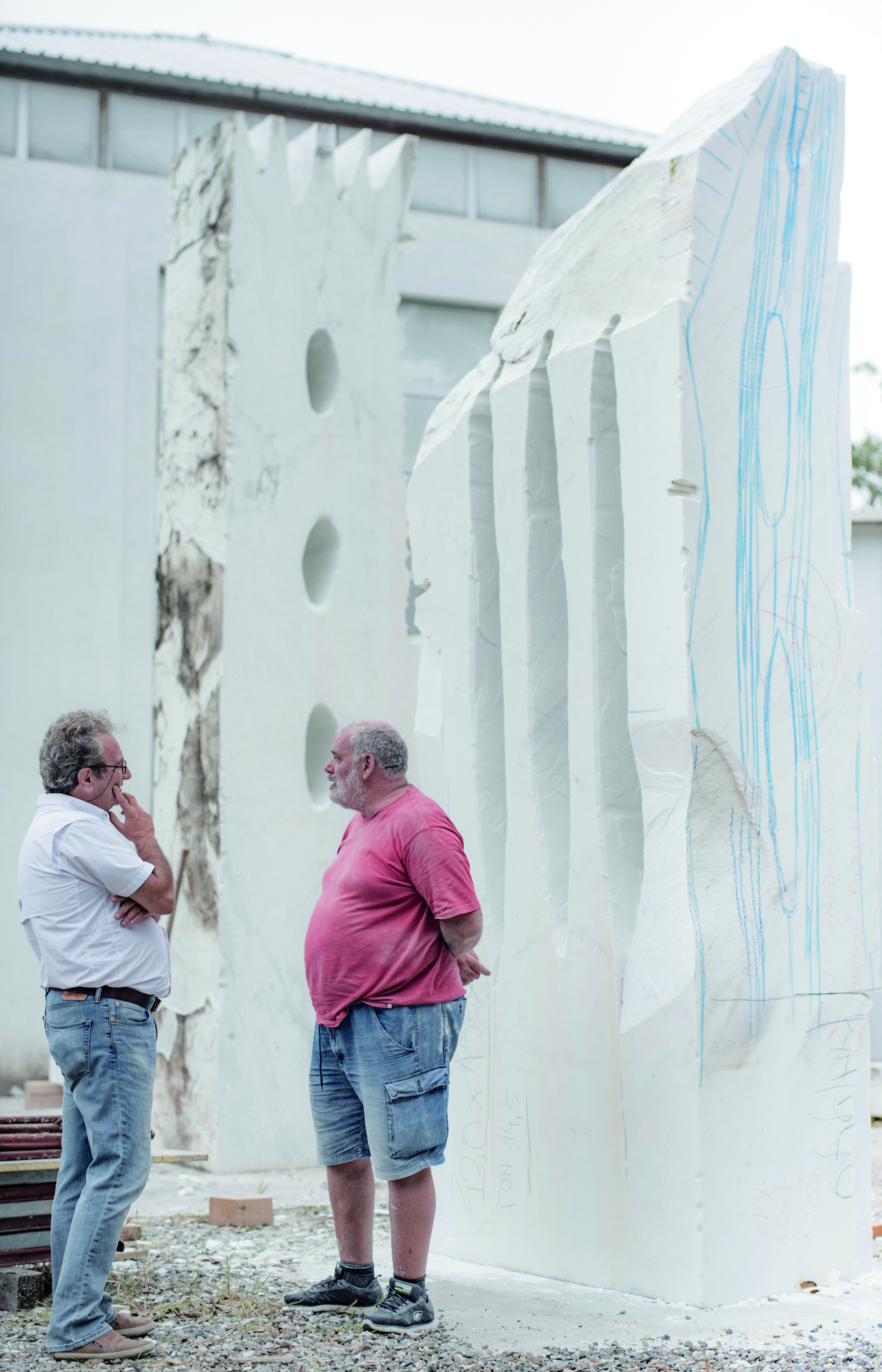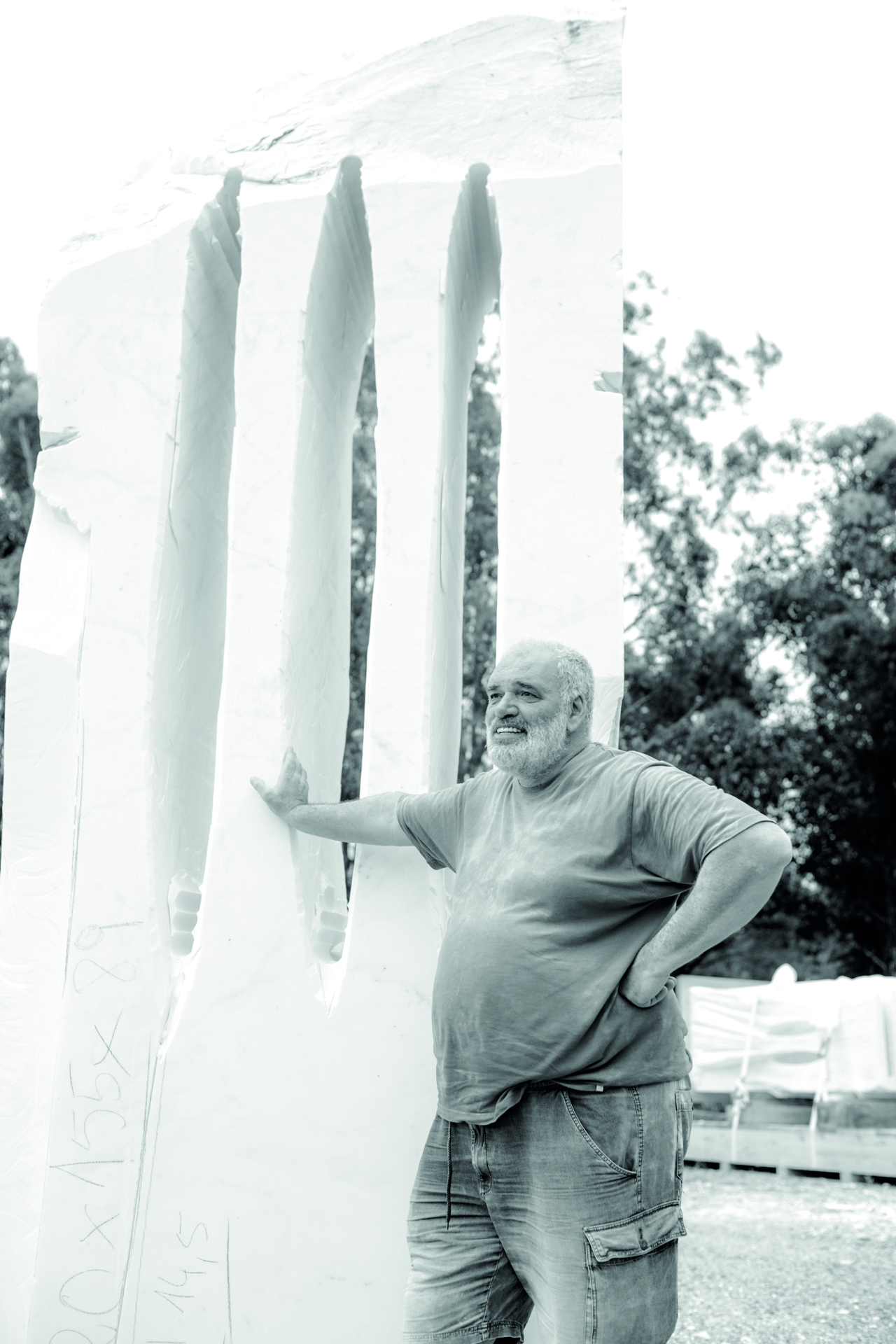Pablo Atchugarry no quiere utilizar tecnología para su obra escultórica. Trabaja con sierras eléctricas y también con el legendario marrón de mano. Lo asisten tres operarios que siguen instrucciones específicas y hacen posible que la titánica tarea de creación sea un tanto más llevadero. En medio del taller lo encuentro trabajando con una amoladora en una pieza chica que ya está pronta para ser entregada. Viste una remera sin cuello que en algún momento fue de color rojo intenso. Ahora, al igual que los jeans que calza y que su cabellera, son blancos. El polvo del mármol allí lo baña todo. Al verme interrumpe la tarea, se quita las gafas de protección y me sonríe. Con la boca, con los ojos, con la cara. Ese hombre de tamaño descomunal no deja de sorprenderme con esa ternura inconmensurable que transmite con todos sus gestos.