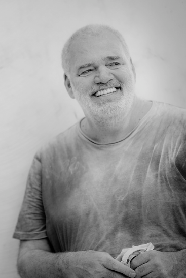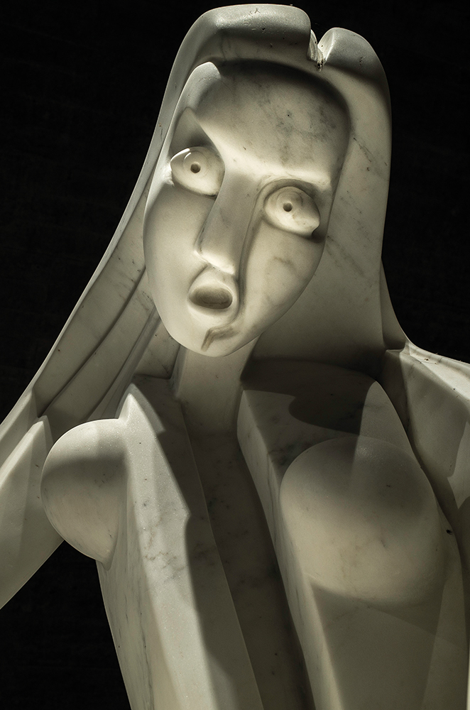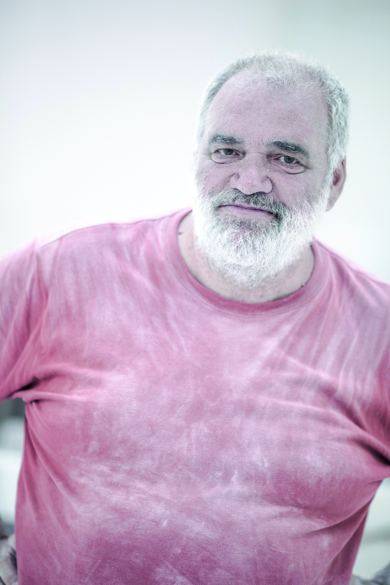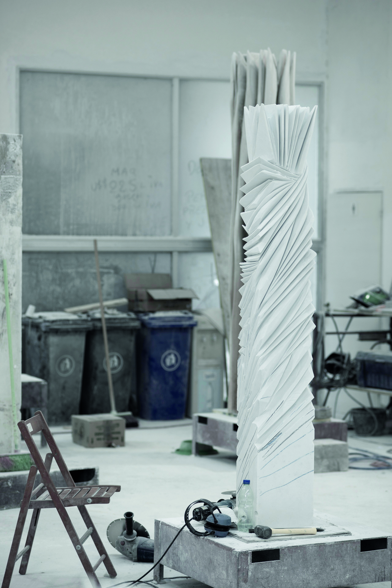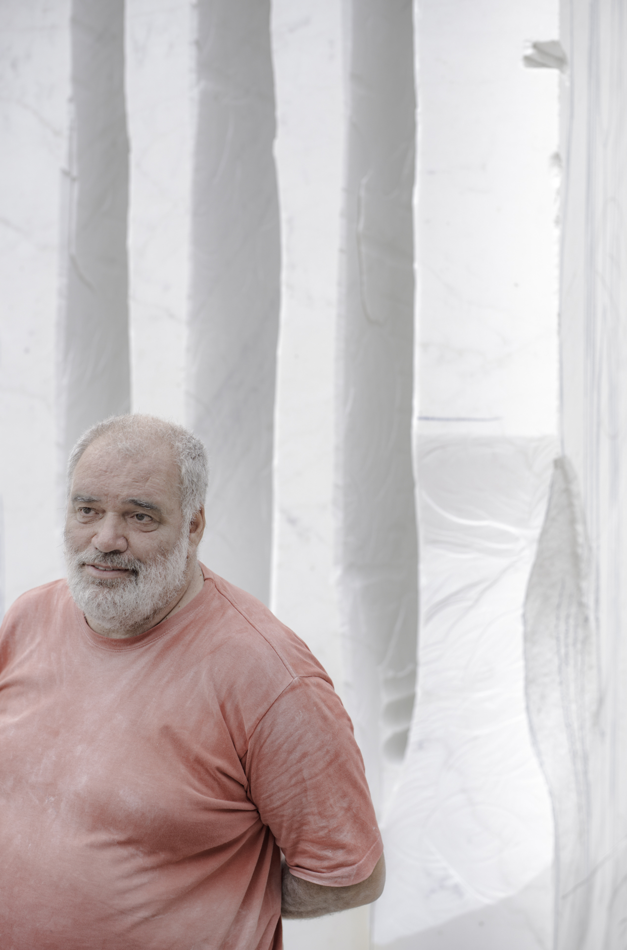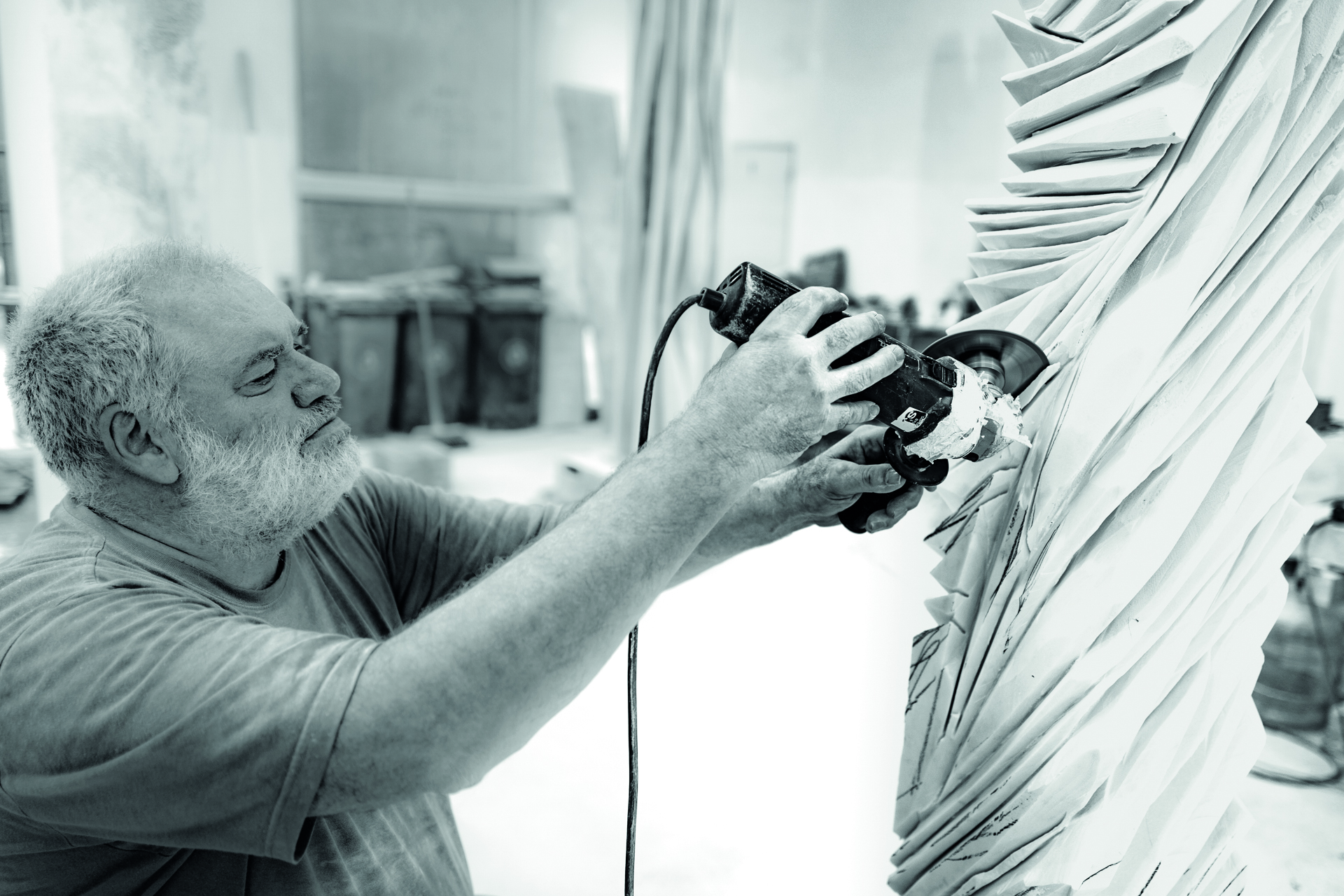 Pablo Atchugarry no quiere utilizar tecnología para su obra escultórica. Trabaja con sierras eléctricas y también con el legendario marrón de mano. Lo asisten tres operarios que siguen instrucciones específicas y hacen posible que la titánica tarea de creación sea un tanto más llevadero. En medio del taller lo encuentro trabajando con una amoladora en una pieza chica que ya está pronta para ser entregada. Viste una remera sin cuello que en algún momento fue de color rojo intenso. Ahora, al igual que los jeans que calza y que su cabellera, son blancos. El polvo del mármol allí lo baña todo. Al verme interrumpe la tarea, se quita las gafas de protección y me sonríe. Con la boca, con los ojos, con la cara. Ese hombre de tamaño descomunal no deja de sorprenderme con esa ternura inconmensurable que transmite con todos sus gestos.