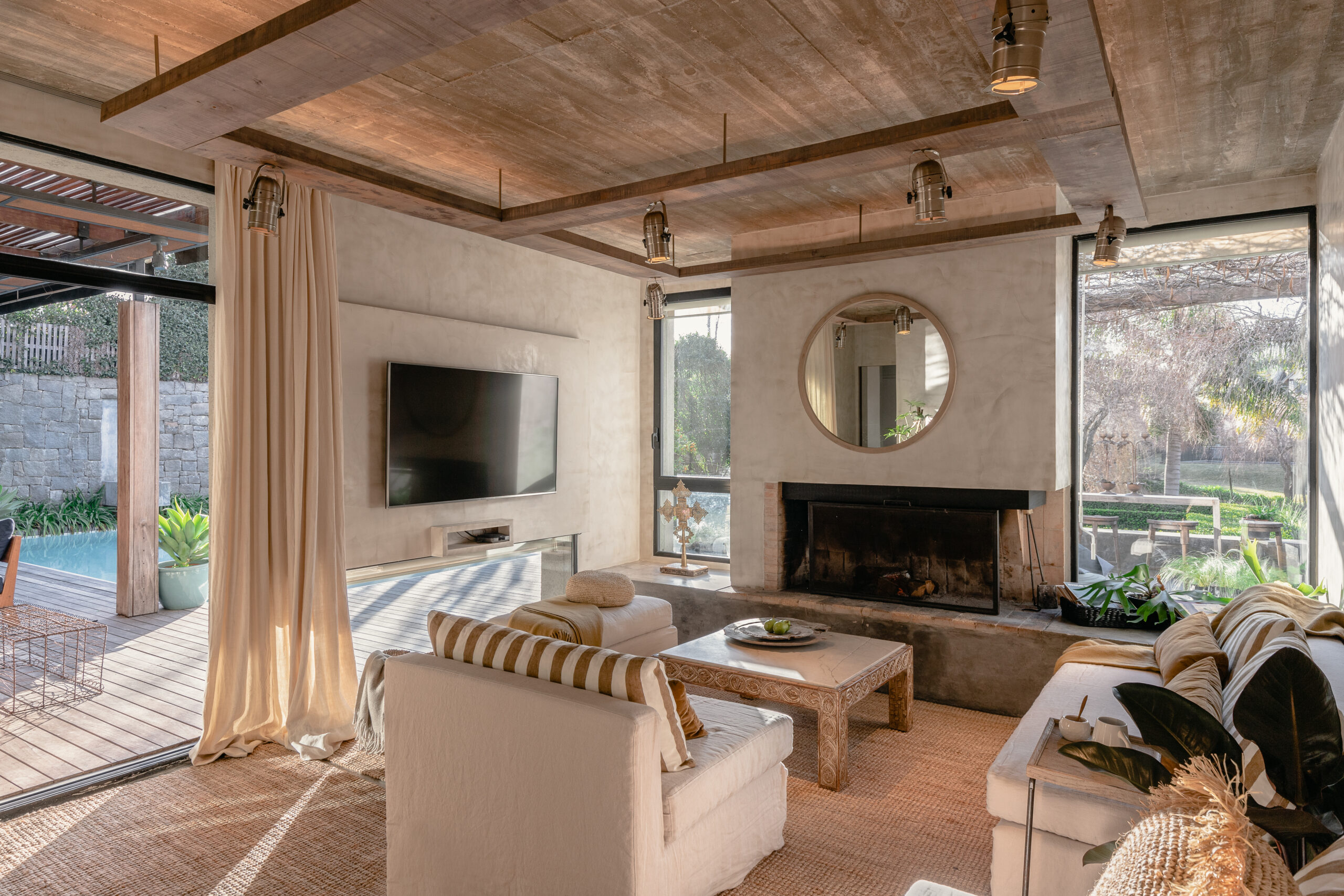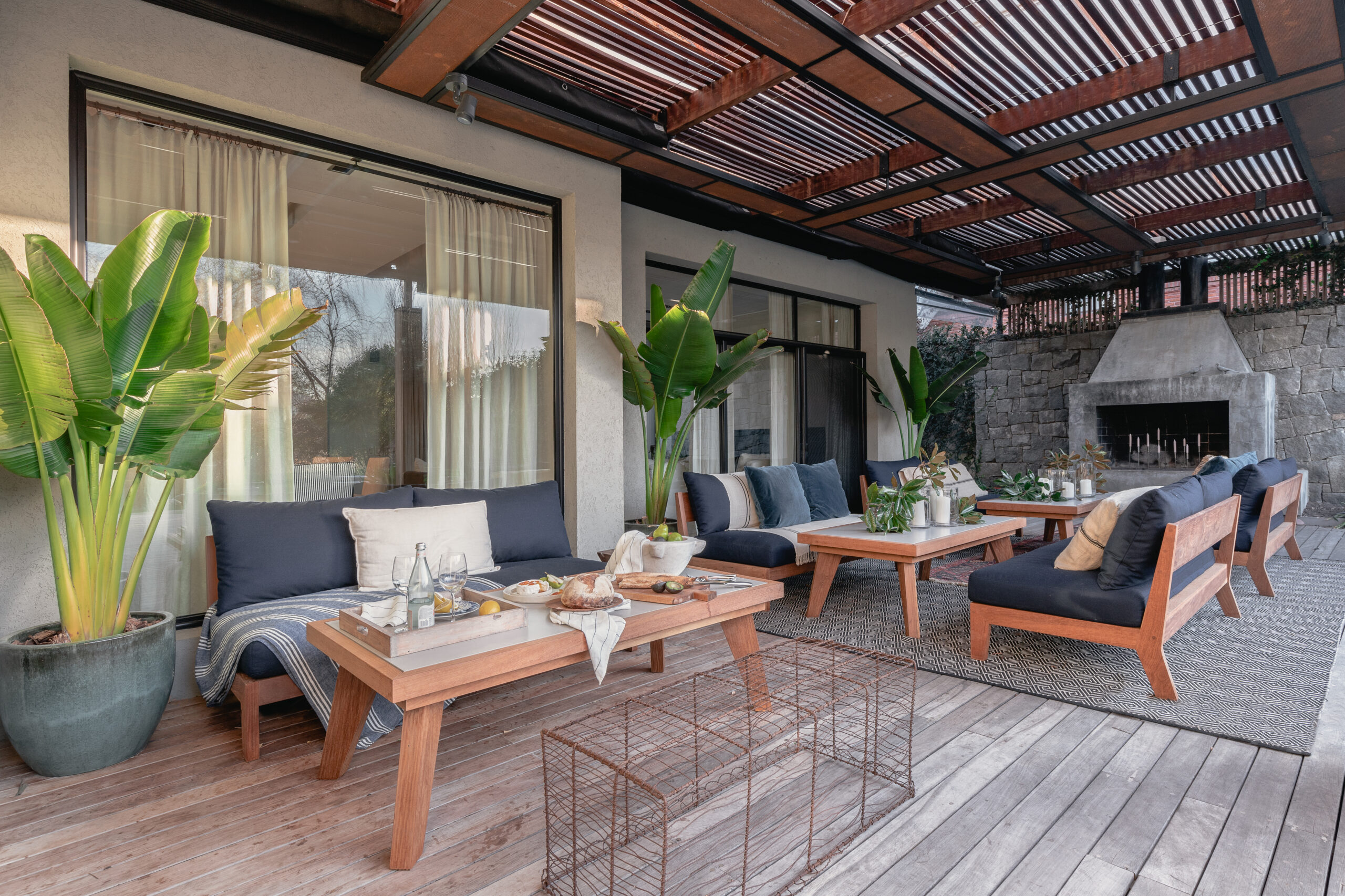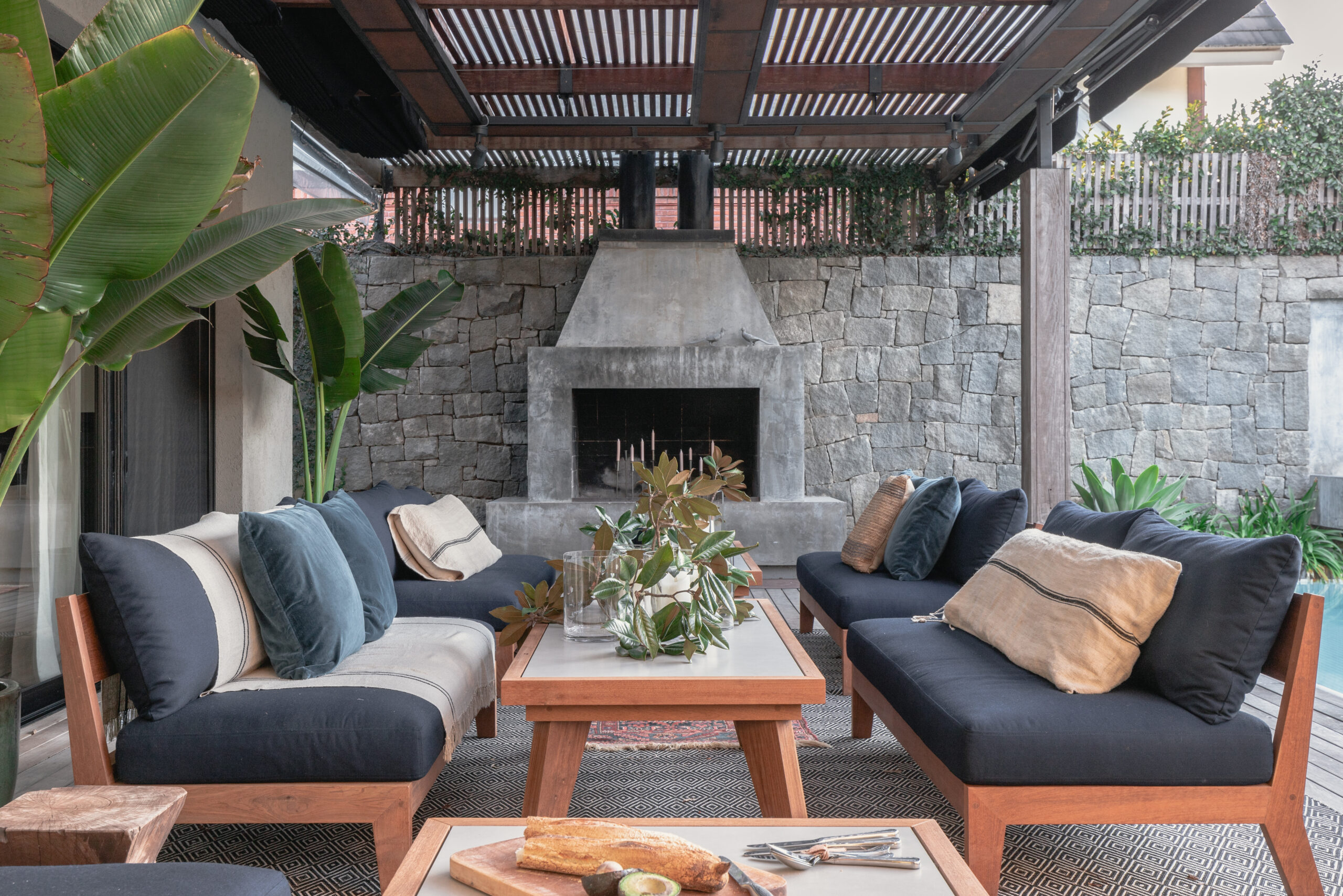 …la estrella del proyecto es el living comedor conectado a una gran galería , donde el objetivo radicaba en conectar el interior al exterior y viceversa. Por eso su equipamiento esta conformado por camastros y mesas de lapacho y neolith y toda colchonería en tela sunbrella, apta para uso exterior, todo fue diseñado a medida. El equipamiento fue concebido de manera tal que se adapta según el evento familiar o social del caso, pueden unirse o separase según convenga, y conformar diferentes núcleos. Tiene una gran pérgola techada donde el nivel del piso interior del living , el deck exterior, el espejo de agua de la piscina y del solarium, es exactamente el mismo, generando una gran amplitud , y una sensación extremadamente cálida , donde se pierden los limites del adentro y del afuera. Remata la galería una gran estufa, reforzando la idea de llevar el interior al exterior, donde el fuego es protagonista…