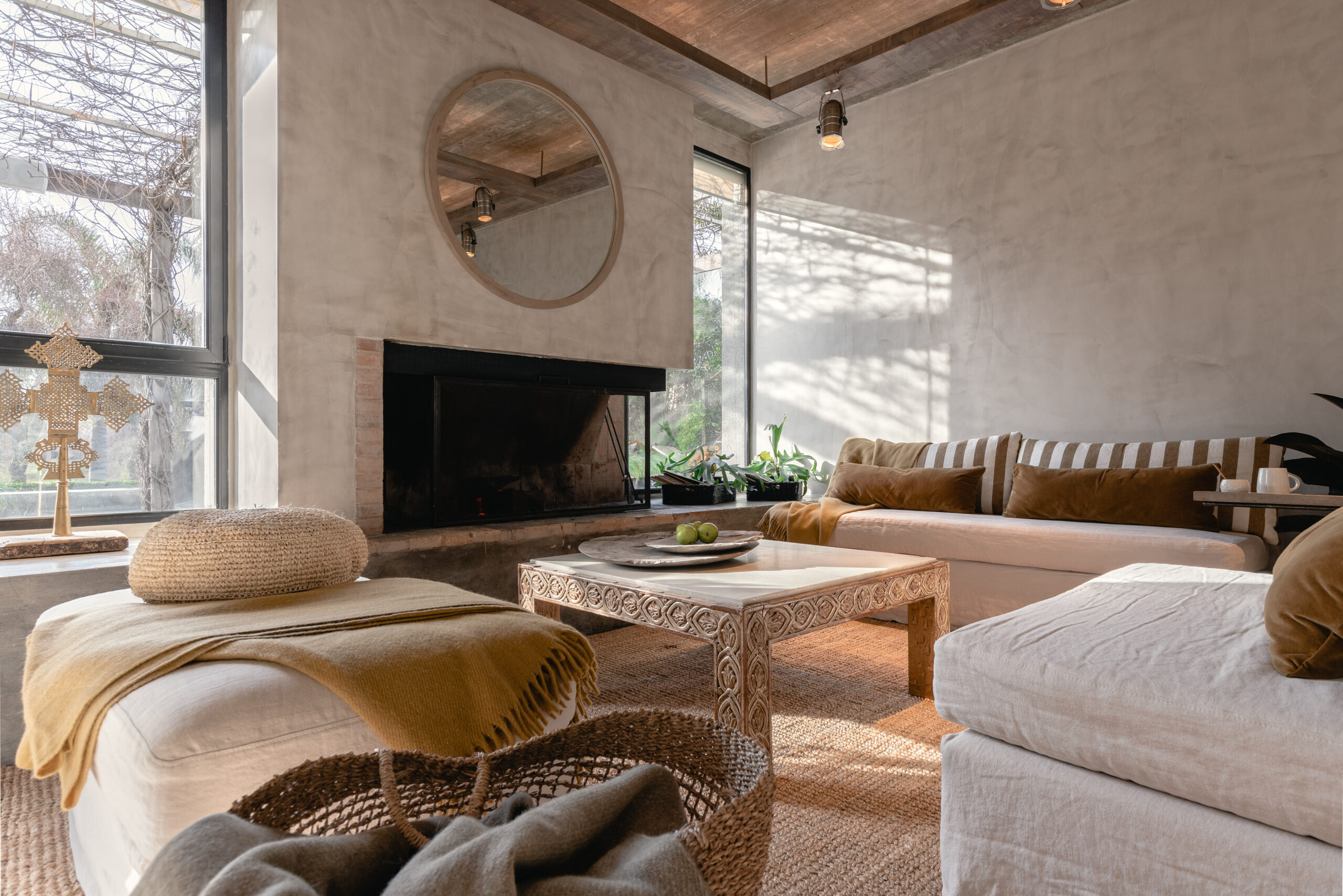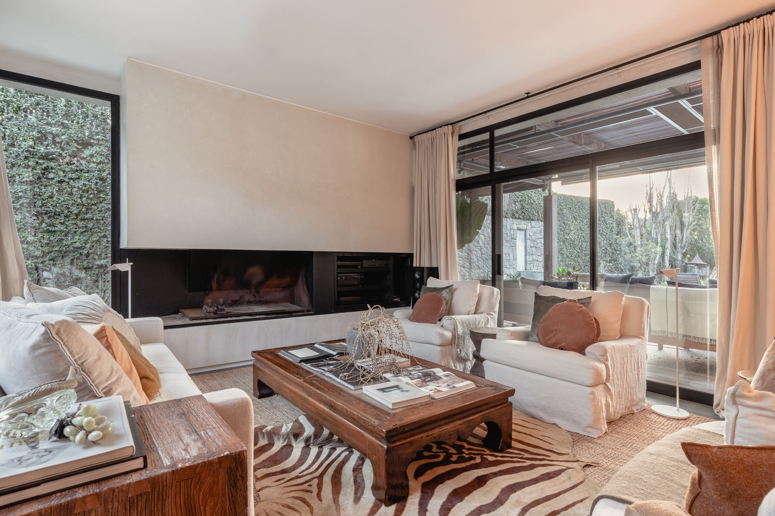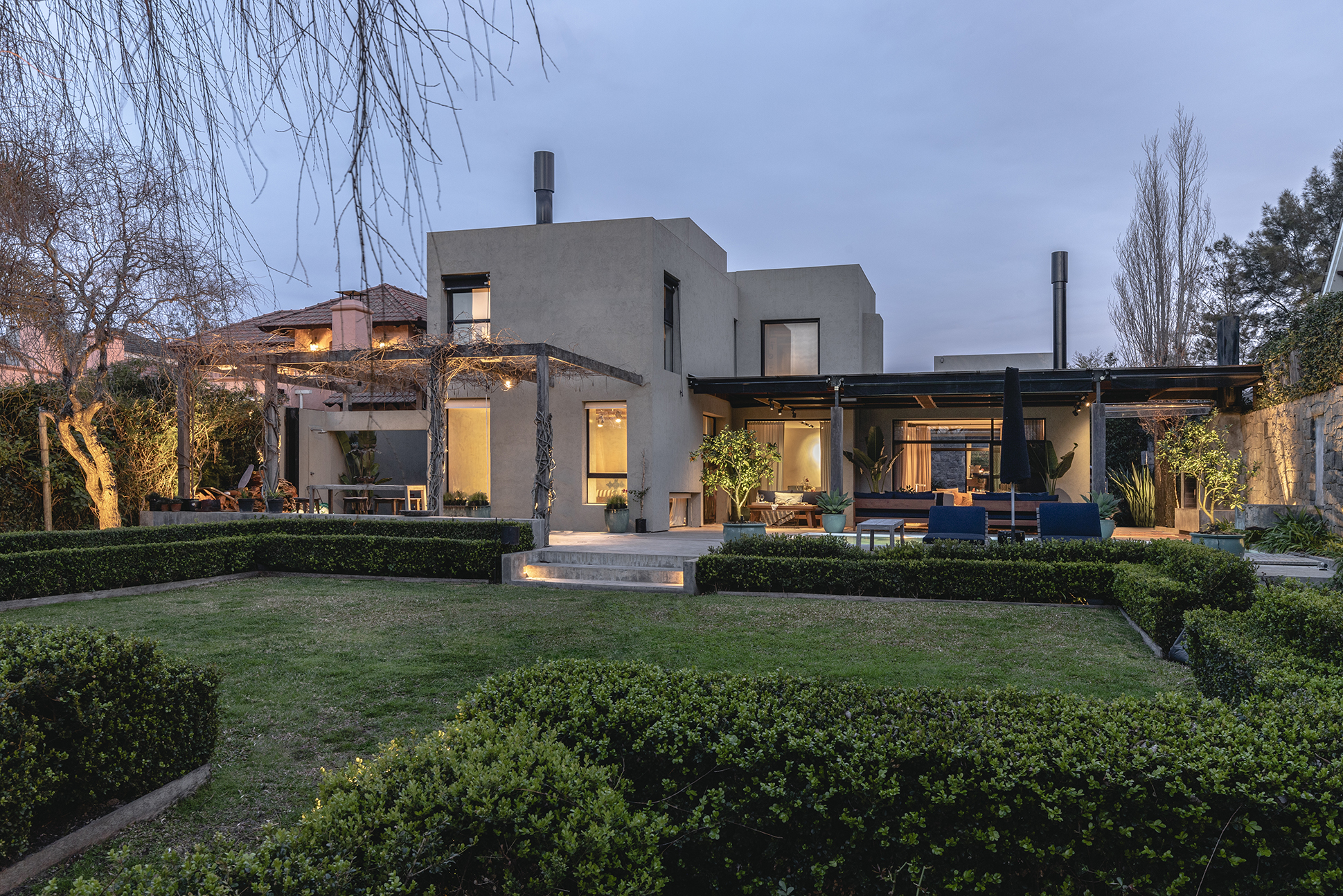 …la estrella del proyecto es el living comedor conectado a una gran galería , donde el objetivo radicaba en conectar el interior al exterior y viceversa. Por eso su equipamiento esta conformado por camastros y mesas de lapacho y neolith y toda colchonería en tela sunbrella, apta para uso exterior, todo fue diseñado a medida. El equipamiento fue concebido de manera tal que se adapta según el evento familiar o social del caso, pueden unirse o separase según convenga, y conformar diferentes núcleos. Tiene una gran pérgola techada donde el nivel del piso interior del living , el deck exterior, el espejo de agua de la piscina y del solarium, es exactamente el mismo, generando una gran amplitud , y una sensación extremadamente cálida , donde se pierden los limites del adentro y del afuera. Remata la galería una gran estufa, reforzando la idea de llevar el interior al exterior, donde el fuego es protagonista…