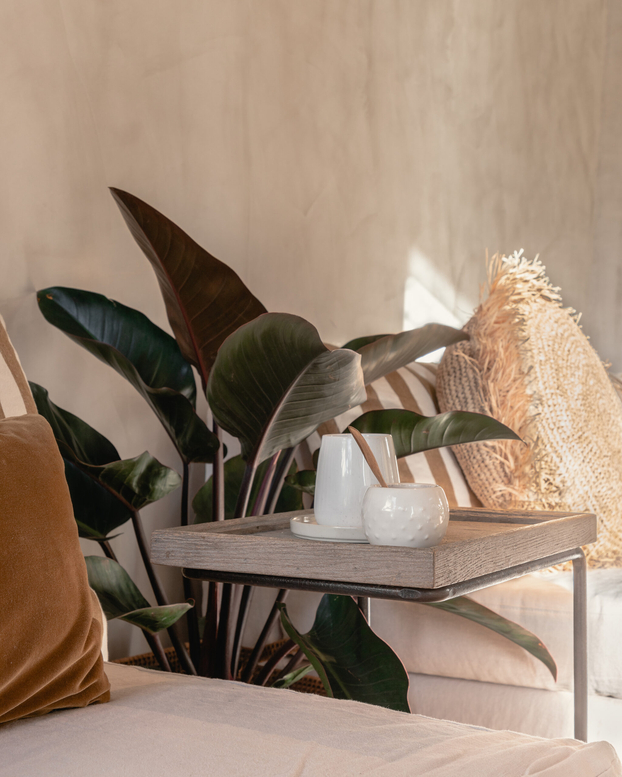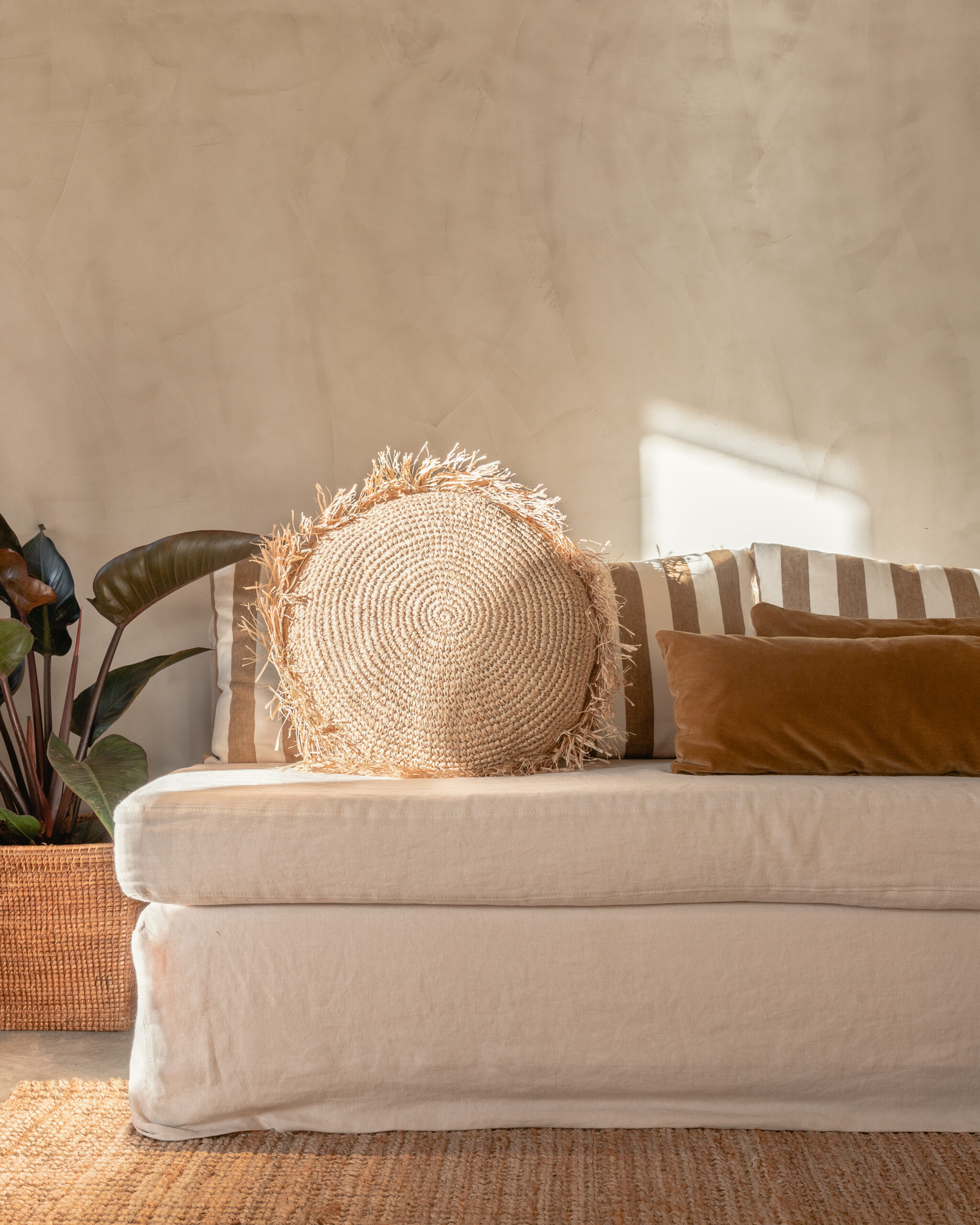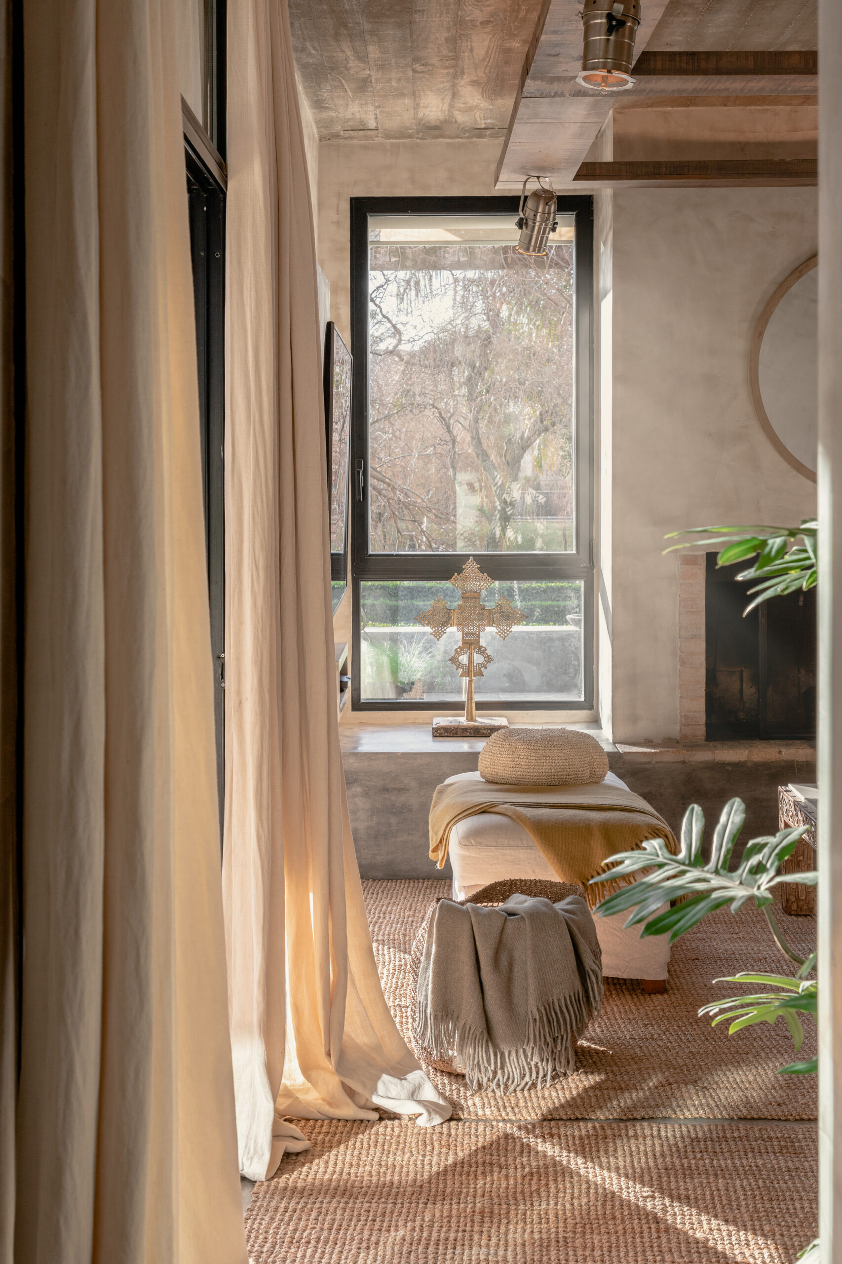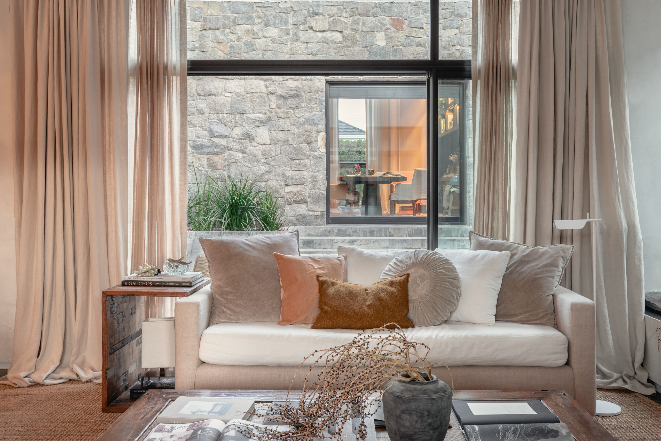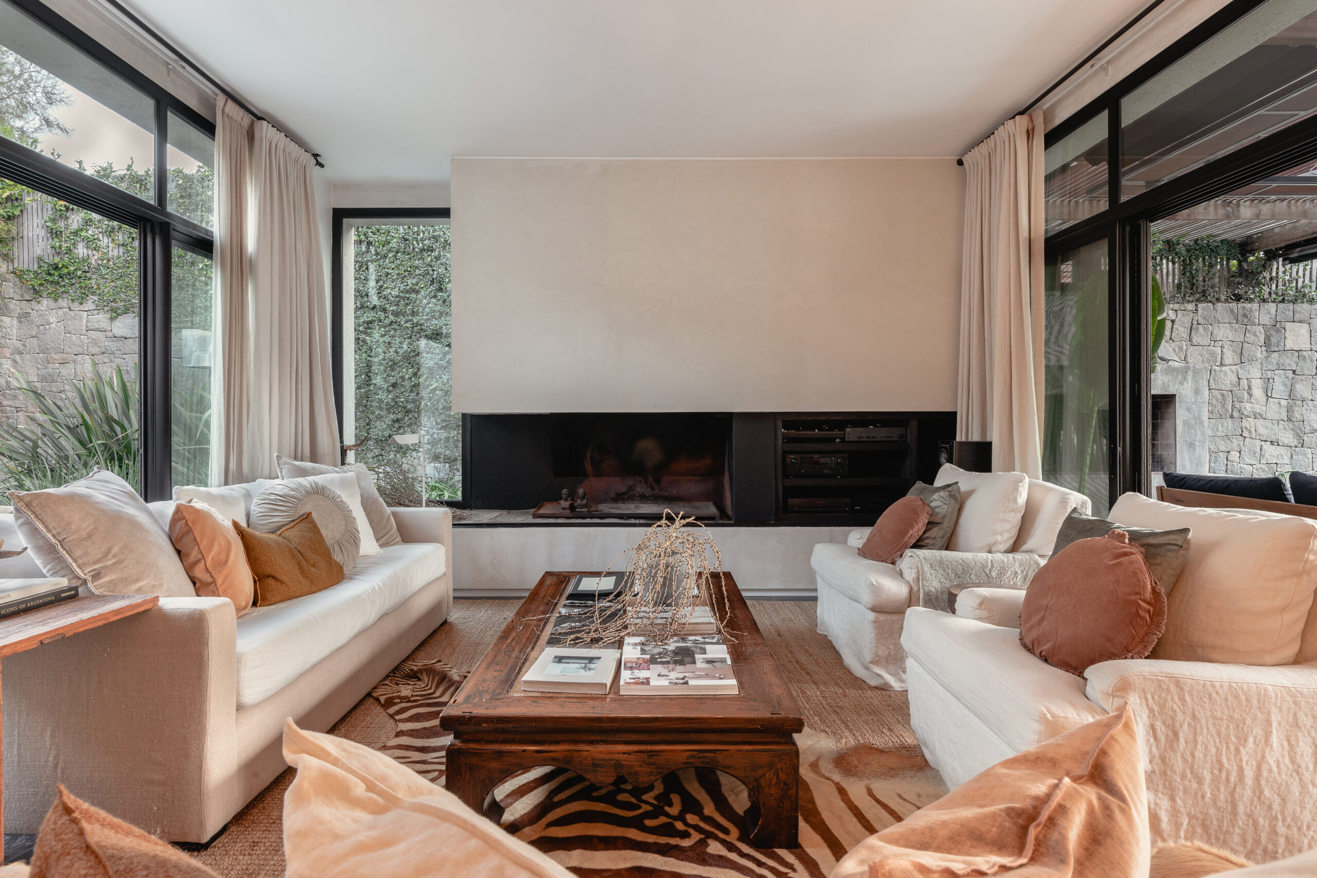 La materialidad de la casa clama sobriedad y apostó todo a la calidad constructiva. María Clara mantuvo esa línea y al momento de incorporar elementos se generó una total armonía entre caja y contenido. Piedra laja para pavimentos, madera de lapacho para los decks, piedra gris y estuco en las paredes, lino natural para las altas paredes. Para el mobiliario la diseñadora integró piezas que venían con la familia e incorporó otras que fueron diseñadas a medida, por ejemplo los sofá del estar, de líneas puras que funcionan en módulos, aportando la necesaria flexibilidad para armar distintas situaciones, al disponerlos aportan mayor espacio para contener, también pueden generar un fantástico lugar de lectura, otro de estufa y para enfrentar el centro de audio y video. Otra forma posible, cerrando el nucleo en U, coronando la estufa de leña, mas típico del invierno.
