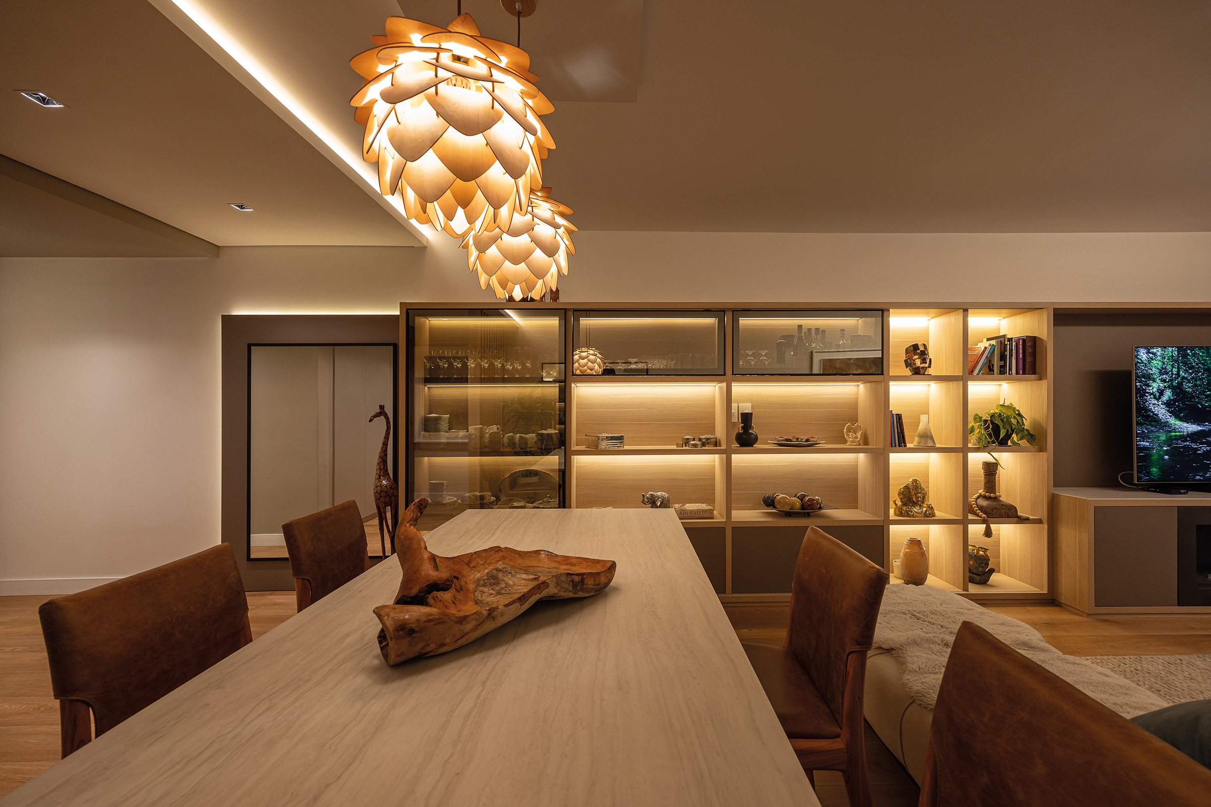 La iluminación es la narradora invisible de este relato. Lámparas colgantes de formas orgánicas evocan hojas y piedras, y su luz ambiental realza tanto la perfección técnica de la mesa TESLA y el ARTIKO 7500 como los detalles artesanales de las sillas o los empapelados de fibra. La iluminación indirecta en estanterías, molduras y componibles dibuja planos y volúmenes, convirtiendo cada rincón en un escenario donde la mirada, la mano y el cuerpo participan de la narrativa.