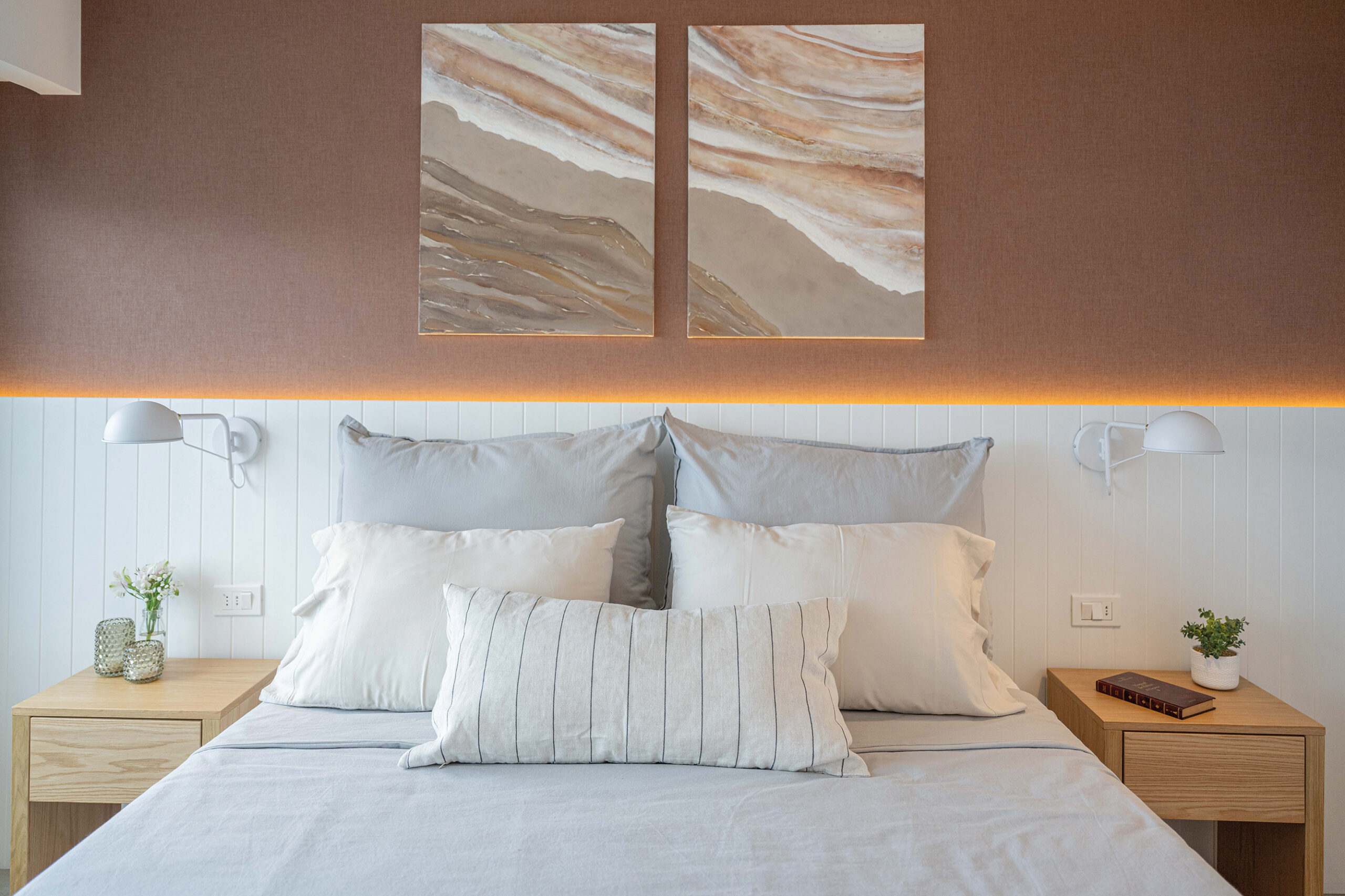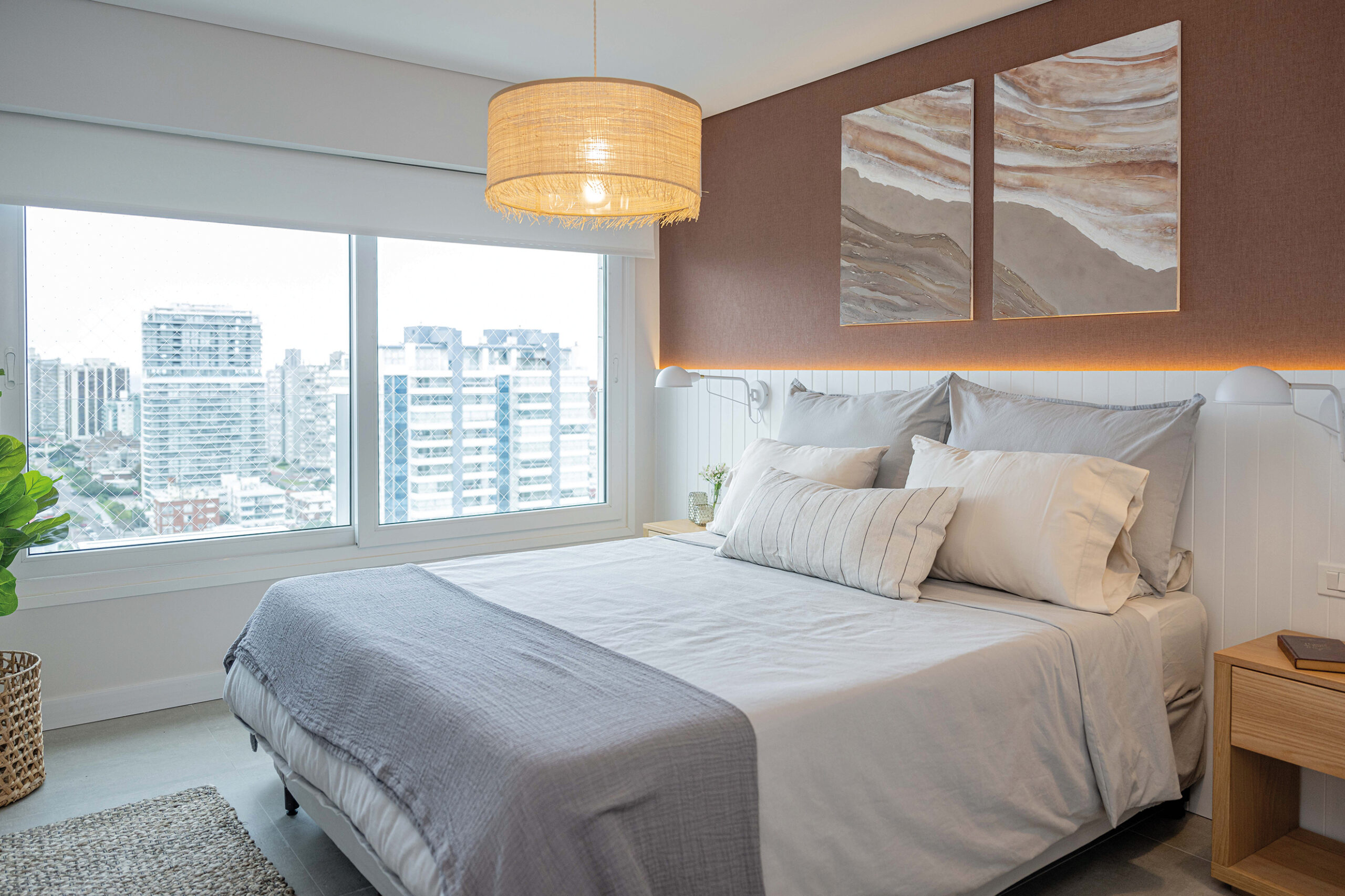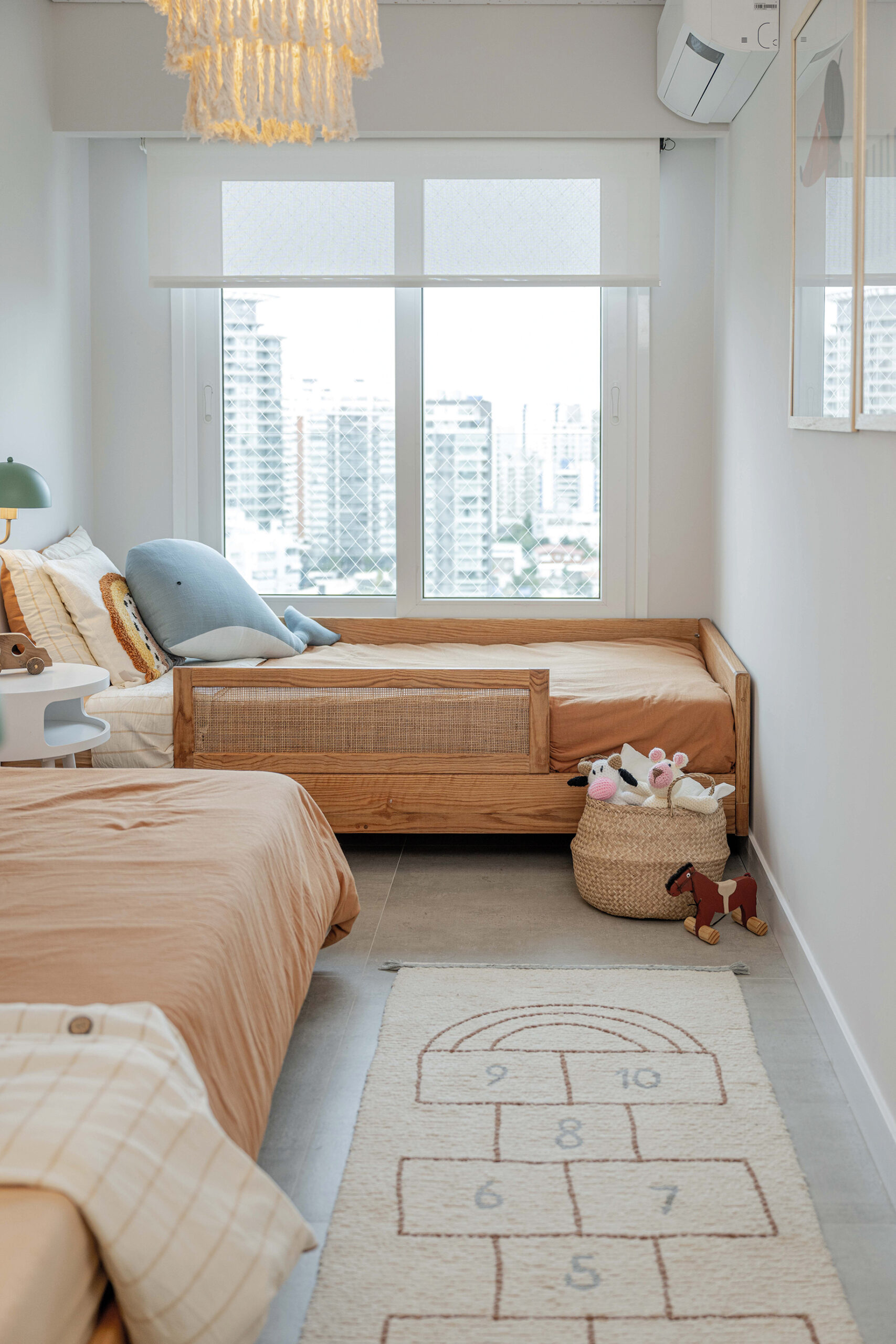 Cada uno de los dormitorios tiene su personalidad: en la suite principal, la elección de tonos crudos realza un respaldo de cuero camel de gran presencia, en perfecta combinación con un escritorio de madera y cajones con detalles de esterilla y tiradores dorados, que se prolongan hacia el vestidor. En el dormitorio de invitados, un respaldo blanco ranurado de pared a pared, acompañado de iluminación lineal, proporciona una atmósfera íntima y destaca un empapelado en tonos bordeaux, armonizado con pinturas de Malena López que evocan la serenidad del mar. El cuarto infantil es quizás el más encantador; allí, un empapelado de estrellitas en el techo y una paleta de tierra y tonos pasteles crean un ambiente juguetón y dulce, logrando integrar el diseño del apartamento sin perder la inocencia.