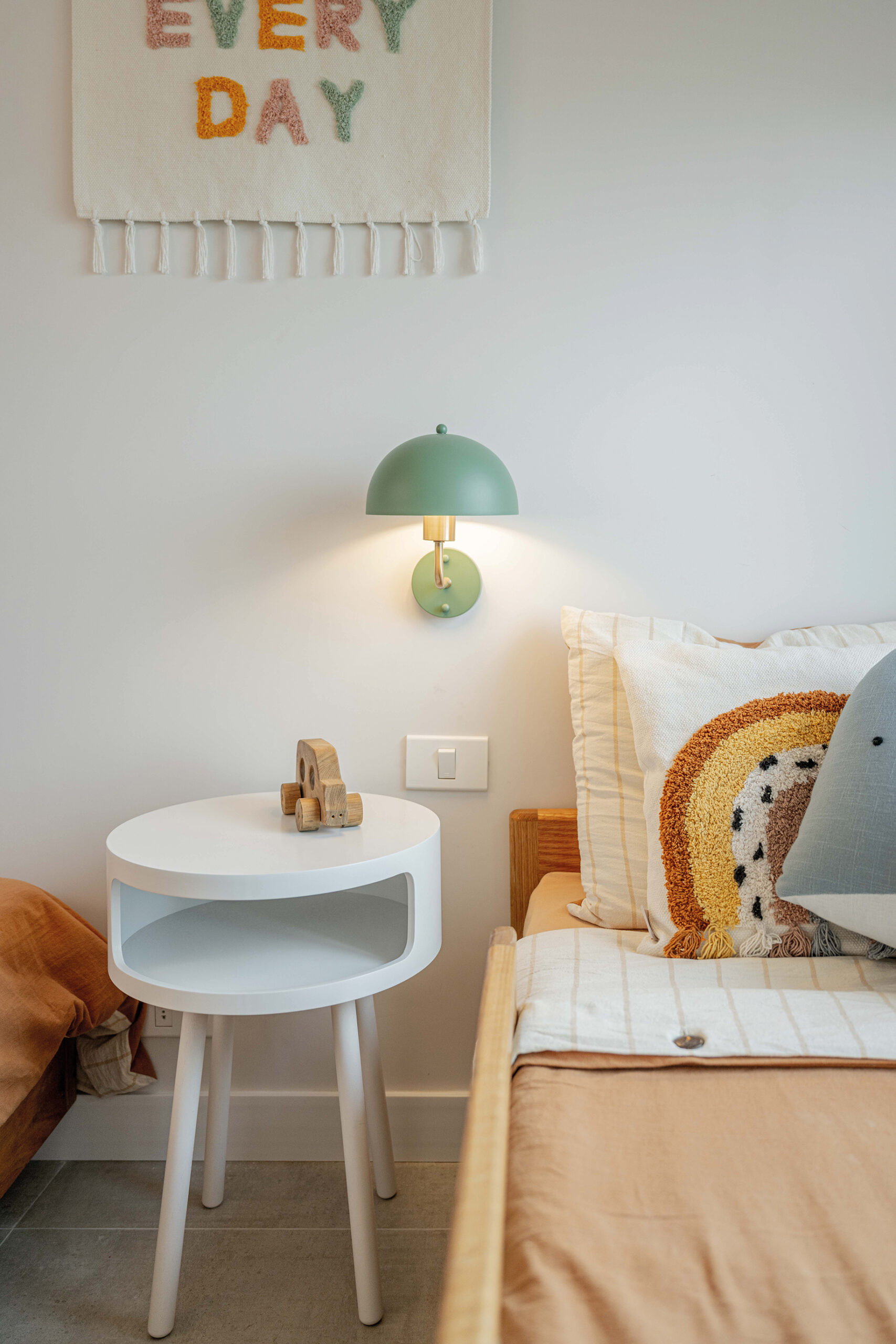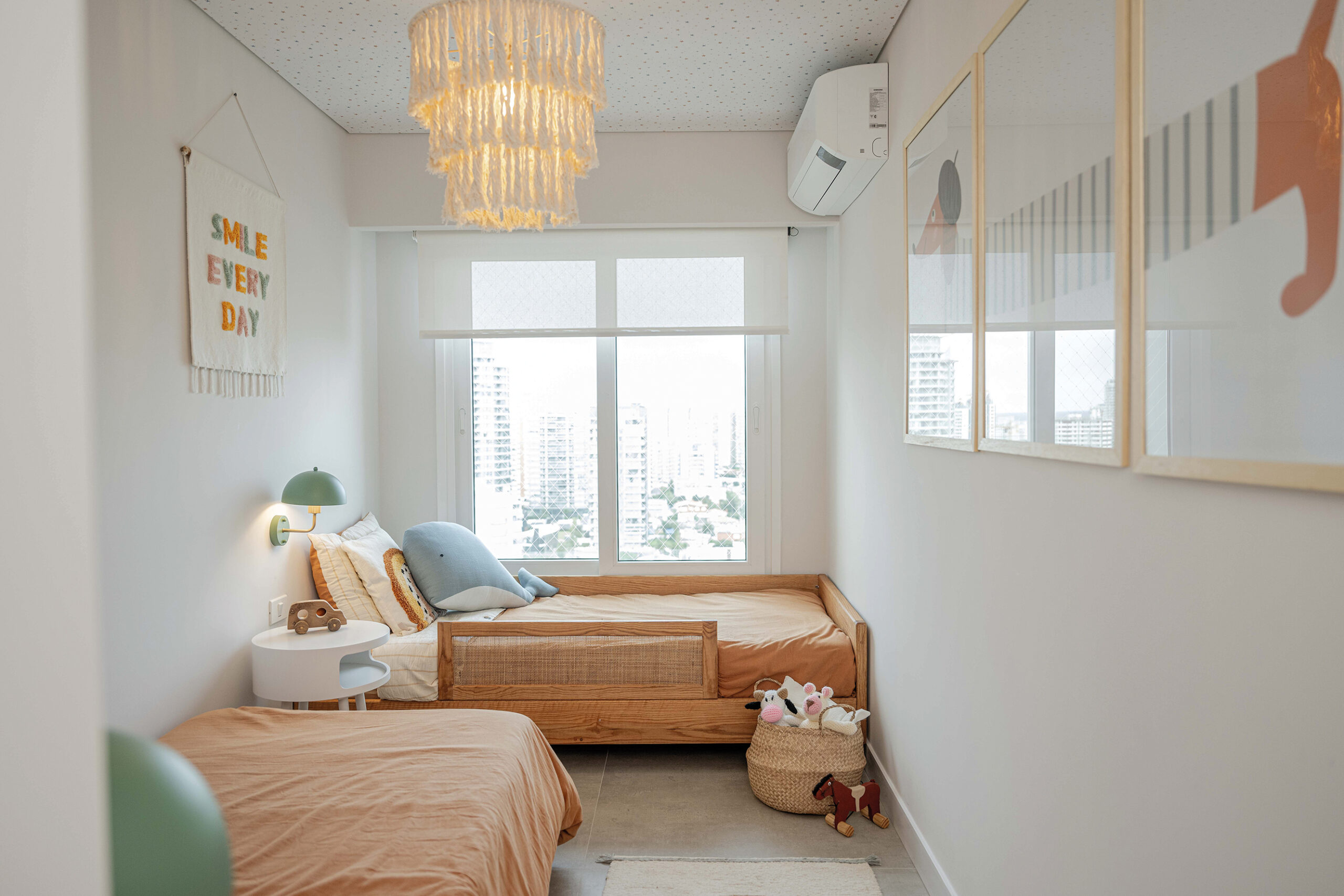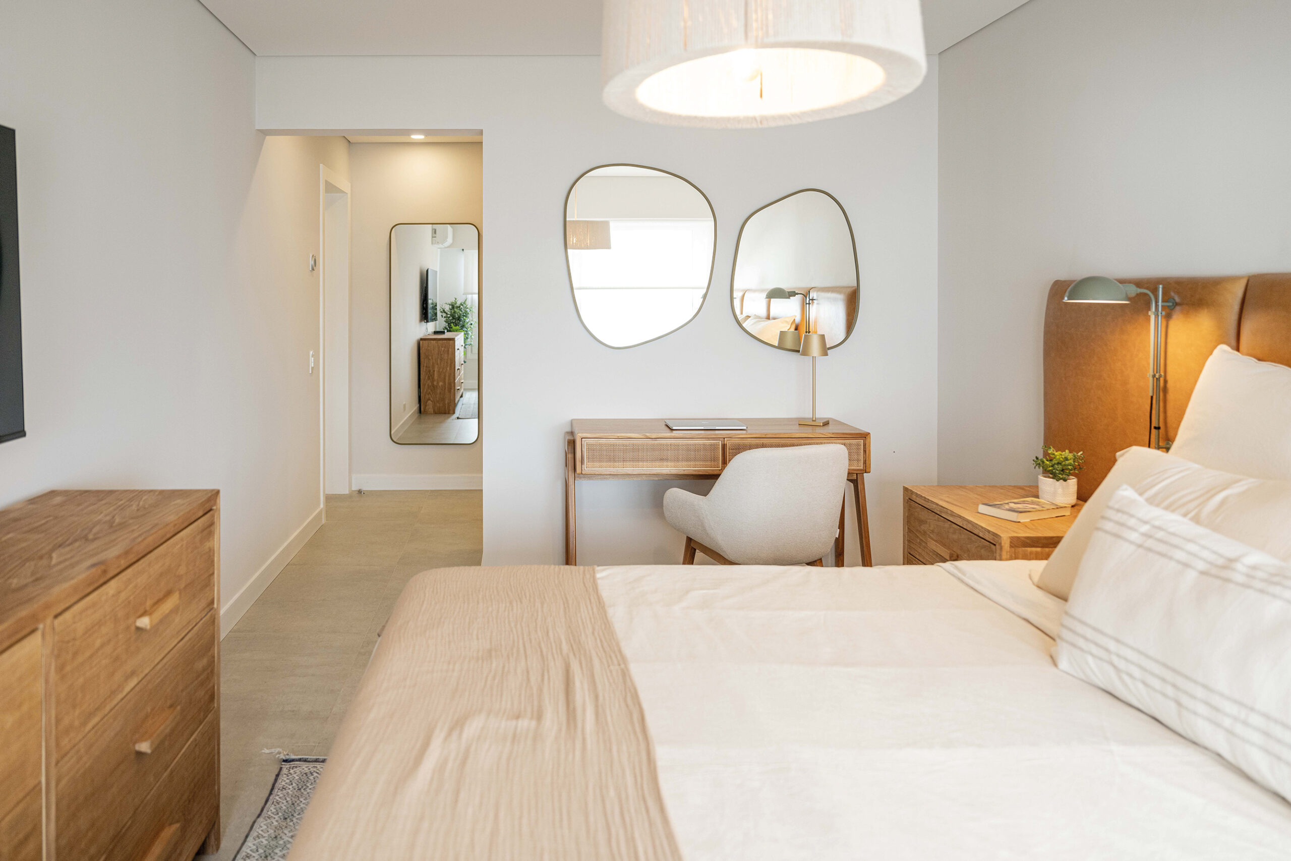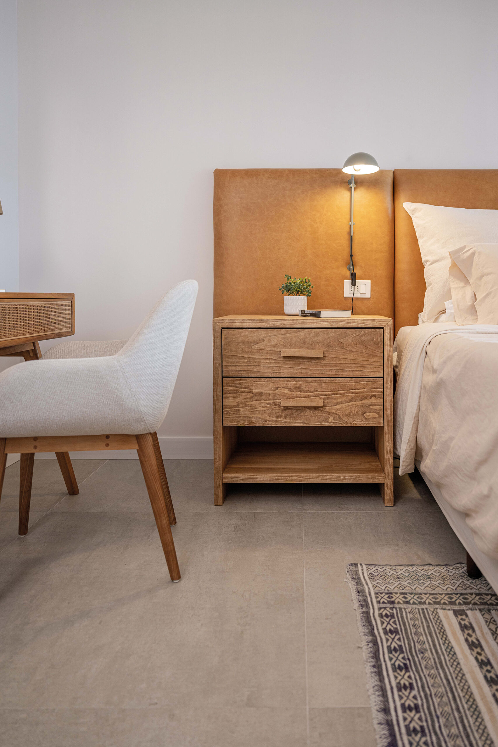 Cada uno de los dormitorios tiene su personalidad: en la suite principal, la elección de tonos crudos realza un respaldo de cuero camel de gran presencia, en perfecta combinación con un escritorio de madera y cajones con detalles de esterilla y tiradores dorados, que se prolongan hacia el vestidor. En el dormitorio de invitados, un respaldo blanco ranurado de pared a pared, acompañado de iluminación lineal, proporciona una atmósfera íntima y destaca un empapelado en tonos bordeaux, armonizado con pinturas de Malena López que evocan la serenidad del mar. El cuarto infantil es quizás el más encantador; allí, un empapelado de estrellitas en el techo y una paleta de tierra y tonos pasteles crean un ambiente juguetón y dulce, logrando integrar el diseño del apartamento sin perder la inocencia.