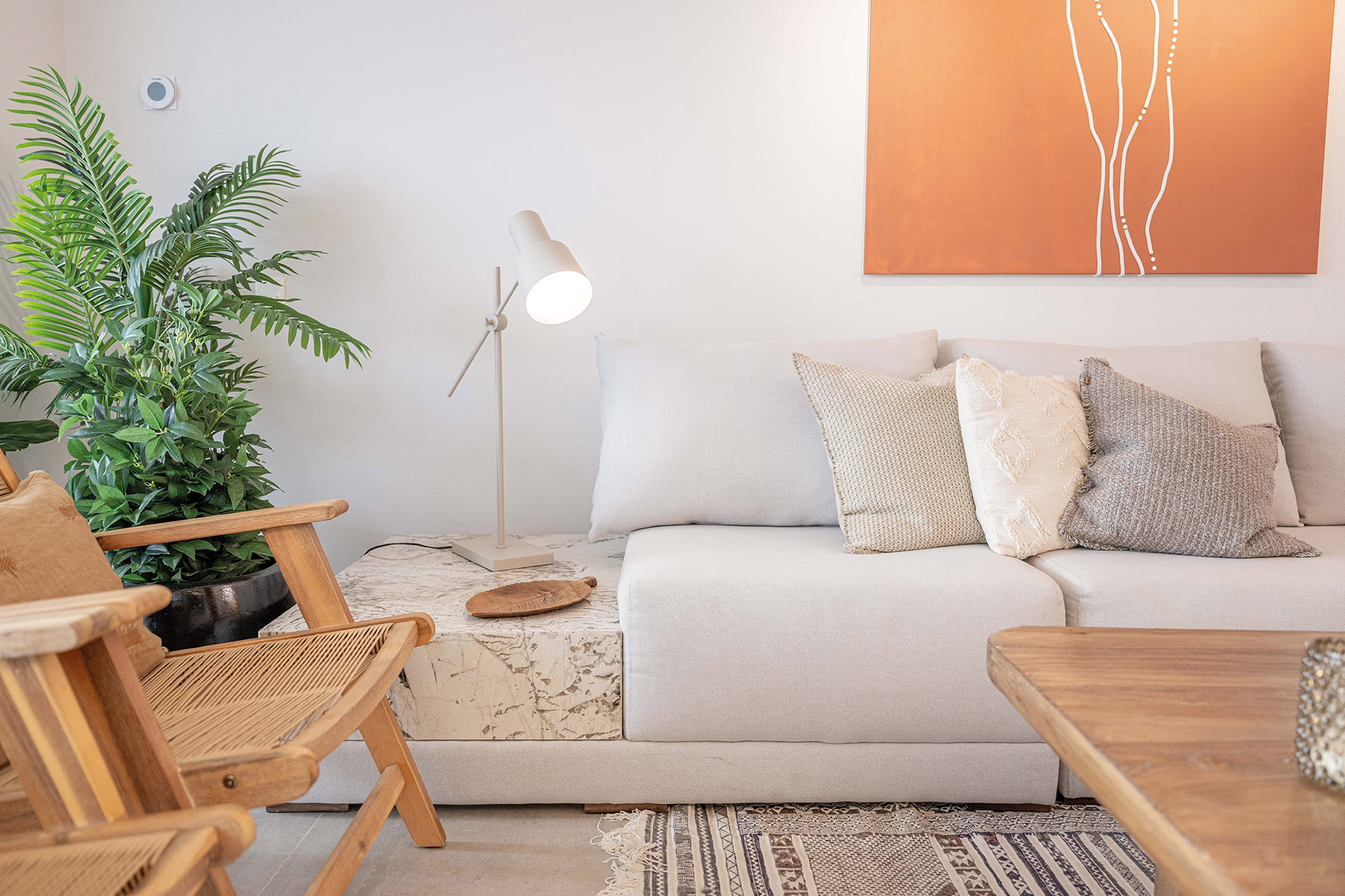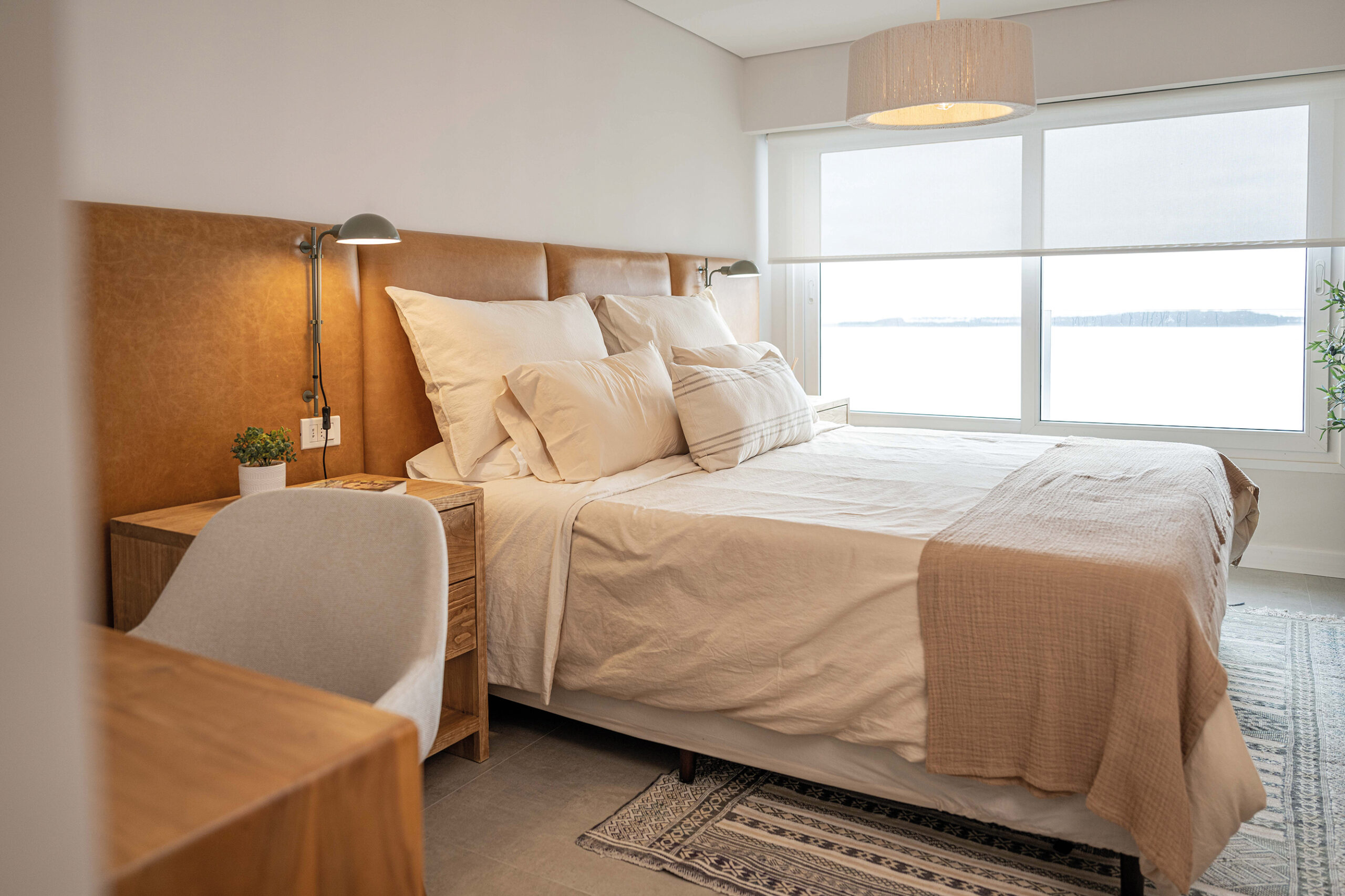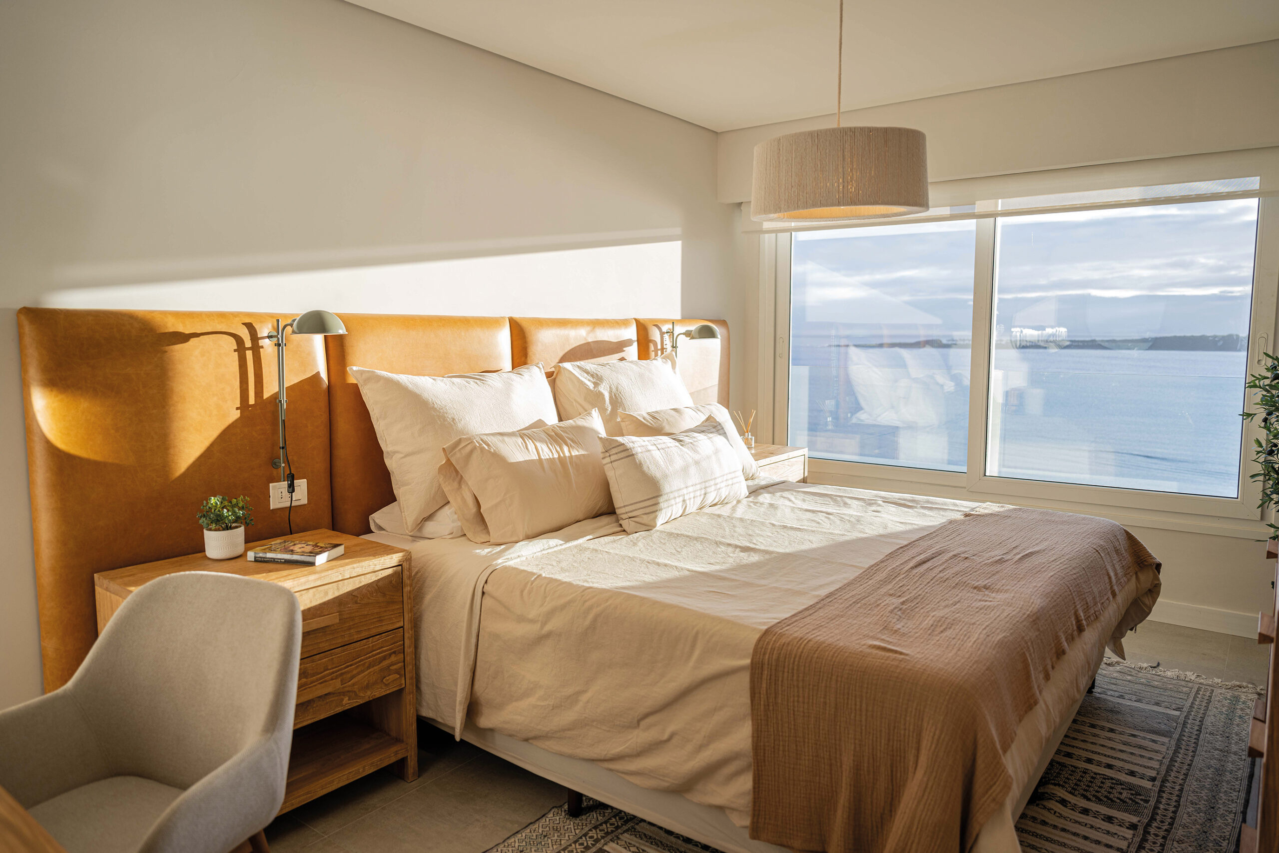 El proyecto de Valentina Cancela procura la conexión con la naturaleza y el descanso, apelando a una paleta de materiales nobles—madera, granito, piedra—en combinación con tonos neutros y texturas orgánicas. Cada elección refleja un sentido de calma y sofisticación, creando un ambiente que es tanto acogedor como atemporal. La distribución redefine las posibilidades espaciales del apartamento, y el mayor acierto es sin duda la integración de la terraza al cuarto de estar, nivelando el pavimento para que el exterior y el interior dialoguen en perfecta armonía. Este detalle no solo amplía el espacio, sino que proporciona una vista ininterrumpida de los legendarios atardeceres de Punta del Este.