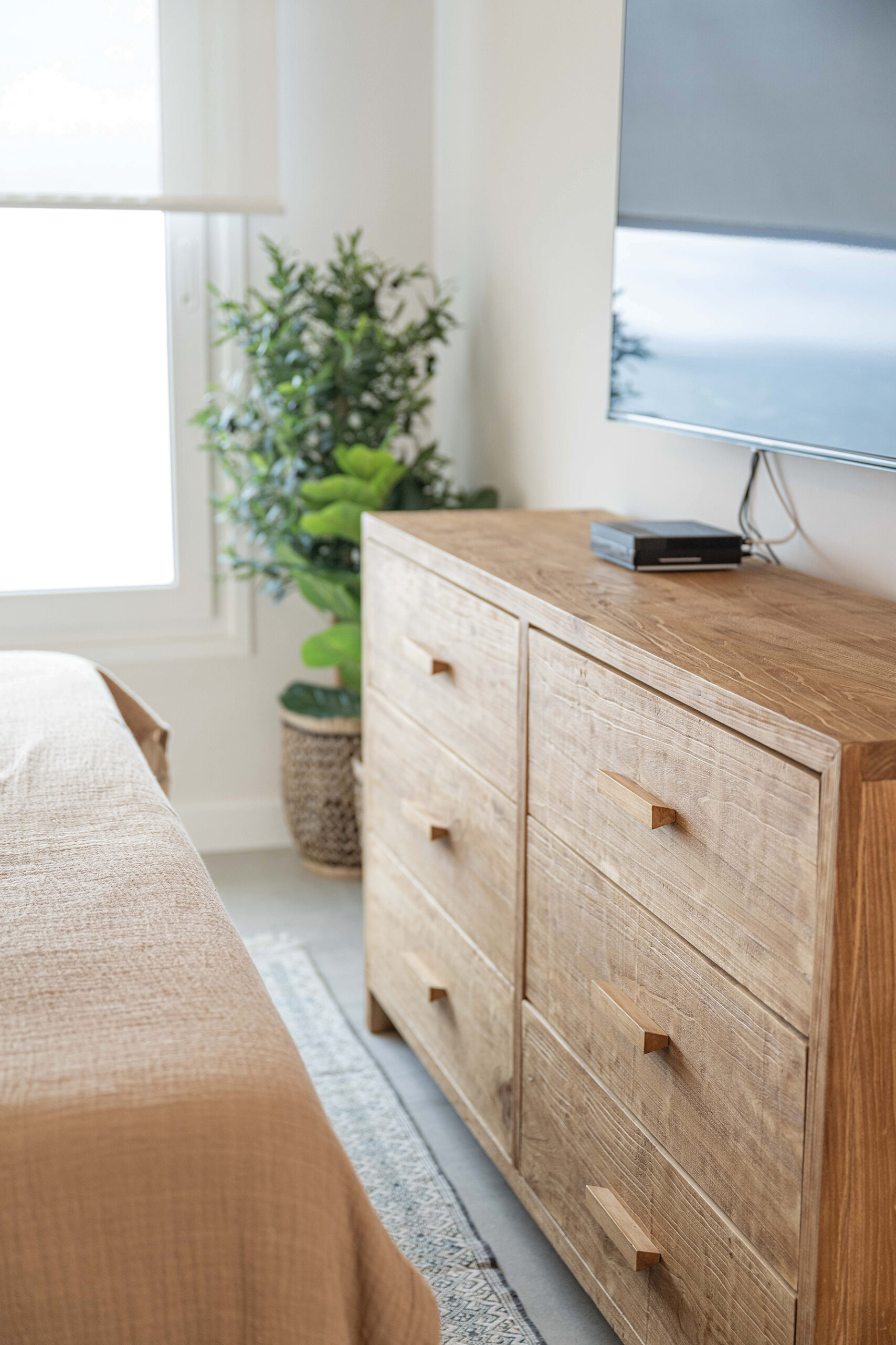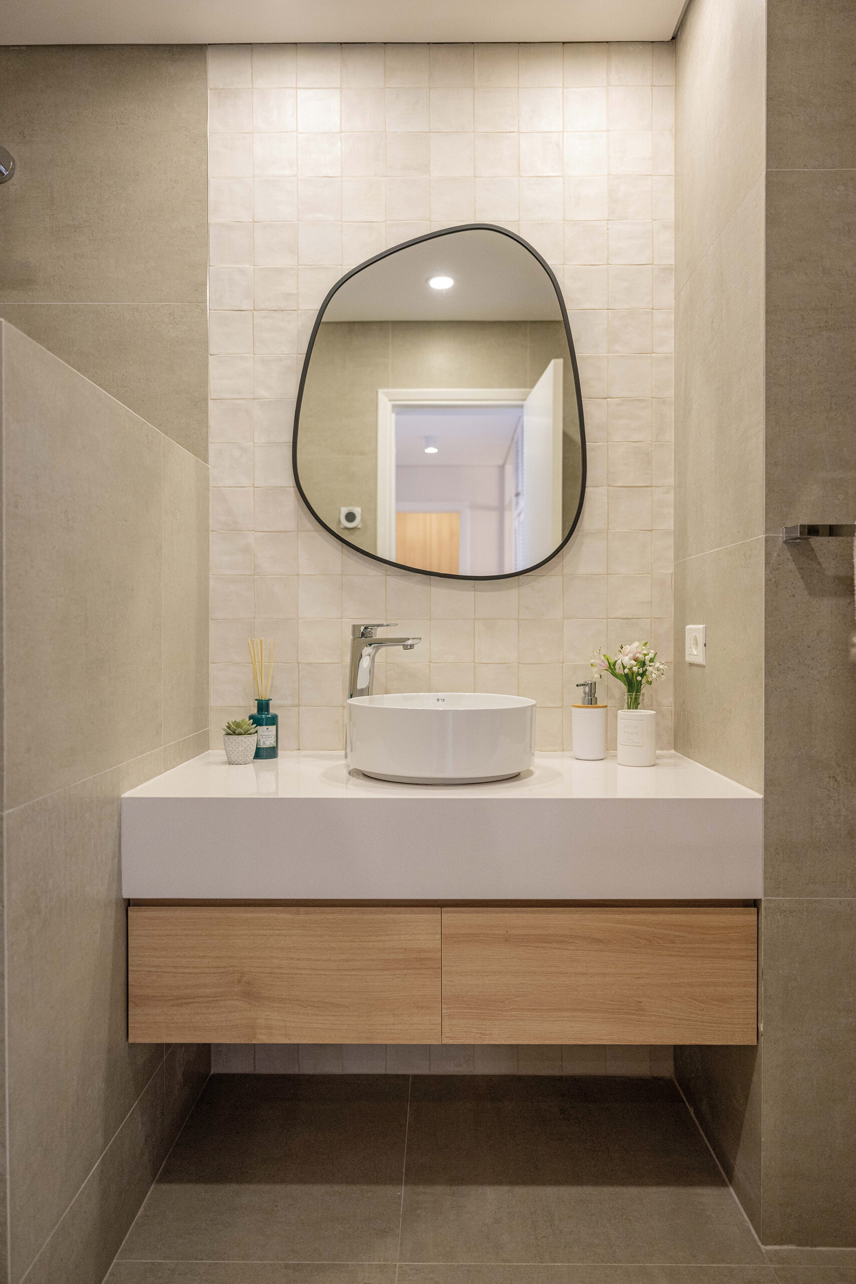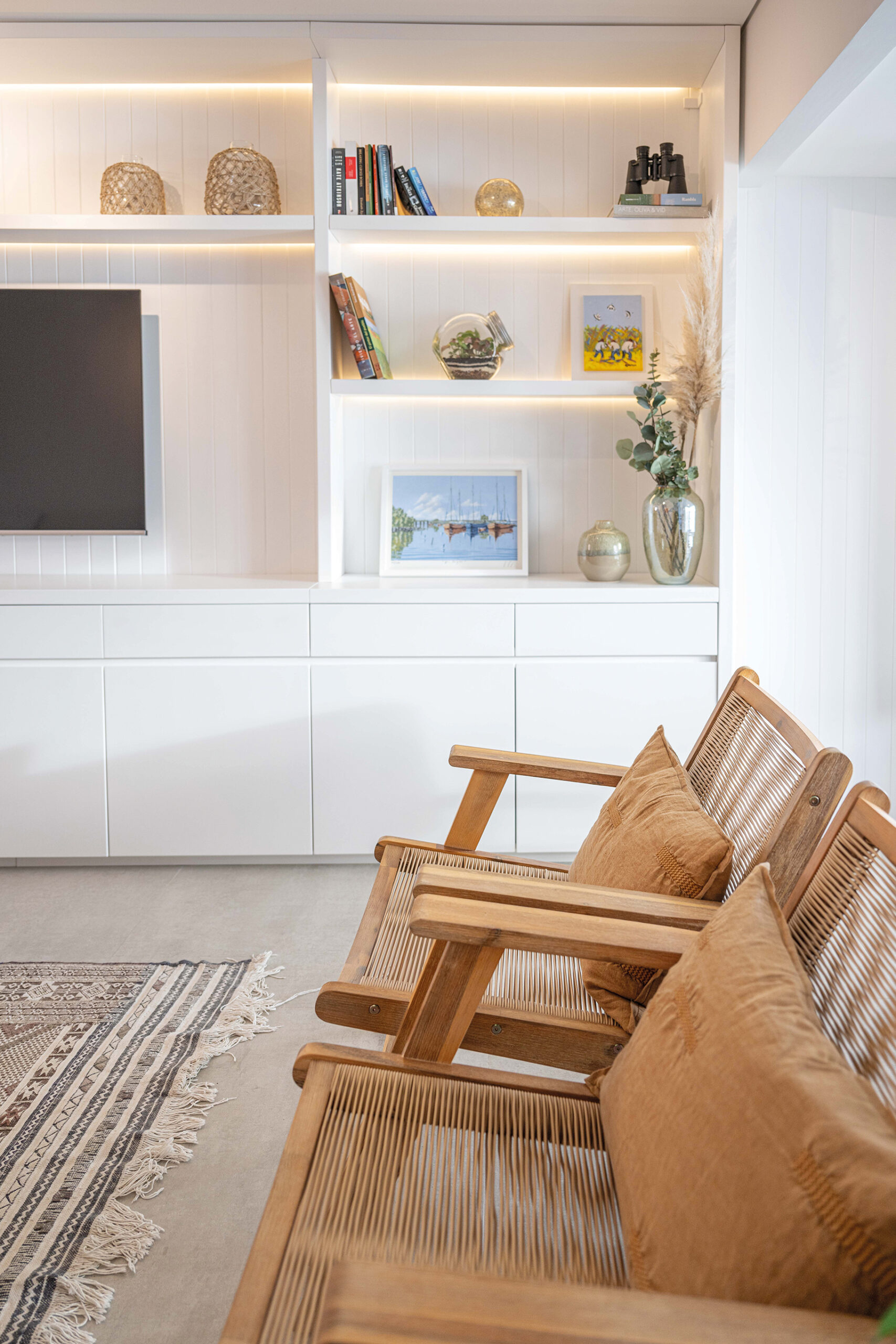 El proyecto de Valentina Cancela procura la conexión con la naturaleza y el descanso, apelando a una paleta de materiales nobles—madera, granito, piedra—en combinación con tonos neutros y texturas orgánicas. Cada elección refleja un sentido de calma y sofisticación, creando un ambiente que es tanto acogedor como atemporal. La distribución redefine las posibilidades espaciales del apartamento, y el mayor acierto es sin duda la integración de la terraza al cuarto de estar, nivelando el pavimento para que el exterior y el interior dialoguen en perfecta armonía. Este detalle no solo amplía el espacio, sino que proporciona una vista ininterrumpida de los legendarios atardeceres de Punta del Este.