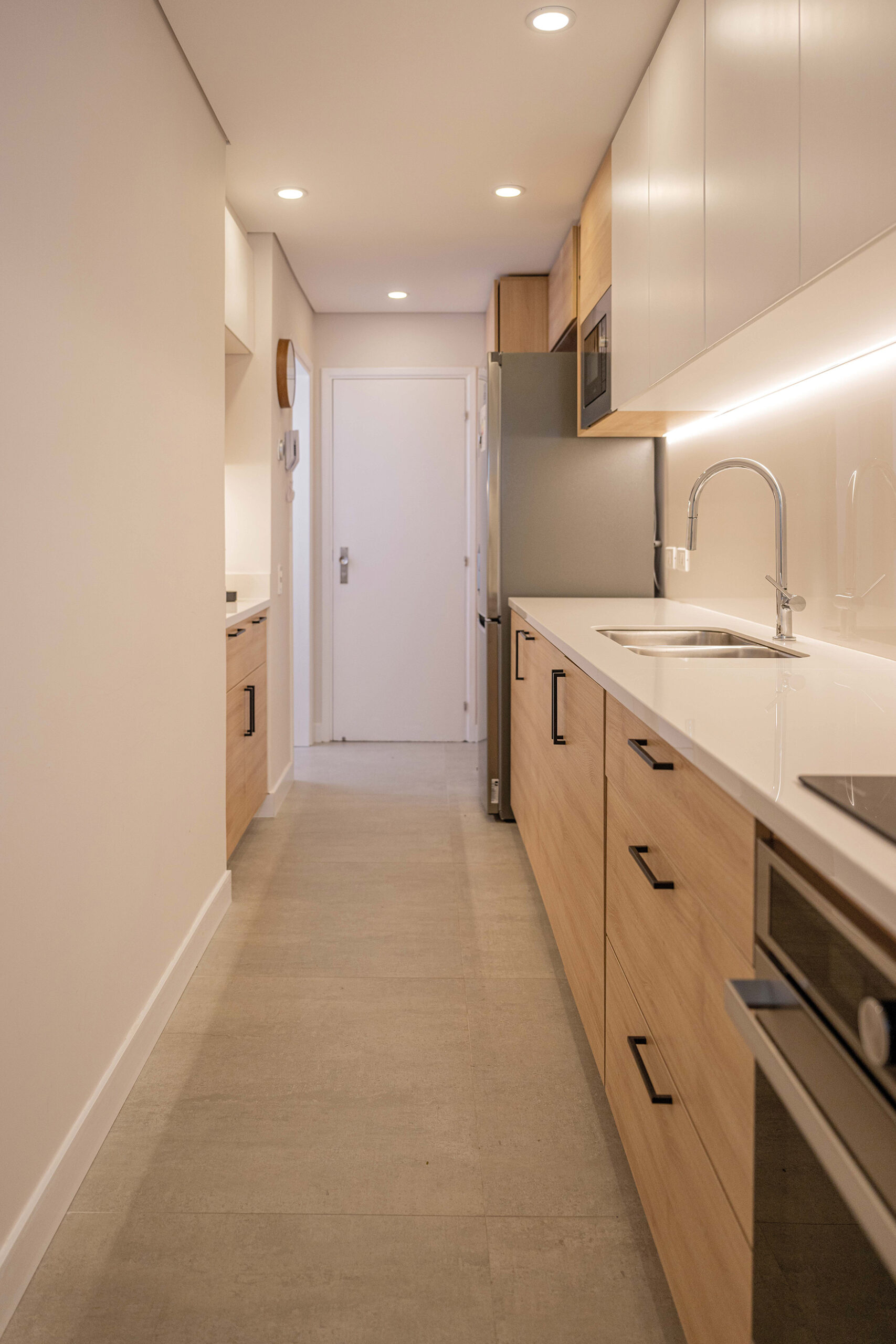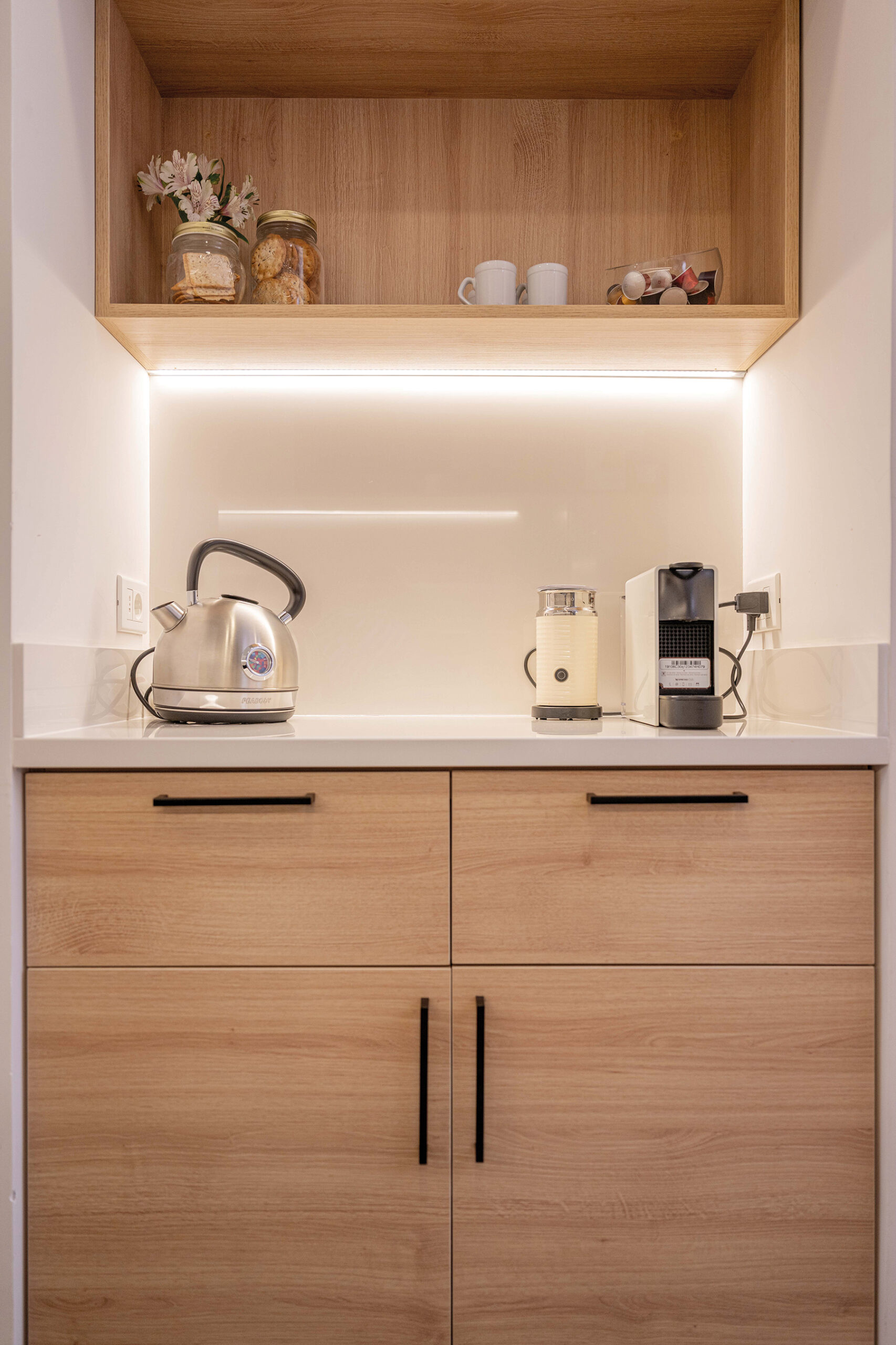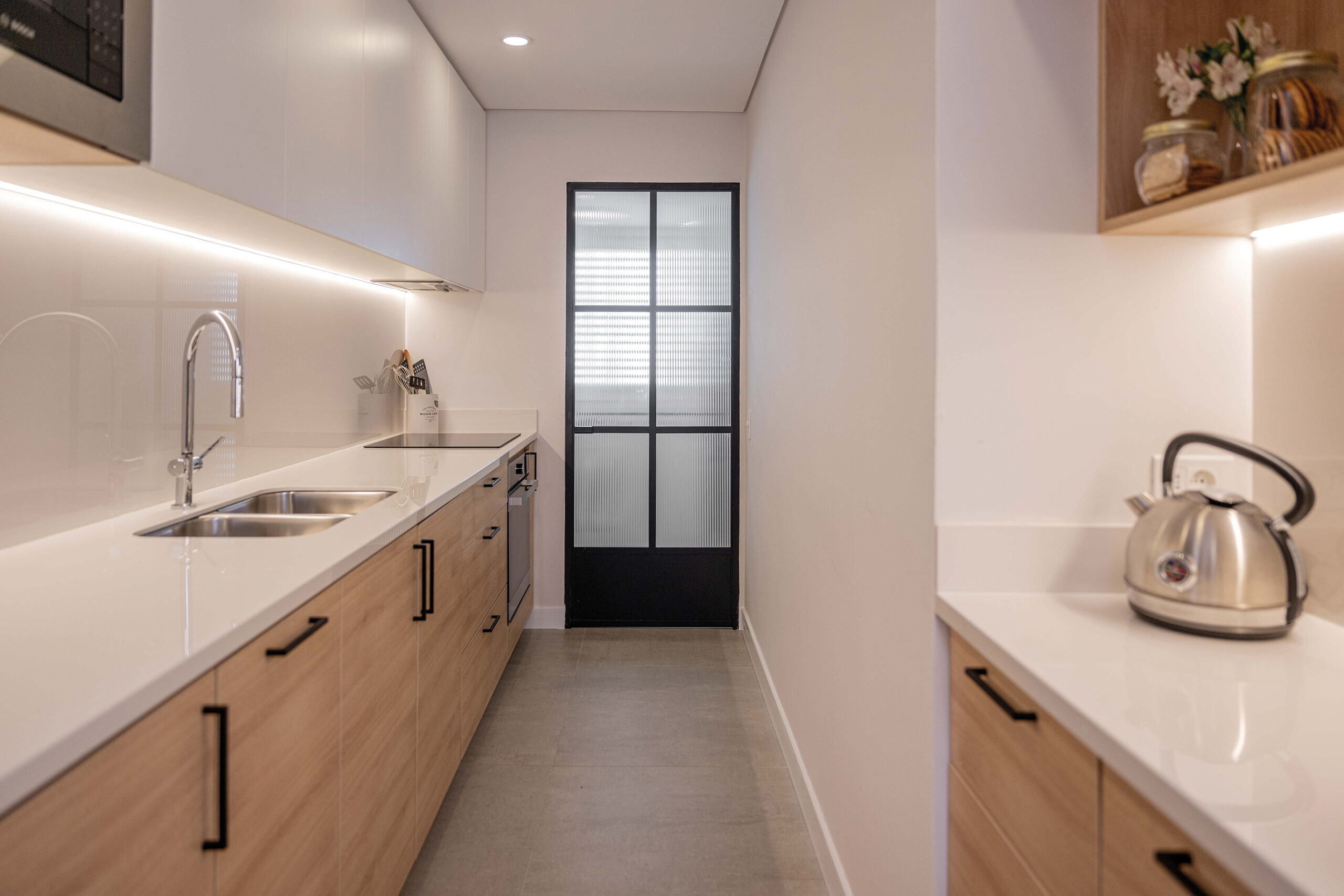 Luego la cocina y el lavadero representan la fusión de funcionalidad y estética: un nuevo cielorraso permite una iluminación estratégica, mientras una puerta de hierro con vidrios acanalados separa el lavadero, permitiendo la entrada de luz natural sin sacrificar elegancia. Los electrodomésticos integrados refuerzan la presencia de la madera, y un coffee point cuidadosamente diseñado añade un toque de lujo que los habitantes pueden disfrutar a diario.
