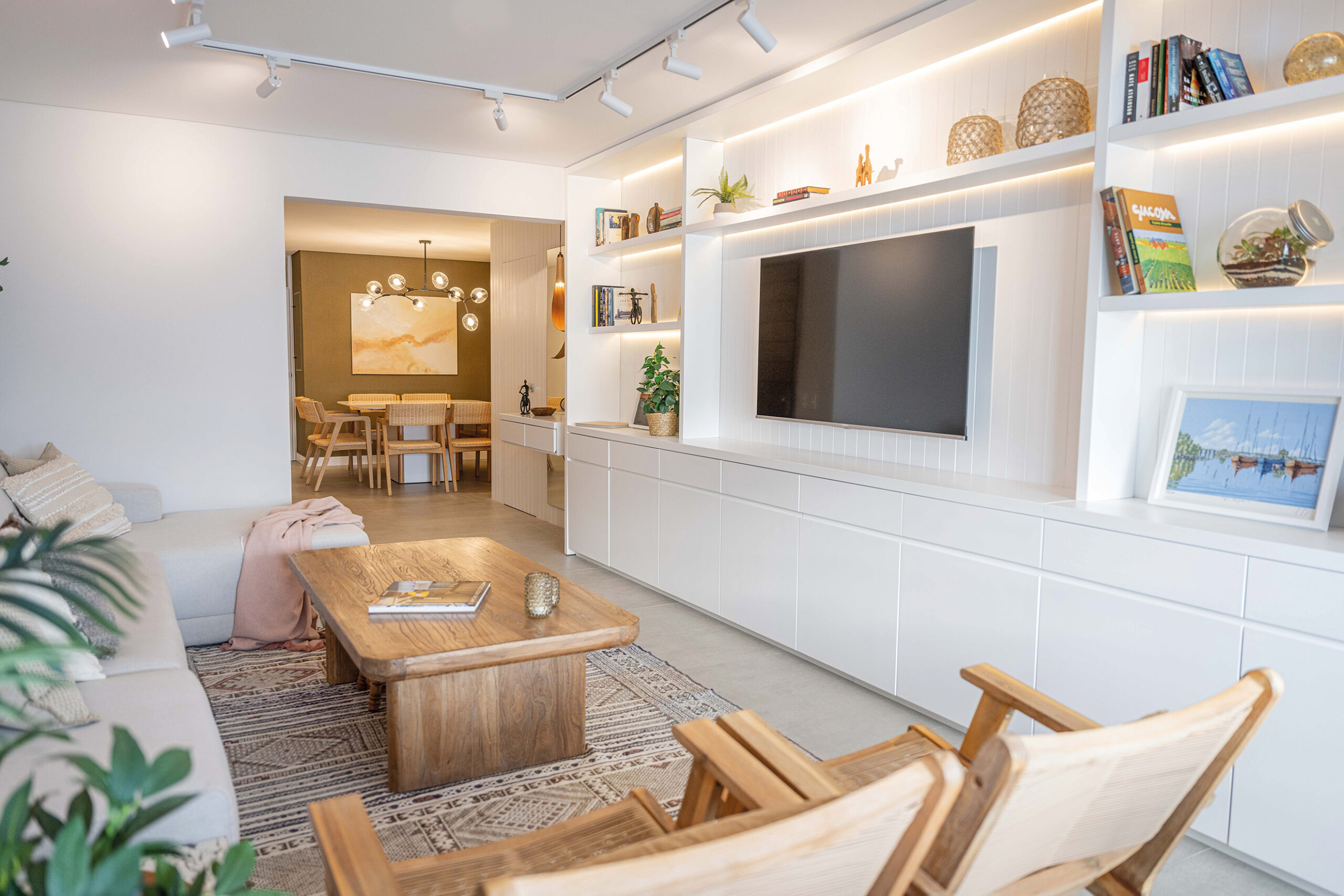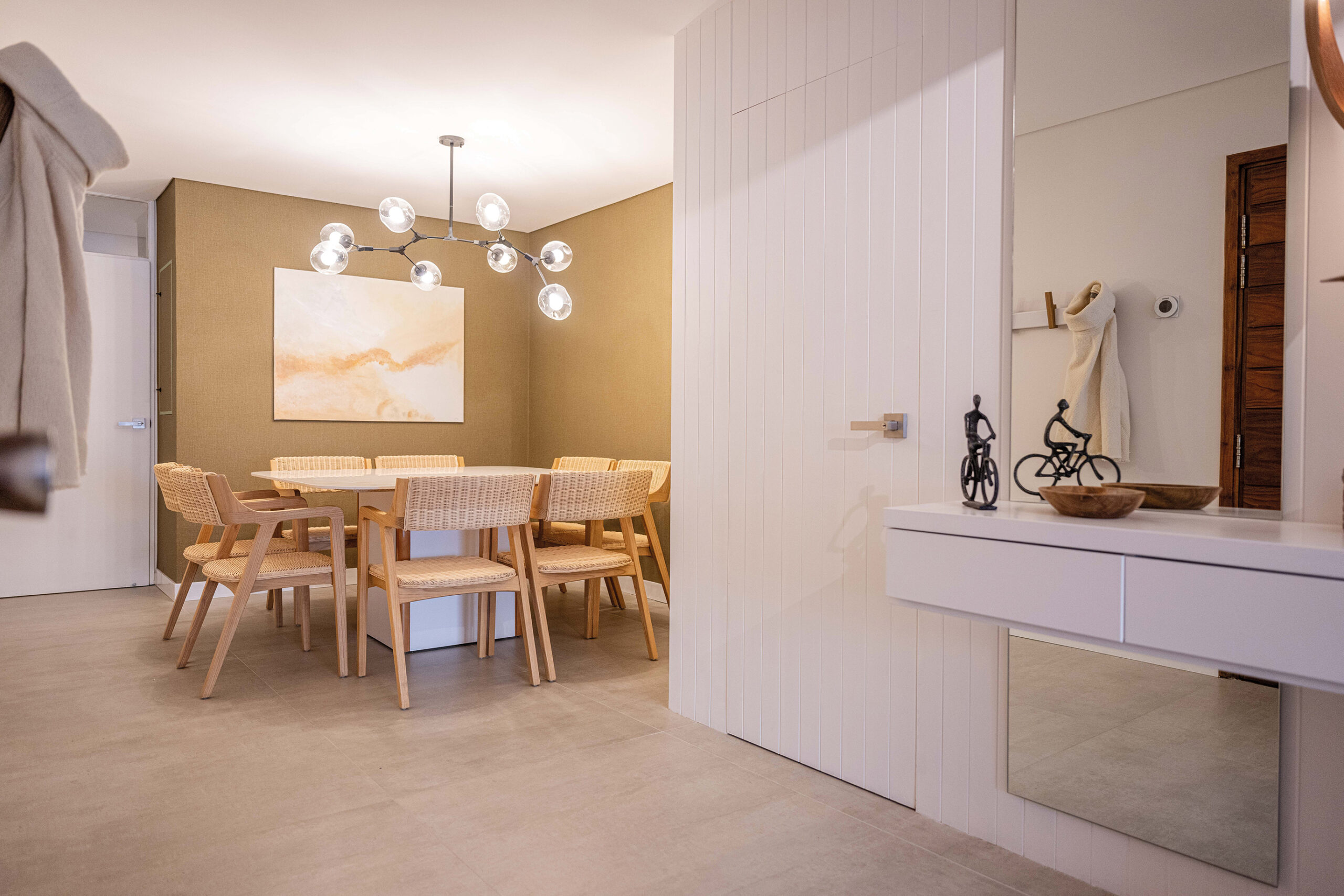 Para el área de estar y comedor, Valentina se apoyó en un revestimiento de madera blanca que envuelve el ambiente, aportando continuidad visual y calidez. Este detalle no solo enfatiza la espacialidad, sino que oculta con ingenio la puerta del dormitorio principal, garantizando privacidad y creando un recibidor de bienvenida. El comedor, acentuado por un elegante empapelado verde seco y una mesa construida en dekton, añade un contraste exquisito que rompe la monocromía neutra con un toque de sofisticación sutil.