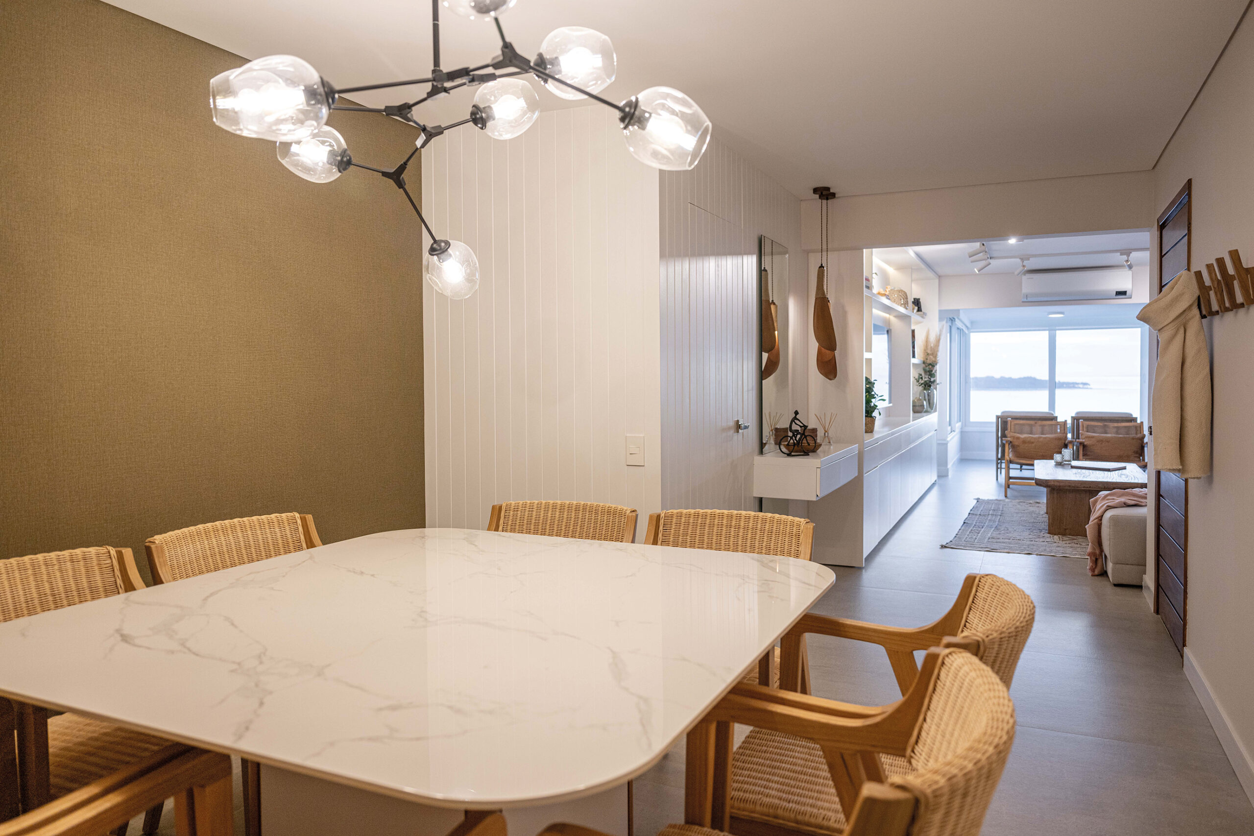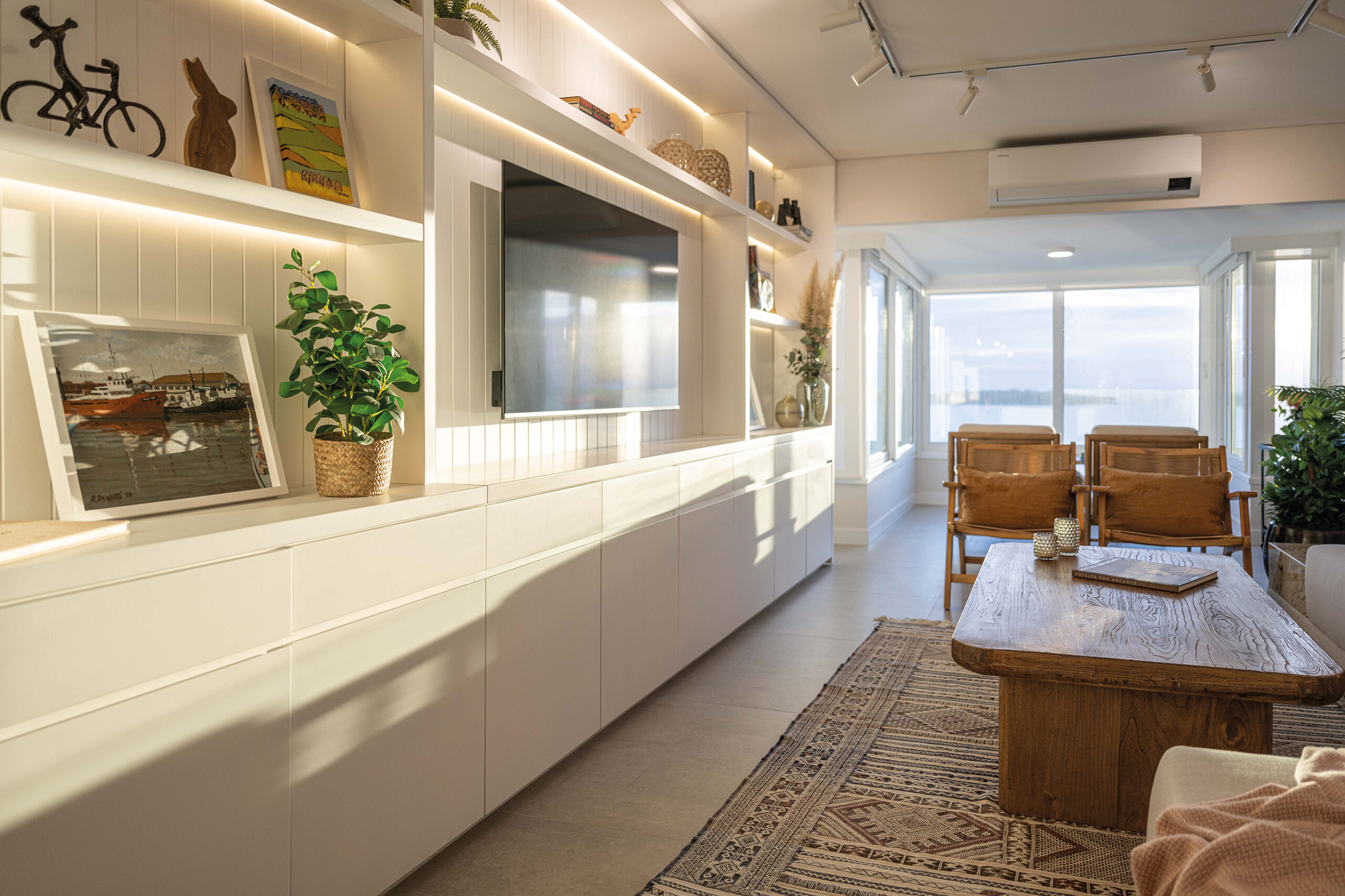 Ubicado en la codiciada primera línea de Playa Mansa, este apartamento en Punta del Este ha sido transformado en un refugio moderno y sofisticado que supera los límites de un simple rediseño. Es una obra en la que el interiorismo y la arquitectura conviven para crear una experiencia de habitabilidad sin igual. El desafío inicial para Valentina Cancela fue ambicioso: actualizar un espacio con historia una de las unidades del icónico Malecón de la Mansa, redefiniendo tanto su funcionalidad como su estética. La intervención arquitectónica fue exhaustiva, con la renovación de todas las aberturas, la instalación de losa radiante y una actualización integral de los sistemas eléctricos y sanitarios, lo que marca un verdadero renacer para el apartamento.