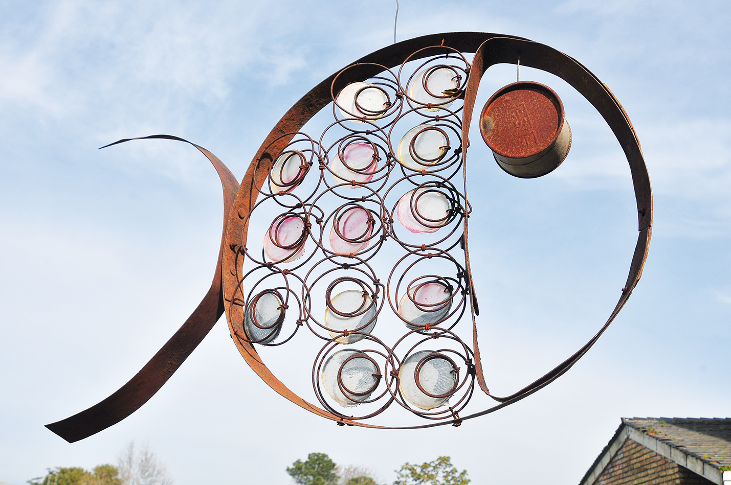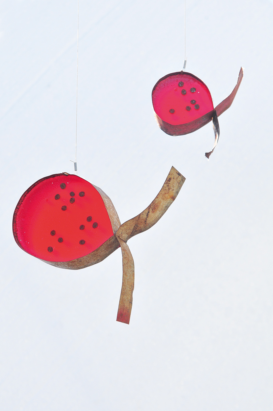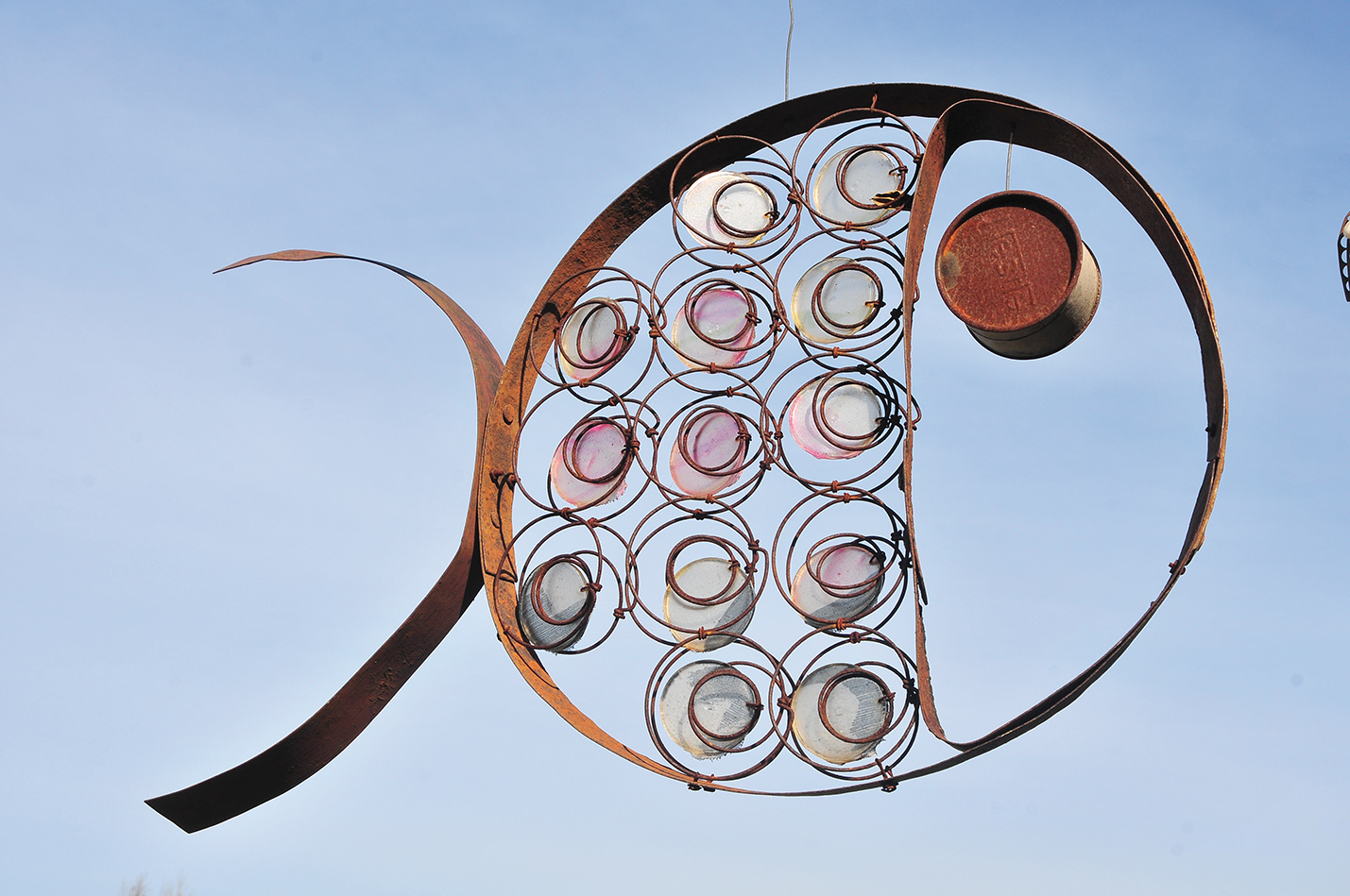 Los peces flotando en hilera y moviéndose al ritmo del viento producían un efecto mágico en la tarde soleada y no pudimos concentrarnos en ese momento en averiguar si las creaciones de Carolina eran o no esculturas. ¿Importaba el nombre? No en ese momento. Sin embargo, al día siguiente recibo por mensaje la siguiente definición: