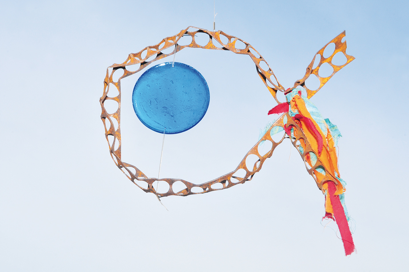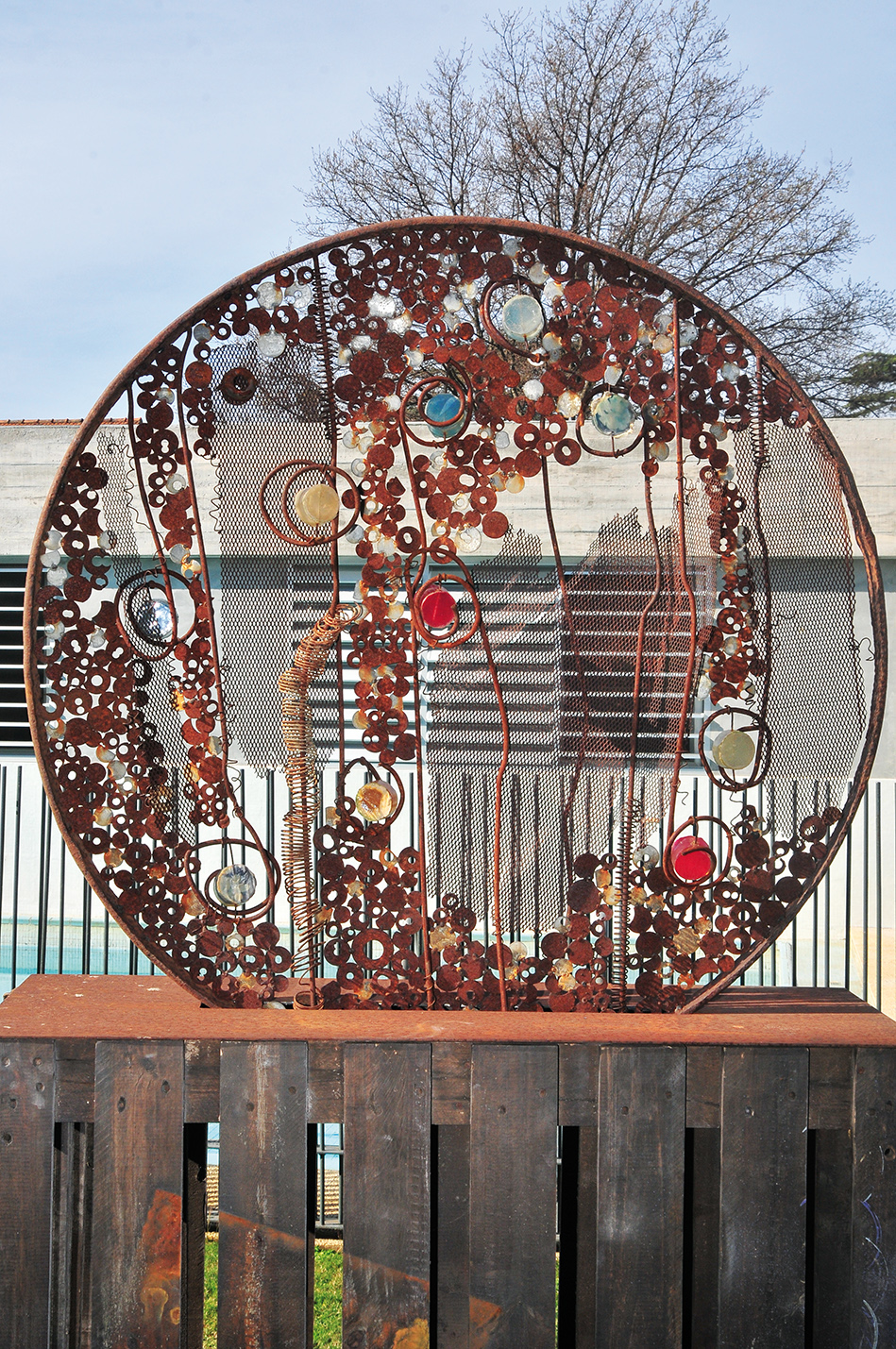 —Sí, son todos peces, no me preguntes por qué. En el colegio hice un estudio sobre Torres García y creo que los primeros peces que hice eran medio constructivos, con piezas de madera, así como Torres hacía los juguetes. Pero tampoco fue una elección muy consciente, ni me gusta bucear ni tengo peceras ni nada de eso. Fue algo que se dio casi sin darme cuenta. El círculo también está presente en todo lo que hago, es una forma que me atrae, siempre veo algo más allá en ellos. Además, si te fijás, en la mayoría de estos peces también se da la acumulación de cosas o materiales iguales en una misma obra. Me gusta ese efecto que da el poner muchos objetos iguales juntos, es como que se potencian y se destacan. No me gustan las teorías, soy de hacer y pruebo. Si queda bien, bárbaro, si no, vuelvo a empezar. No es que tenga una idea y la desarrolle. Entro al taller, veo un material y es ese material el que me dice lo que voy a hacer con él. Quizás se deba a que a mi padre le encantaba la carpintería y yo, de chica, iba al taller que él tenía y le usaba las herramientas y lo que encontraba a mano para hacer cosas. Mi familia siempre fue de darse idea para solucionar todo lo que se rompía. Acá en casa es igual, nos lleva más tiempo pero tratamos de hacer todo nosotros. Me encanta, además es un ejemplo para mis hijos, que aprendan que las cosas se arreglan, se solucionan, no voy enseguida y compro otra cosa cuando algo se rompe. Siempre le buscamos la vuelta. Es una manera de valorar y cuidar.