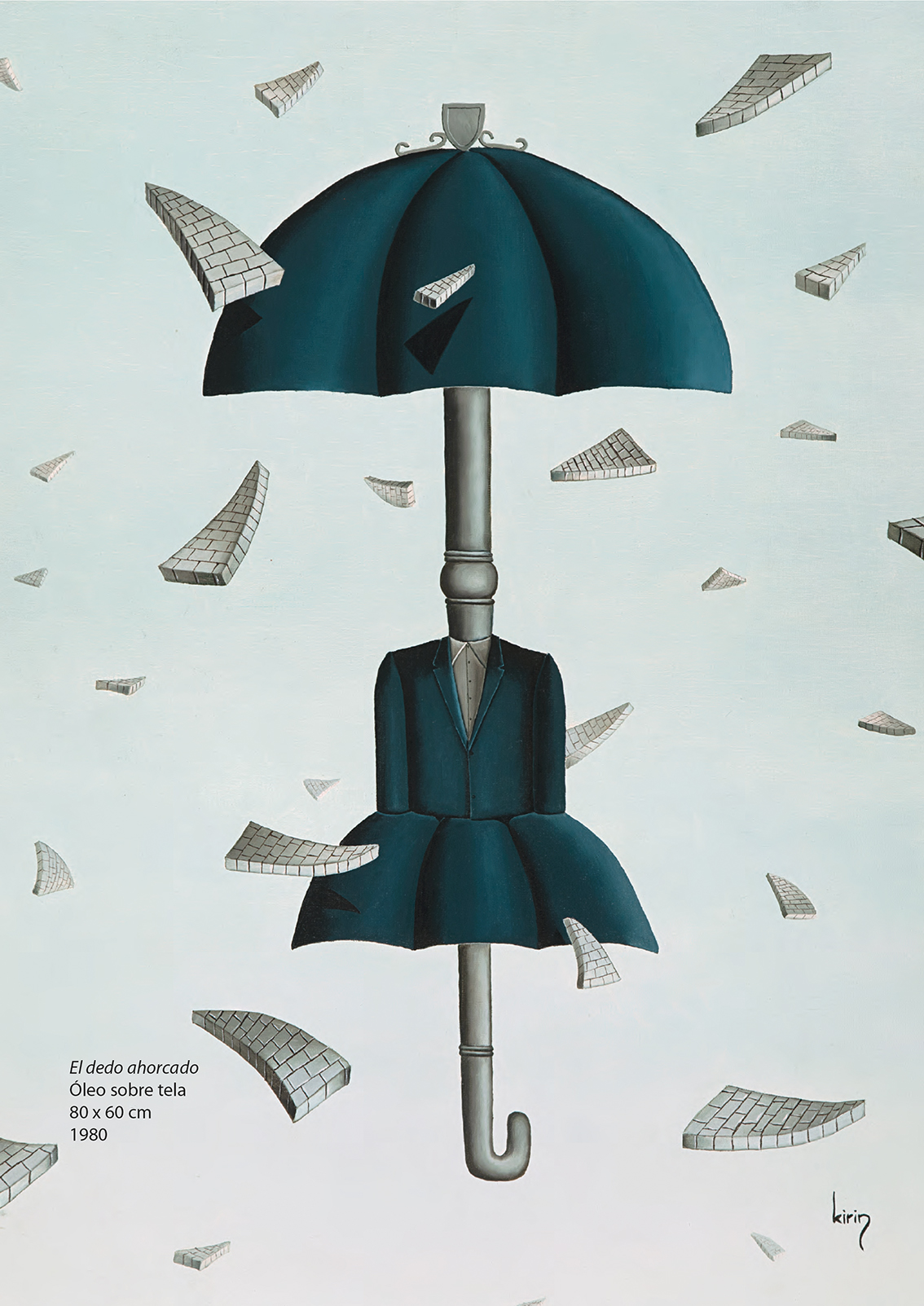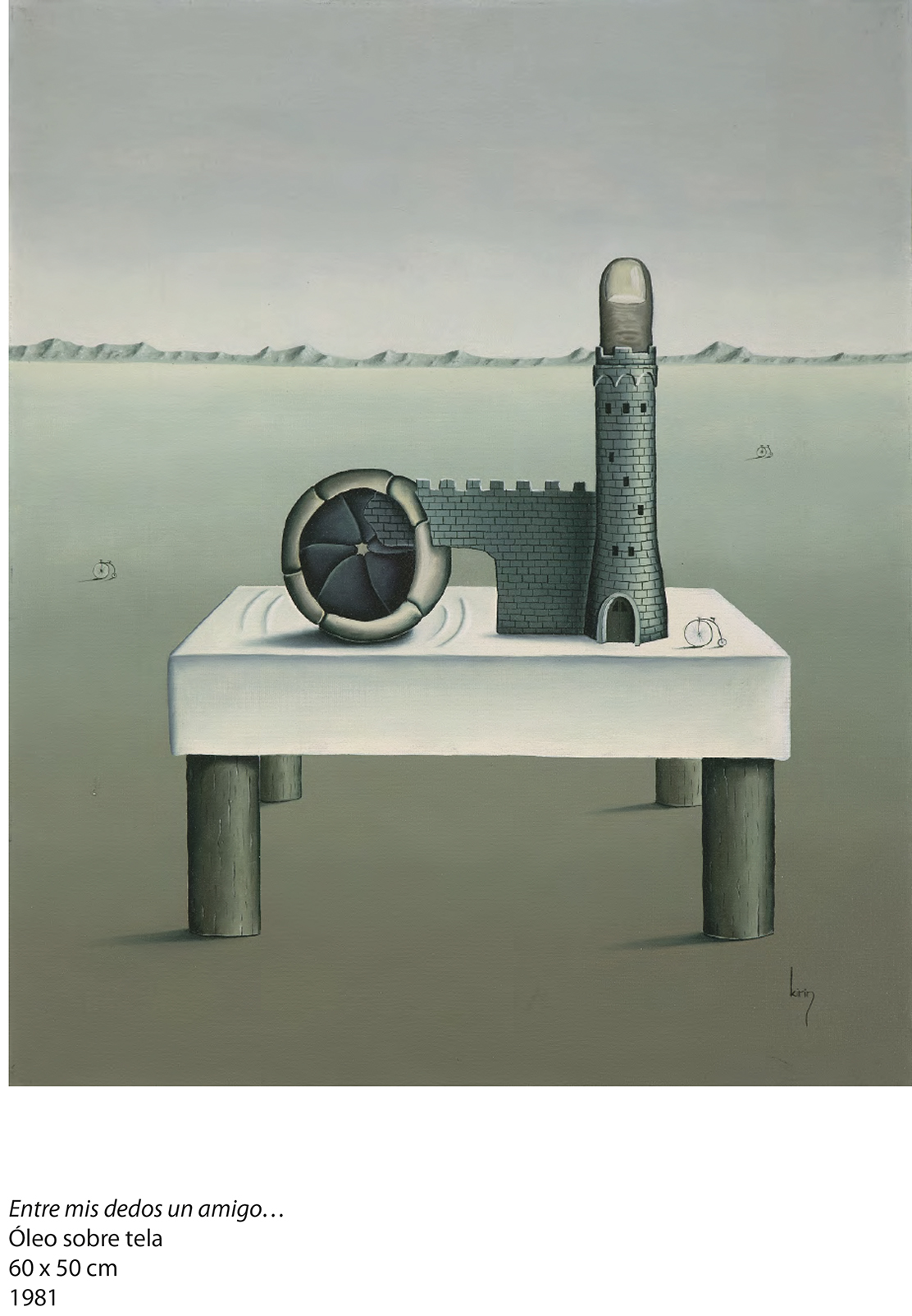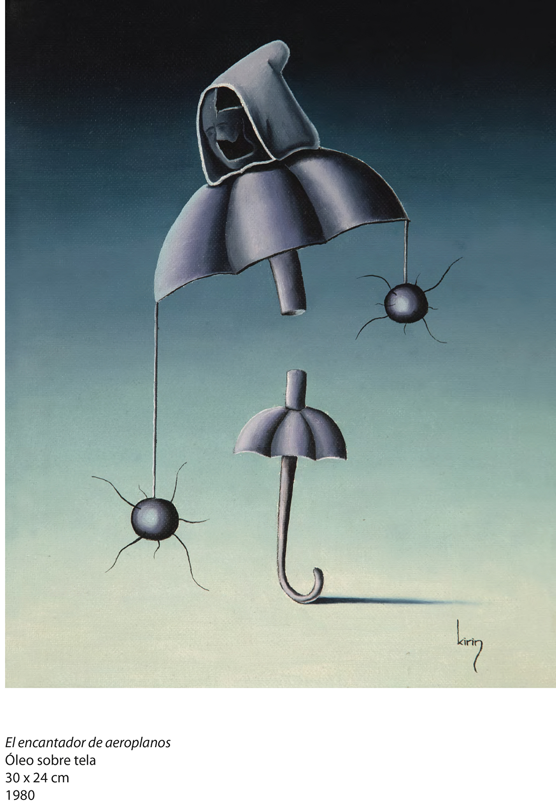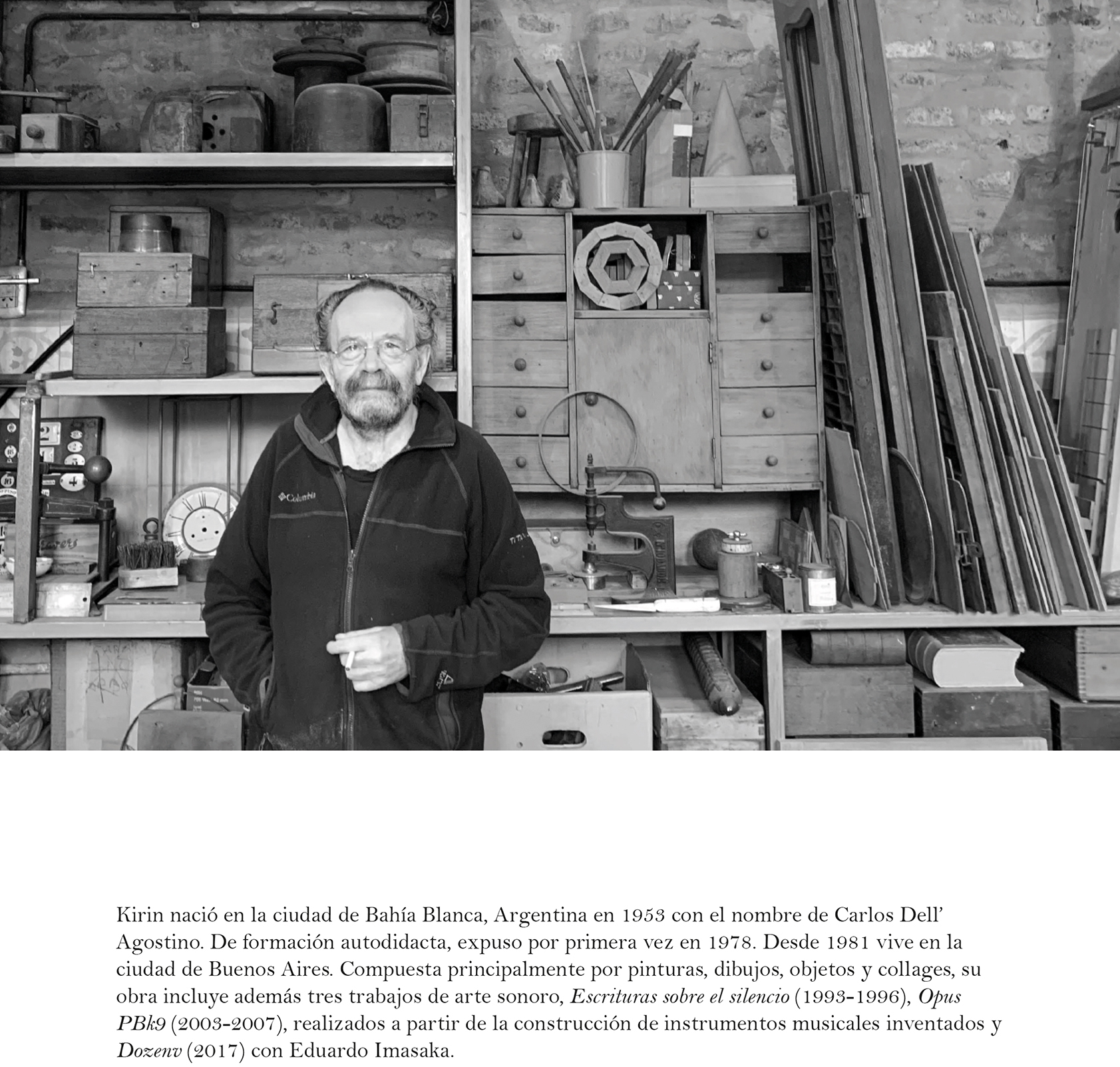 Hay en su producción, además, un gesto que desestabiliza la primacía de la mirada: la incorporación del sonido. Kirin construye instrumentos musicales inventados, artefactos que no solo se observan sino que se escuchan, como si la obra reclamara otro tiempo, menos inmediato y más corporal. Esa deriva experimental convive con una reflexión literaria que se materializa en libros como Los ángeles son las moscas del paraíso, publicado en 1999, donde collages y textos dialogan con la misma libertad con la que su obra se despliega en el espacio.