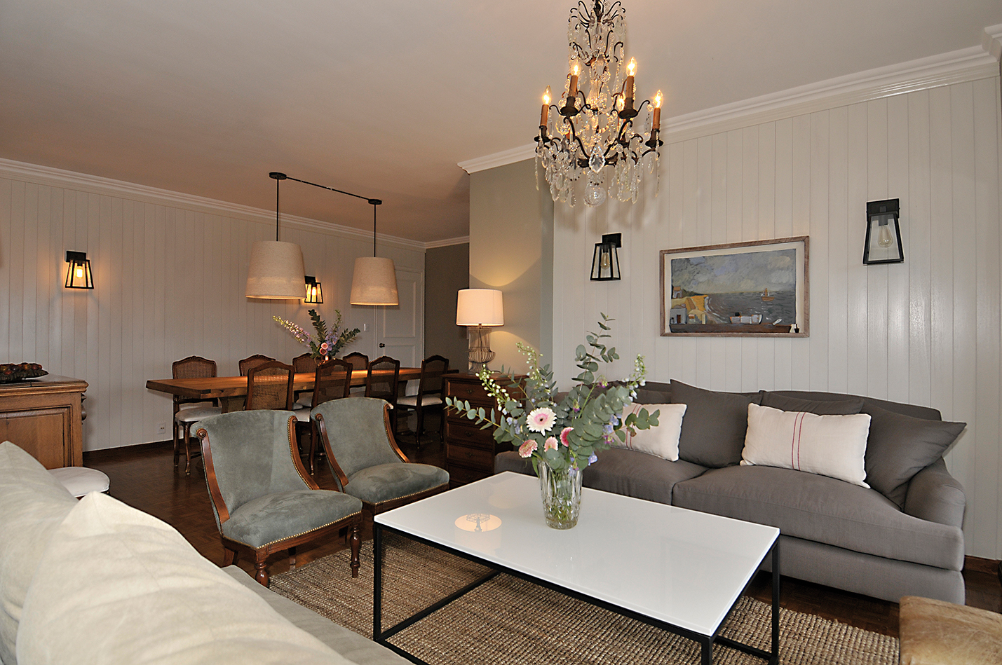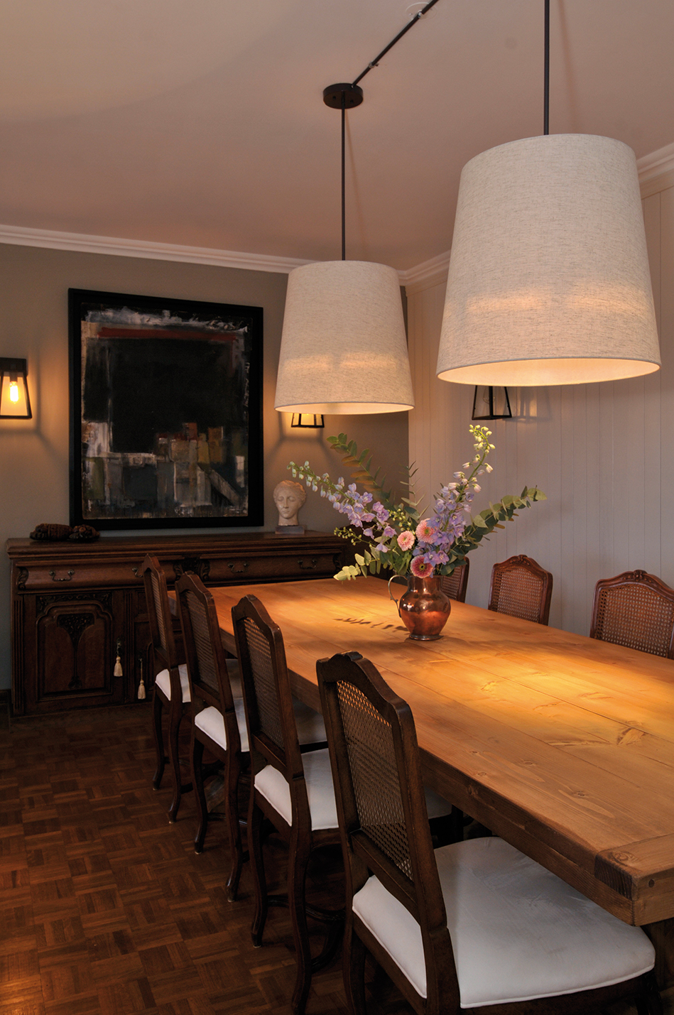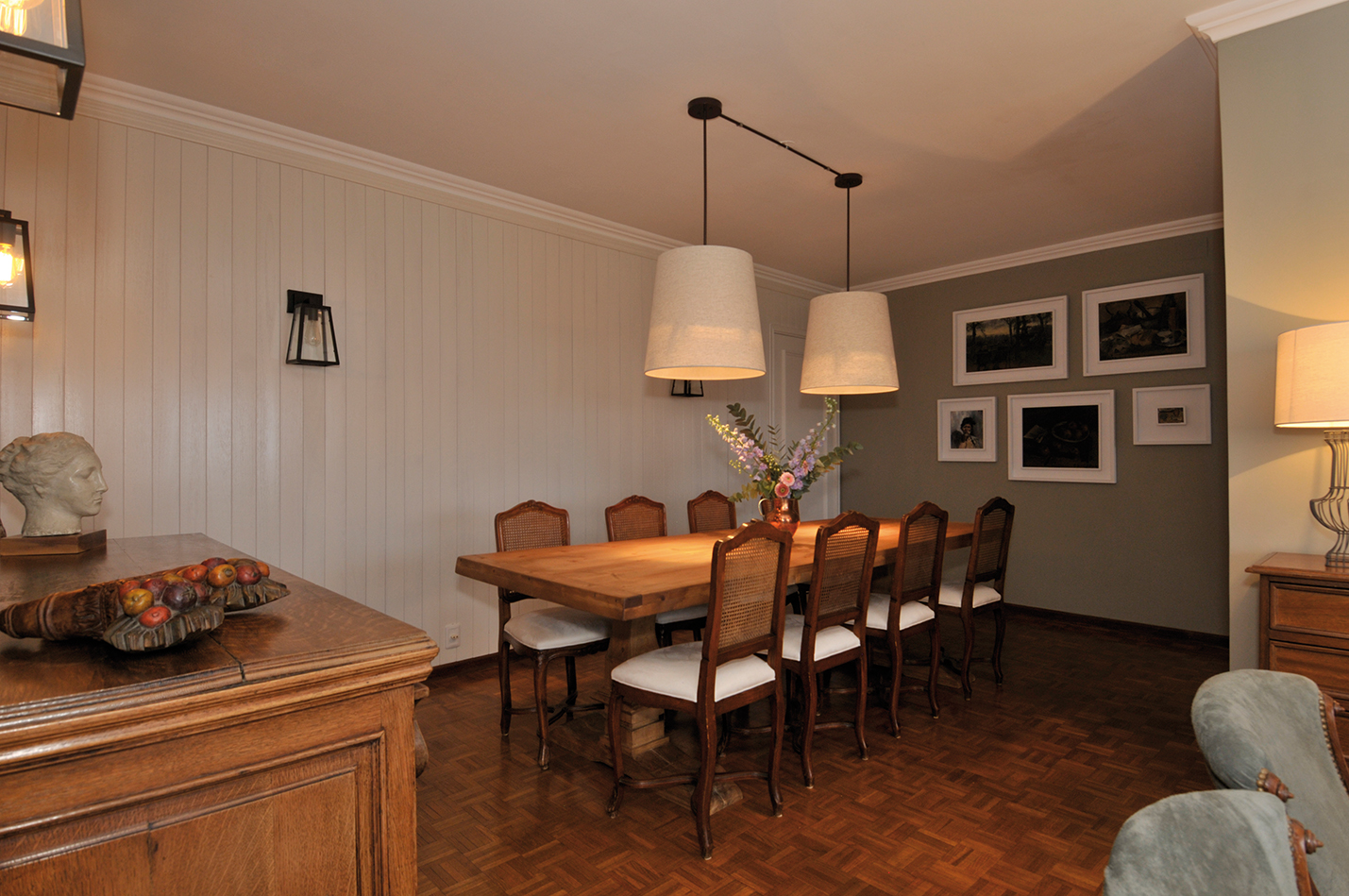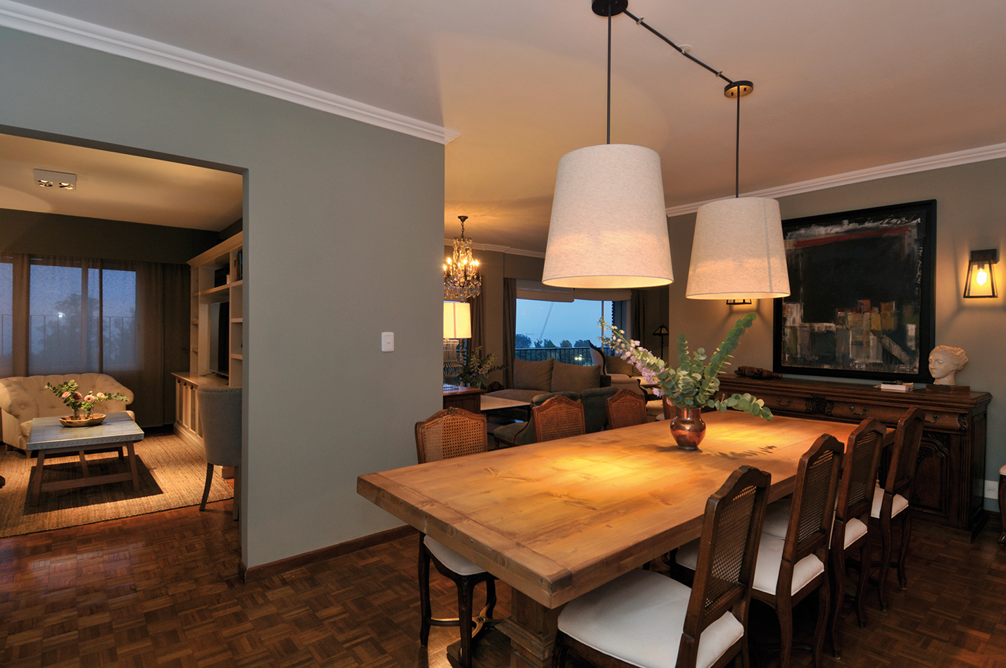 Abriéndose paso a un costado se encuentra el comedor. La pared de fondo también fue revestida en madera pintada de blanco para imprimirle mucha luz al espacio que no tiene ventanas directas y a la vez darle un toque de calidez con la textura. Para acompañar las sillas y el aparador de líneas clásicas que se conservaron de la antigua decoración, se eligió incorporar el toque rústico a través de una larga mesa en pino antiguo con patas centrales torneadas, sin cabeceras. La iluminación proviene de dos pantallas de gran formato y otras de carácter industrial en las paredes. Las secunda un surtido de obras de arte, valiosos tesoros de los dueños de casa, a las cuales se les sustituyeron los marcos dorados a la hoja por otros blancos tipo cajón.