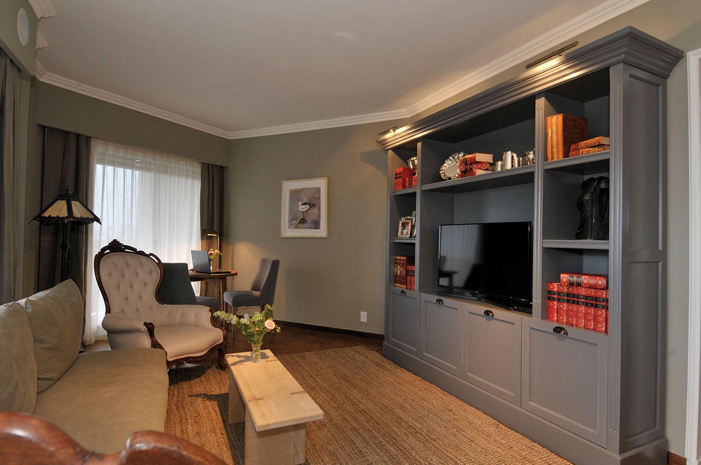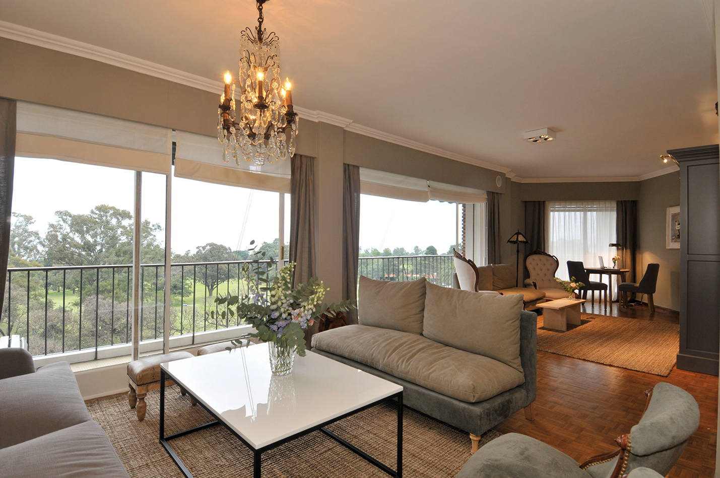 El espacio del living quedó subdividido en tres escenarios diferentes, dos de ellos destinados a sofás y otro, un pequeño rincón para trabajar. Sobre un extremo se revistió una pared en madera pintada de blanco para dar luz y calidez al ambiente. Sobre ella se apoya un sofá roll arms tapizado en lino gris, con almohadones a rayas french. Lo acompañan un par de butacas Imperio retapizadas en cuero descarne en verde petróleo, una mesa de líneas puras con tapa de mármol blanco, muy práctica, y un sofá tipo settee sin brazos, tapizado en dos géneros: bull stonewash y cuero descarne en la estructura. Escolta el conjunto una araña de caireles. Sobre otro sector se diagramó un espacio intermedio para el cual se dispuso una biblioteca de estilo hecha a medida, con televisión, otro sofá settee sin brazos y dos poltronas victorianas. Sobre el rincón con ventanales en proa se dispuso una pequeña mesa circular en madera de pino antiguo y un par de sillas de corte simple, que hace las veces de comodín, ya sea para trabajar o tomar el té, acompañado de una bella vista al campo de golf y atardeceres sobre el Cerro de Montevideo.