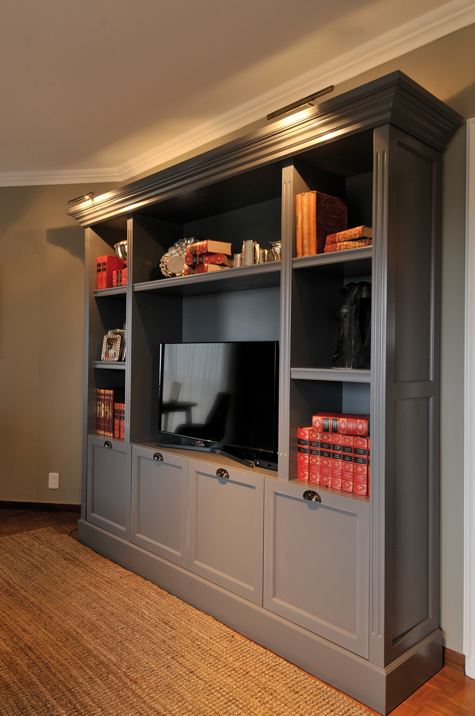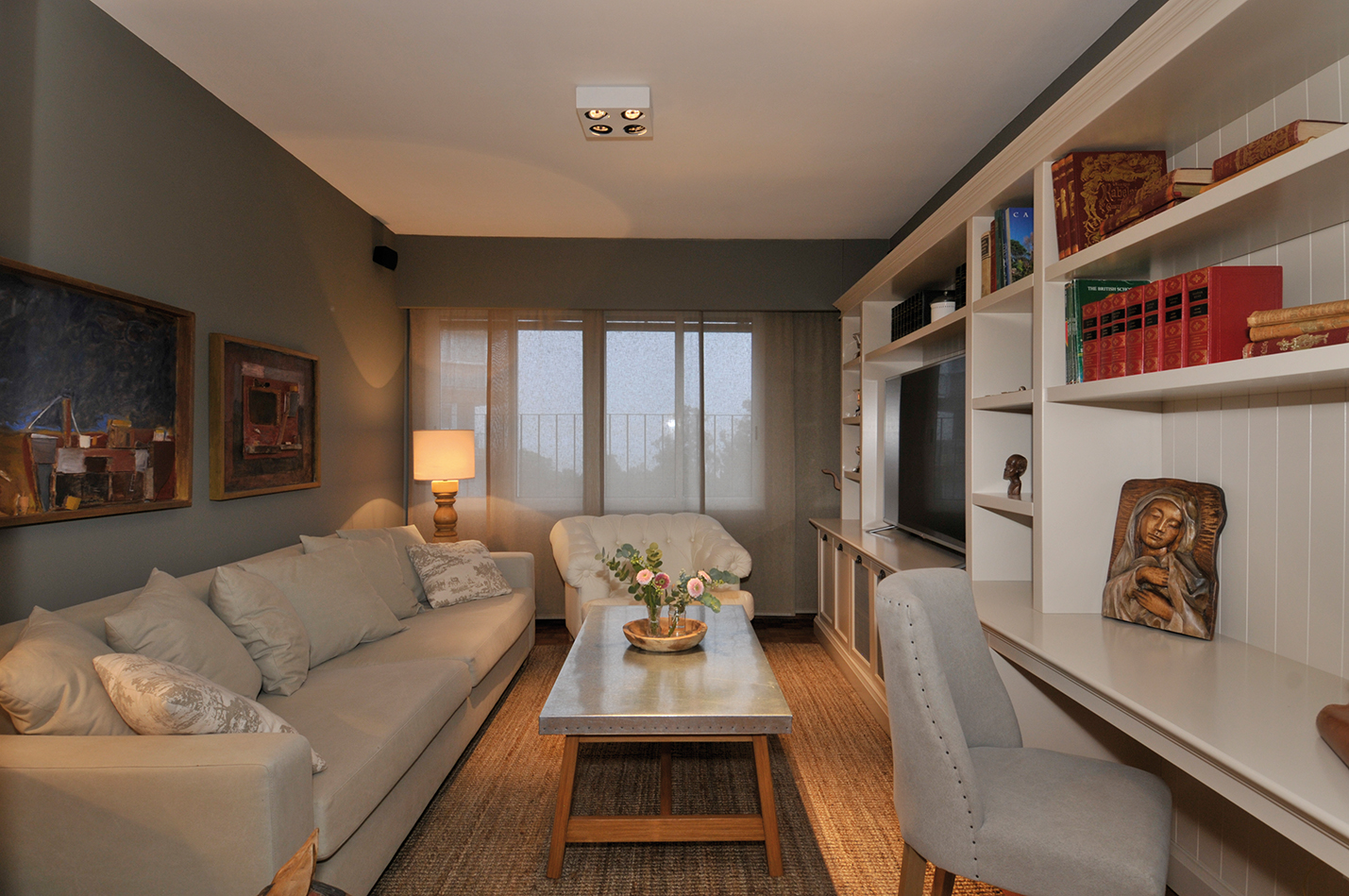 En tanto, un living diario más íntimo se abre hacia el otro lado. Aquí la paleta es más oscura, cálida y acogedora. A nivel funcional, se maximizaron las medidas de cada componente. Las líneas modernas del sofá de casi tres metros de largo tapizado en bull stone wash contrasta con la biblioteca de estilo de cuatro metros que fue diseñada espacialmente a medida para que sea muy funcional, esconda todos los equipos y cables y hasta contenga un escritorio incluido. La mesa ratona con patas de madera y tapa de chapa contrasta con el sillón capitoneado blanco. Los tonos de la madera se repiten en cuadros y tallas hechos por la dueña de casa.