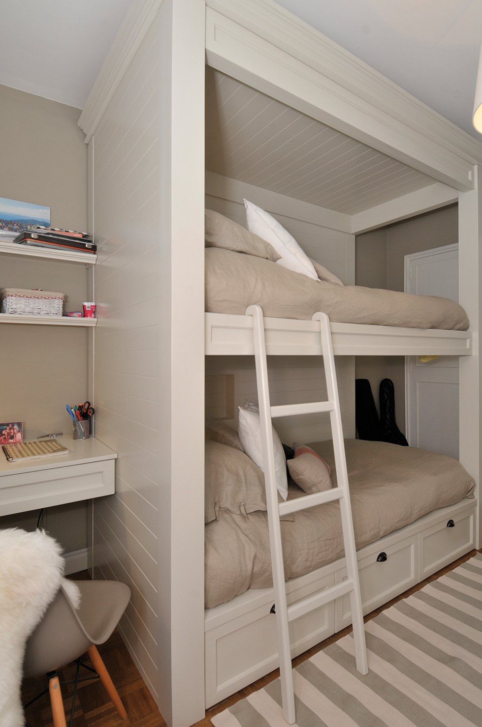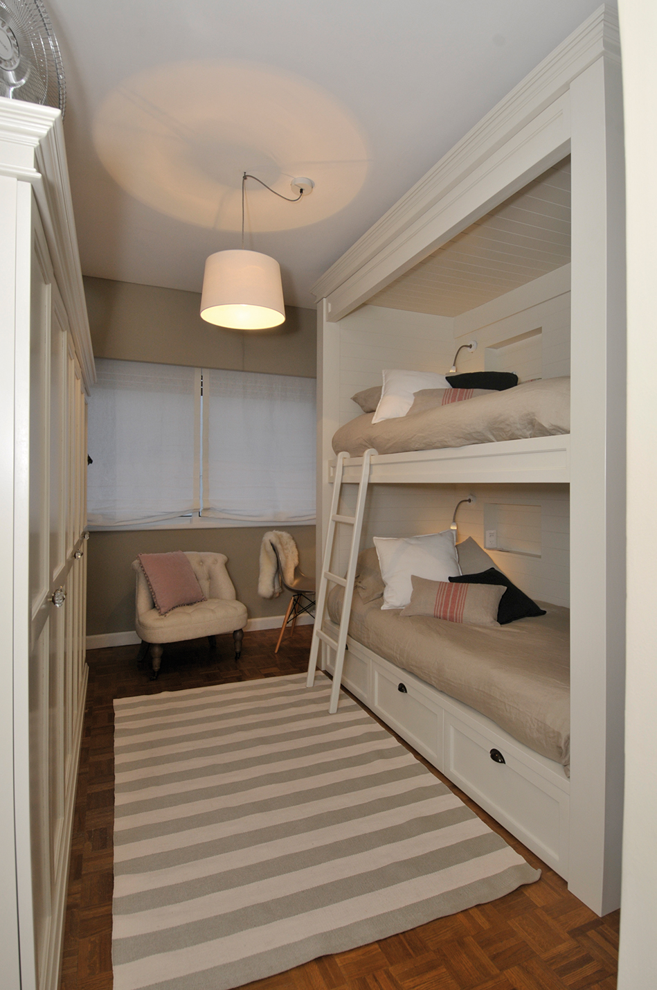 Este dormitorio compartido por dos hermanas también se enfocó sobre una paleta de tonos neutros, para lograr la tranquilidad pero igualmente alegre, sin comprometer la esencia adolescente. Se trata de una habitación no muy grande, con un equipamiento bien distribuido gracias a que todos los muebles fueron realizados a medida. Es así que se diagramó el espacio con camas cuchetas sobre un lado y en la pared opuesta, un segundo ropero largo y hasta un rincón de escritorio. Este tipo de camas son extremadamente funcionales y prácticas. Son una gran ayuda para mantener la pureza y el orden del dormitorio y además ahorran un montón de espacio porque liberan el área central de la habitación logrando transmitir sensación de amplitud visual. A nivel estético, ayudan a llenar una pared entera de forma homogénea y decorativa. Además, cada una de ellas cuenta con estantes interiores, luminarias de pared y hasta enchufes para cargar los celulares.