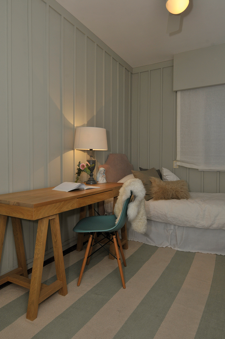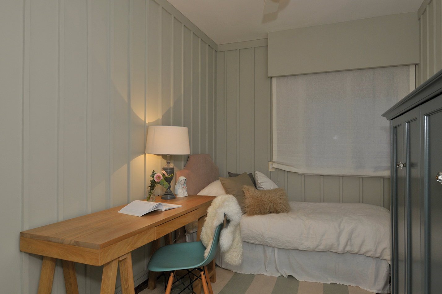 Este otro dormitorio también requería sacar máximo partido a las dimensiones y ampliar el espacio de guardado de ropa. Se revistieron las paredes para darle textura y dejarlas desnudas. Muchos textiles, linos y pieles en tonos neutros logran un espacio relajante, perfecto para terminar el día.
