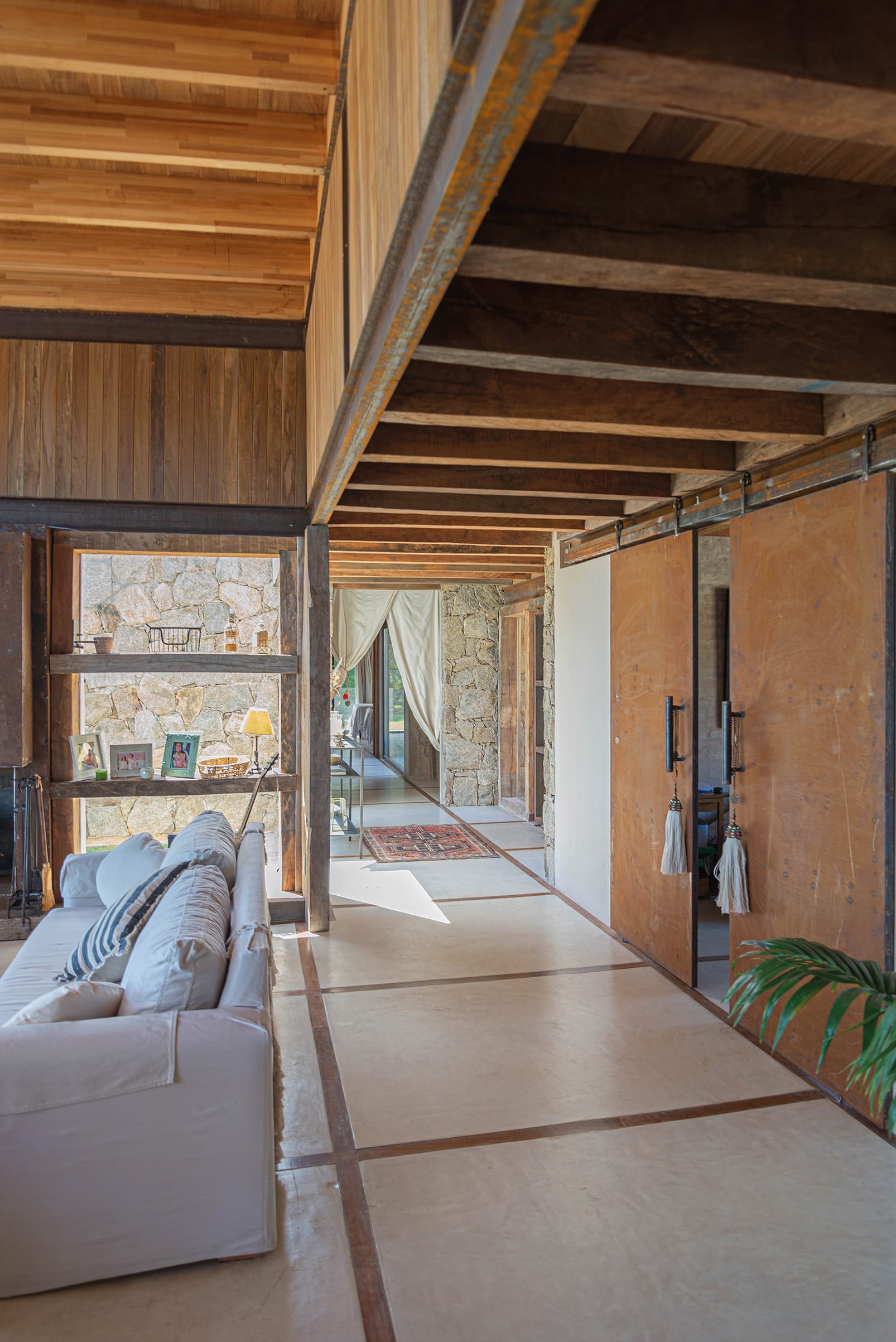La construcción es un híbrido entre obra húmeda tradicional con muros de ladrillo y vigas de hormigón armado (especialmente en el área de dormitorios) y estructura de montaje en seco de hierro y tabiquería de madera para el espacio principal de relación y recepción. La cubierta es liviana y de madera con terminación superior de membrana mineralizada color verde.
