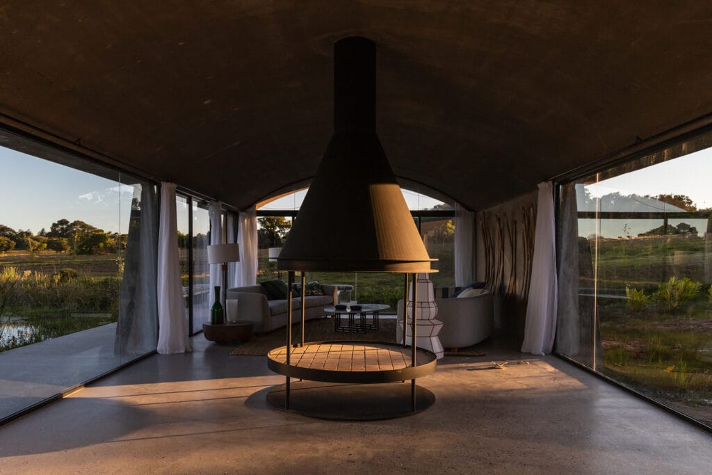 Zona de humedales, la fracción de campo sobre la que debía intervenir Diego Montero estaba señalada por la fuerte presencia del agua, un gran tajamar ordenaba y señalaba ubicaciones y emociones claras y muy fuertes. A las cubiertas abovedadas le acompañaron grandes arcos para enmarcar las aberturas. Y pronto los volúmenes comenzaron a delinear la figura de un barco. Los arcos generan la imagen del puente de un barco, una estructura que sobresale por sobre las bóvedas. Esa torre de policarbonato contiene al espacio destinado a la cocina. En su parte superior van los equipos de aire, en un nivel intermedio va la parte interior de los equipos, los conductos que van en los techos y debajo la cocina. Al momento de imaginar las formas, Diego Montero ya tenía clara la intención de generar una huerta vertical dentro de la cocina. Poder sacar los tomates, pienso en un cultivo hidropónico, que se puedan tener en la cocina misma. Así todo va teniendo más sentido, mezclamos el interior con el exterior, un invernadero dentro de la casa, algo así como un paso más que deja atrás la simple sensación de integración, para generar algo más profundo…