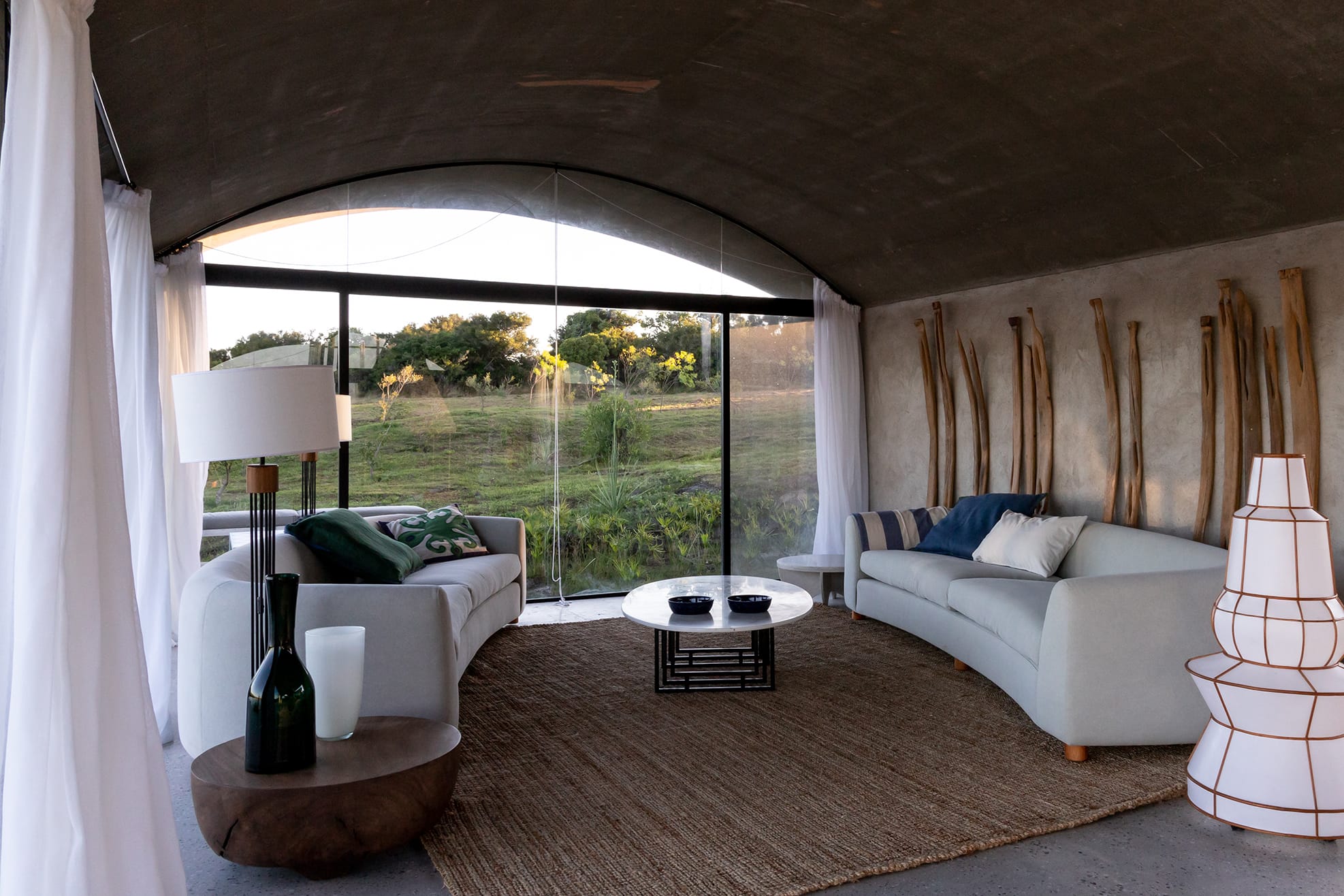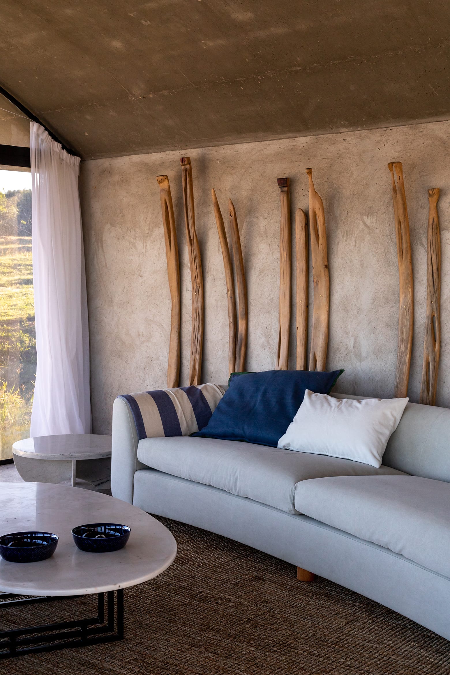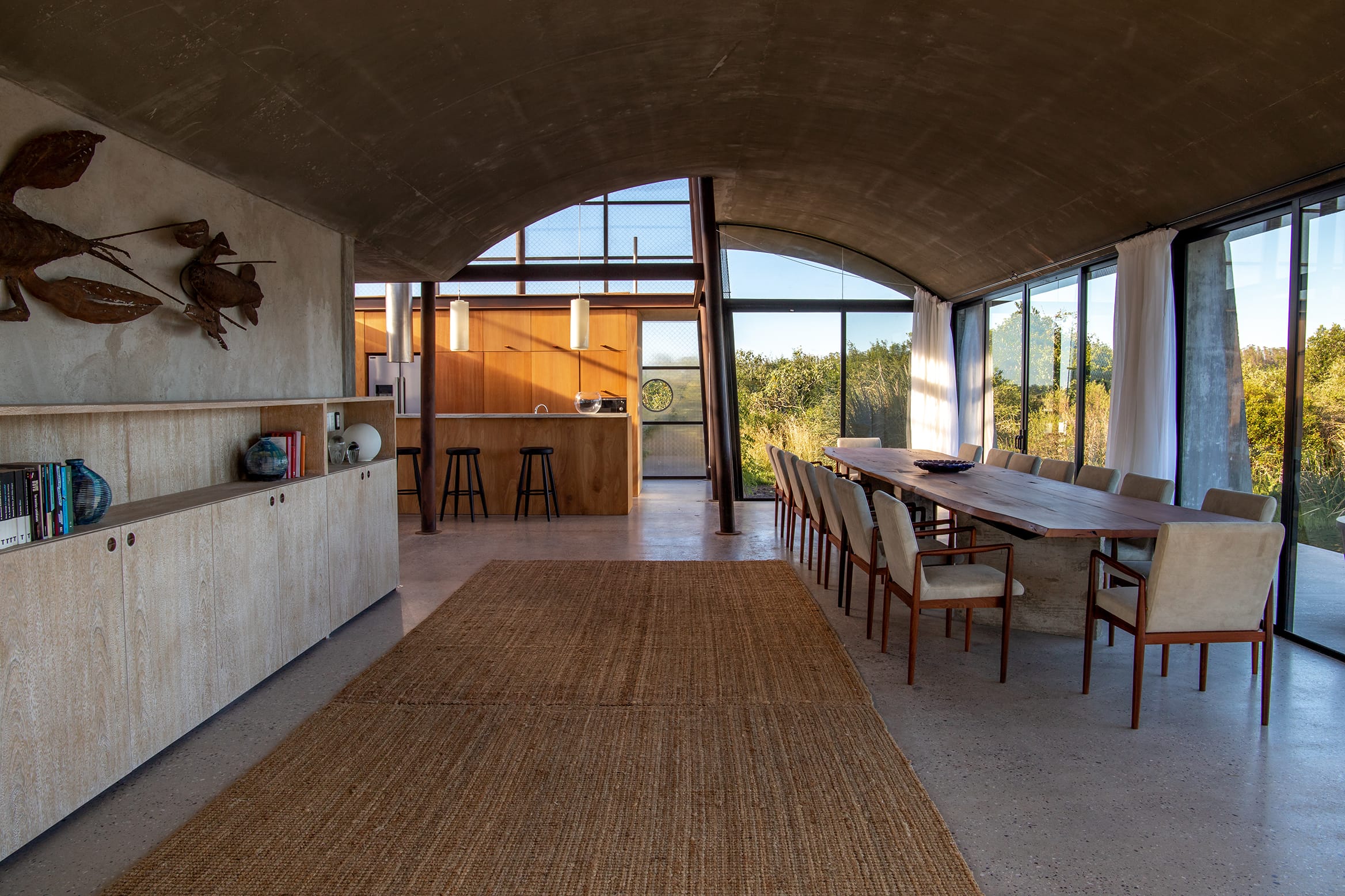 La idea de las curvas ligeras de los techos se repite en las aberturas, enmarcadas con grandes arcos que recrean aquella línea lánguida que envuelve. La idea era repetir el concepto de cueva, esa sensación que nos da la casa que es como bastante abrigada, parte un poco del aburrimiento de los techos planos.