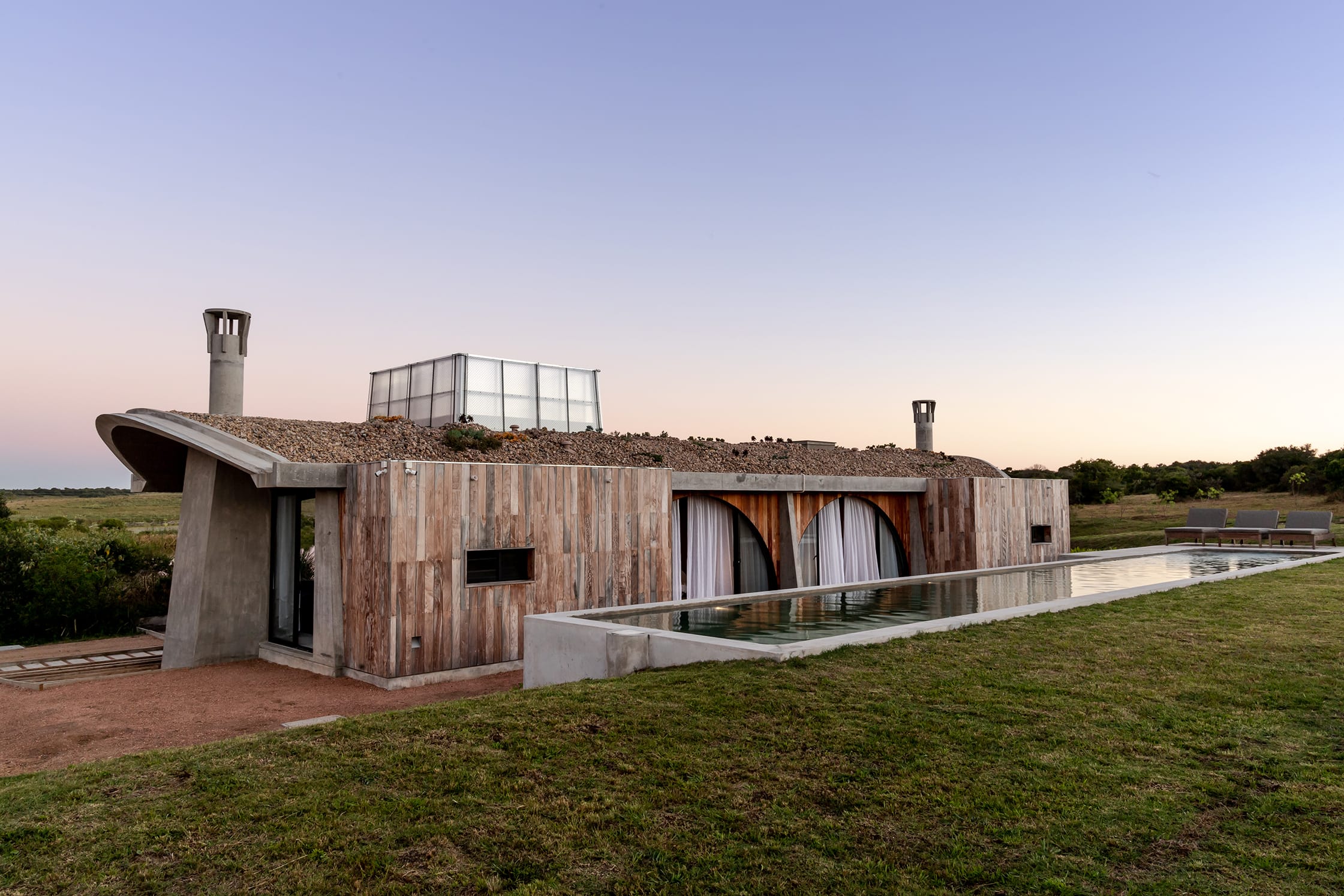 Zona de humedales, la fracción de campo sobre la que debía intervenir Diego Montero estaba señalada por la fuerte presencia del agua, un gran tajamar ordenaba y señalaba ubicaciones y emociones claras y muy fuertes. A las cubiertas abovedadas le acompañaron grandes arcos para enmarcar las aberturas. Y pronto los volúmenes comenzaron a delinear la figura de un barco. Los arcos generan la imagen del puente de un barco, una estructura que sobresale por sobre las bóvedas. Esa torre de policarbonato contiene al espacio destinado a la cocina. En su parte superior van los equipos de aire, en un nivel intermedio va la parte interior de los equipos, los conductos que van en los techos y debajo la cocina. Al momento de imaginar las formas, Diego Montero ya tenía clara la intención de generar una huerta vertical dentro de la cocina. Poder sacar los tomates, pienso en un cultivo hidropónico, que se puedan tener en la cocina misma. Así todo va teniendo más sentido, mezclamos el interior con el exterior, un invernadero dentro de la casa, algo así como un paso más que deja atrás la simple sensación de integración, para generar algo más profundo…