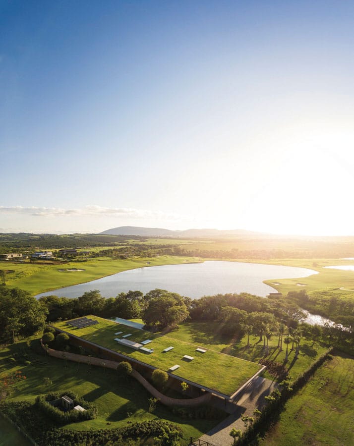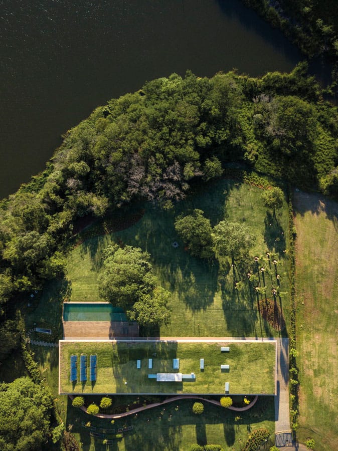 La casa se convierte en una continuación de la geografía del lugar. La quinta fachada, la cubierta horizontal ajardinada, es un manto de césped. Allí se ubican las instalaciones, tanto paneles como tragaluces, de la casa y a su vez, el manto de césped se ocupa del confort térmico de la misma. Por otro lado, dejando de lado la fantástica solución funcional, el arquitecto le devuelve al entorno el espacio ocupado en una lógica de terraza jardín que termina por convertir el proyecto junto a la topografía en un espacio homogéneo.