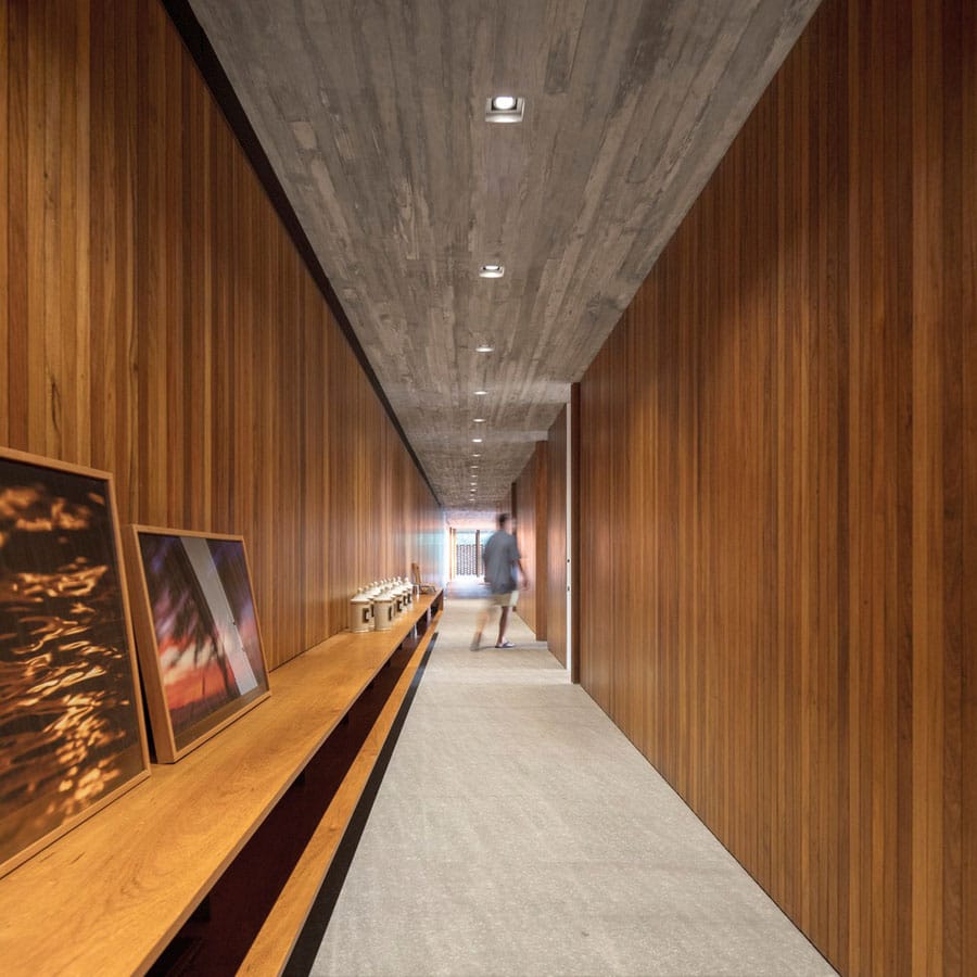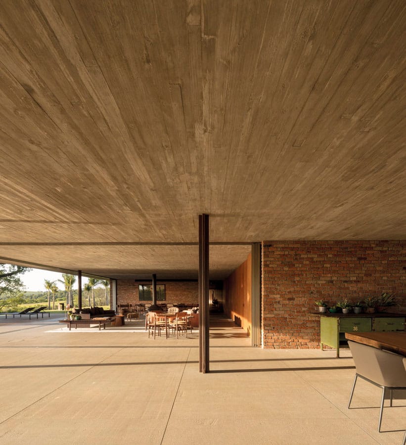 El gran plano de hormigón se sostiene por una disposición en cruz de pilares como en un homenaje a la arquitectura de Mies. La obra del estudio MK27 crece y se desarrolla a partir de la admiración por los grandes hitos de la arquitectura incorporando elementos variados en todas sus obras.
