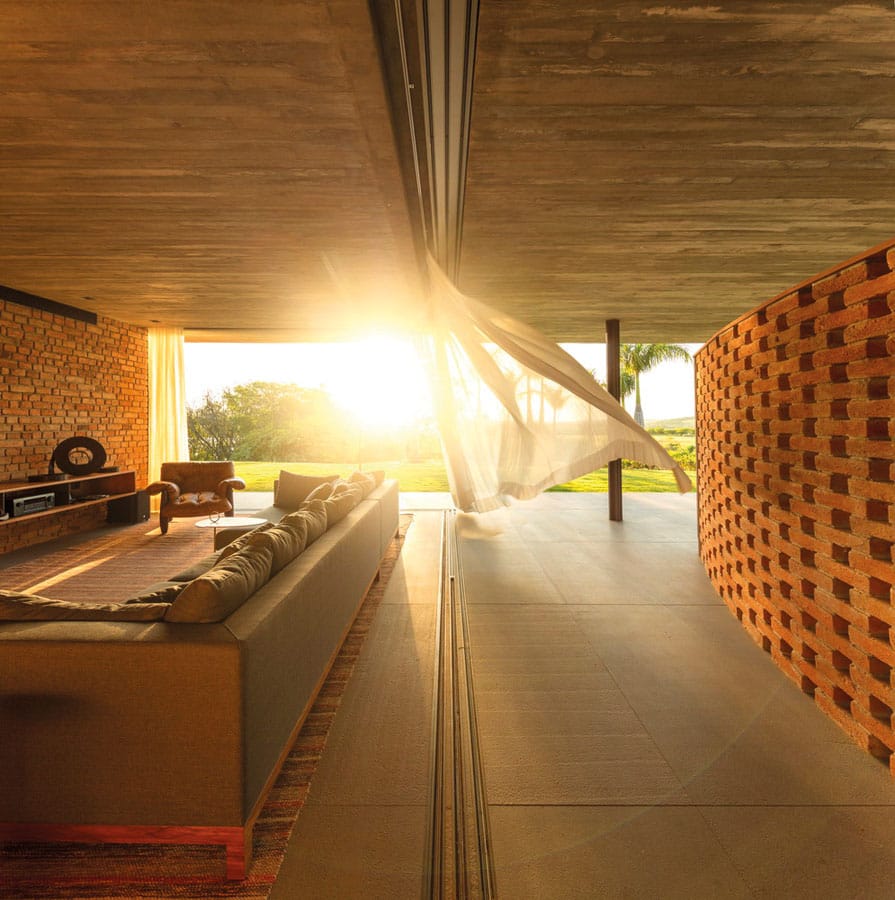 Casa Plana es una obra ubicada en San Pablo, que trabaja una premisa fundamental binaria conformada por llenos y vacíos, adentros y afuera, cóncavos y convexos. Esta concepción se puede apreciar en el muro curvo perimetral de ladrillo que recorre la obra y, en vez de funcionar como pared y generar límites, interactúa con los ambientes, con los juegos de luces, y desarrolla la temática en todo su recorrido.