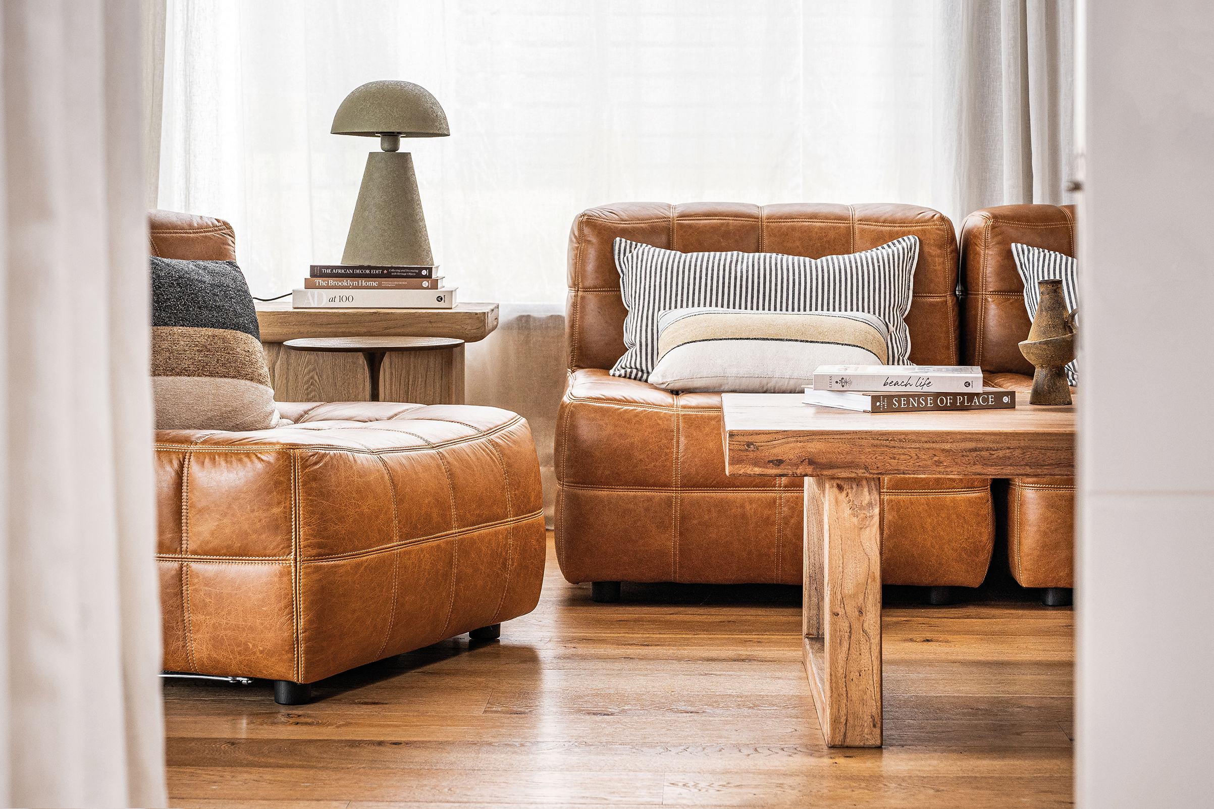 El primero es un apartamento en planta baja del edificio Aldeana, en Manantiales, frente al mar. No hubo interiorista externo: el equipamiento fue concebido íntegramente por la casa. La consigna era crear un refugio playero, apto para el verano despreocupado pero también para la calma invernal, sin estridencias. Domina el espacio una paleta neutra, casi silenciosa, hecha de linos blancos y grises, sillones desbordantes de comodidad y mesas de maderas antiguas recicladas, con destellos de ratán y esterilla. Ese clima orgánico, cálido, responde a un desafío sutil: neutralizar la frialdad moderna de los porcelanatos y los cielorrasos de cemento visto. El resultado es un ambiente amplio, despojado, práctico, casi meditativo, donde el verde agua aparece como un guiño marino, un diálogo íntimo con el océano que tiembla detrás de los ventanales.