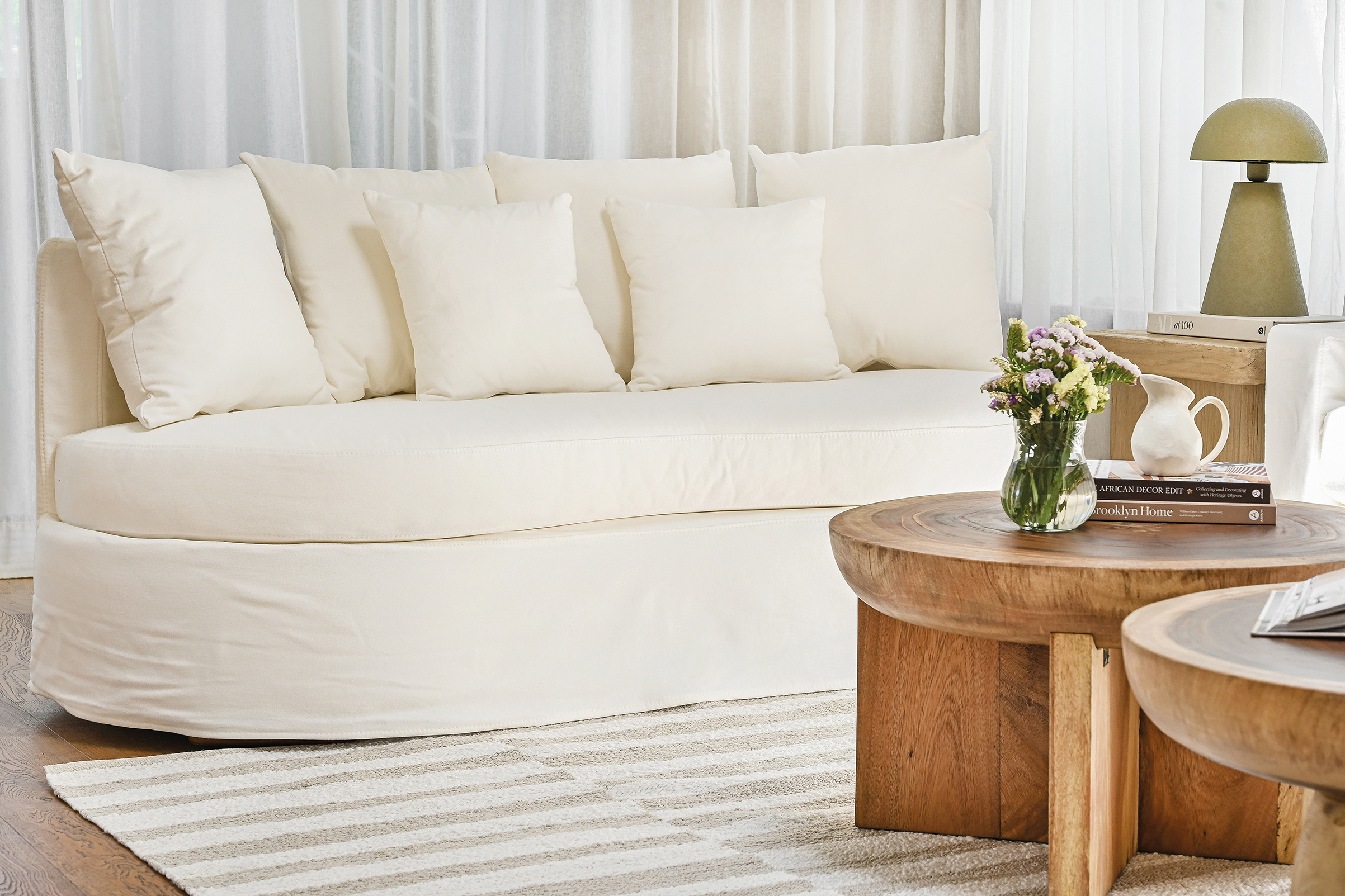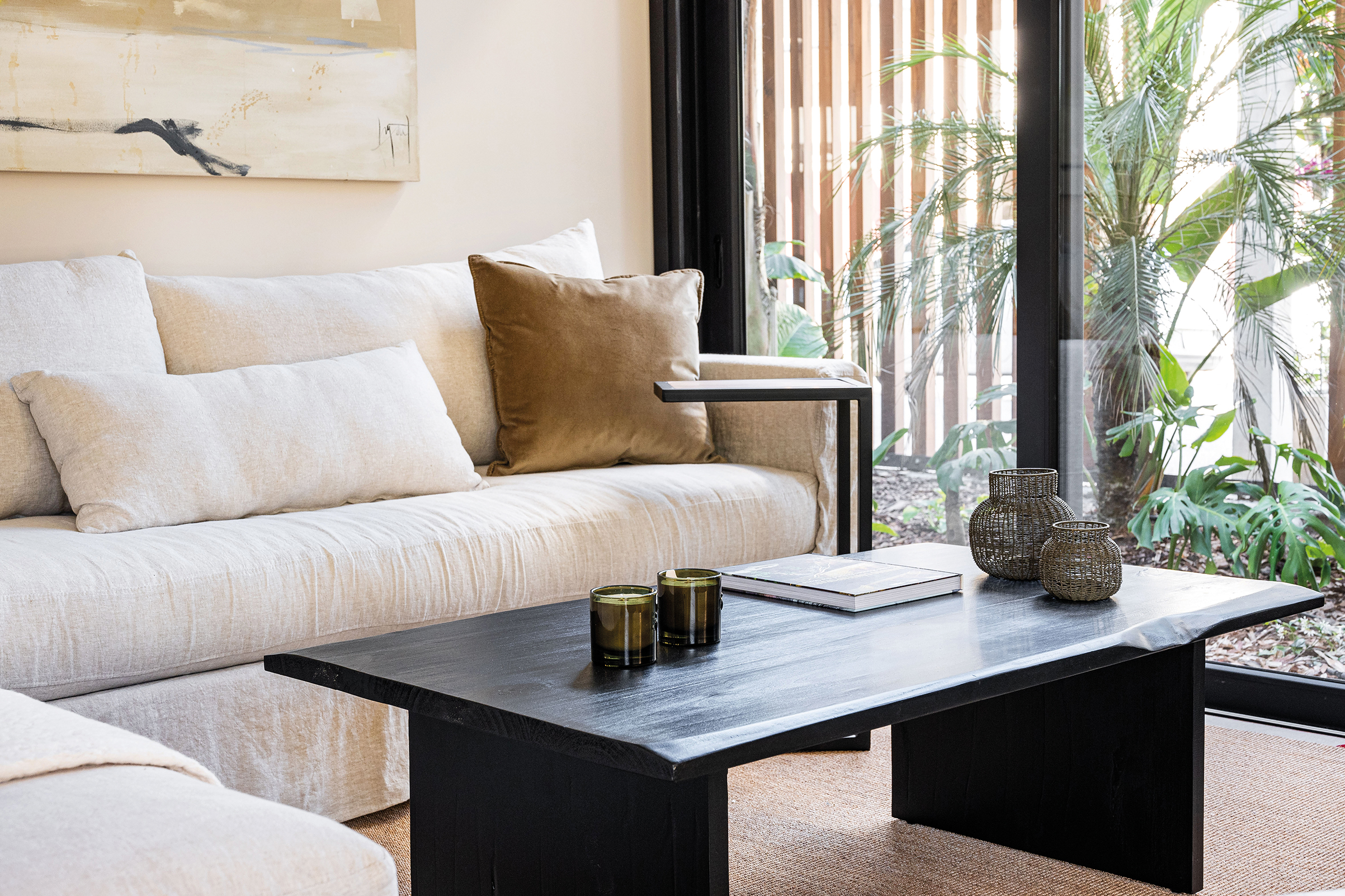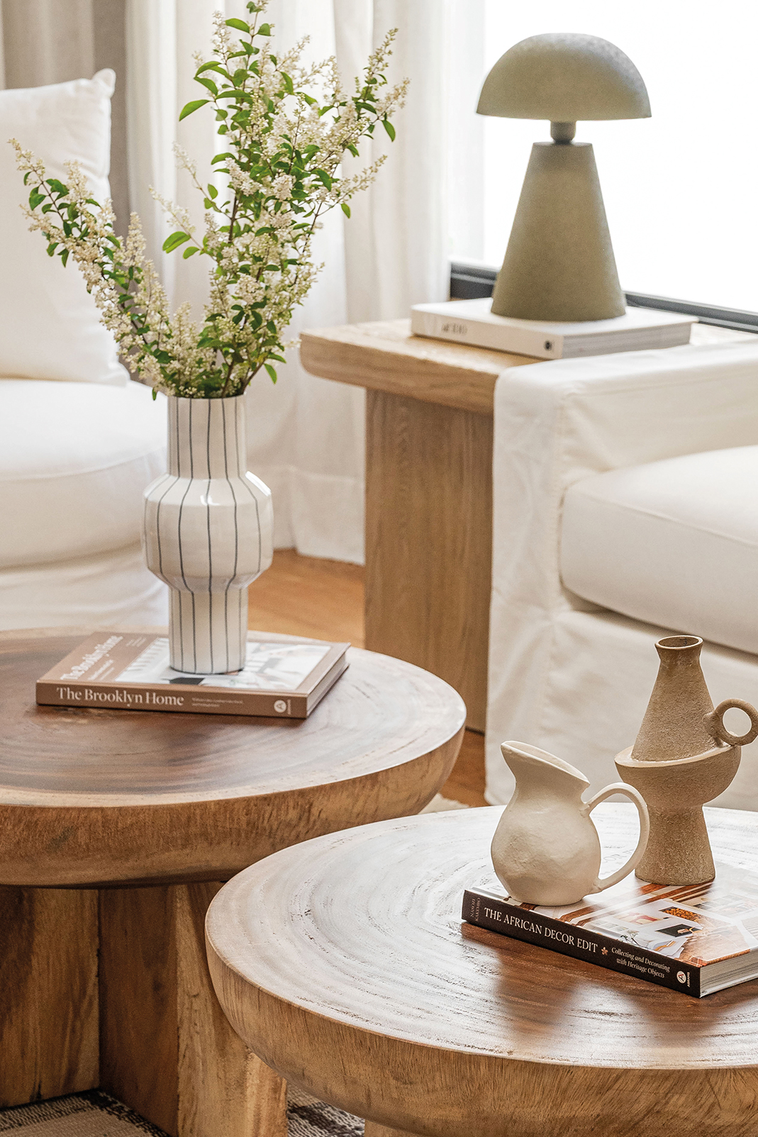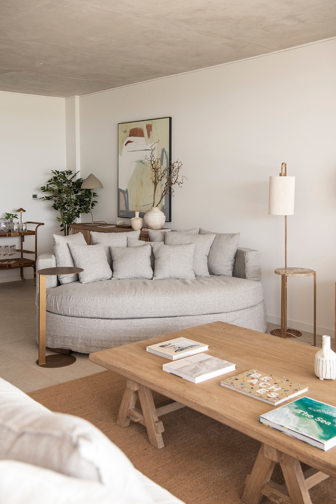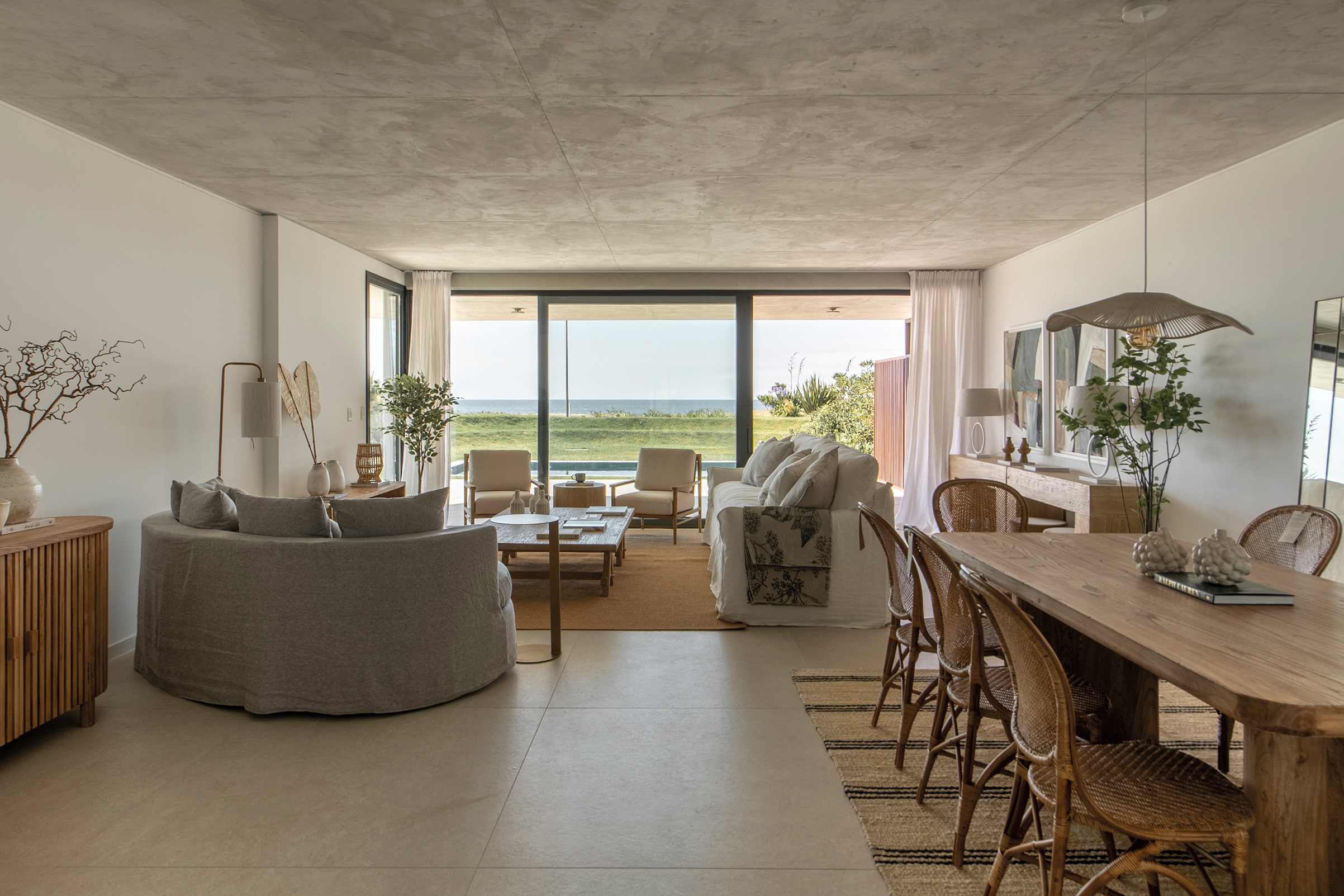 El primero es un apartamento en planta baja del edificio Aldeana, en Manantiales, frente al mar. No hubo interiorista externo: el equipamiento fue concebido íntegramente por la casa. La consigna era crear un refugio playero, apto para el verano despreocupado pero también para la calma invernal, sin estridencias. Domina el espacio una paleta neutra, casi silenciosa, hecha de linos blancos y grises, sillones desbordantes de comodidad y mesas de maderas antiguas recicladas, con destellos de ratán y esterilla. Ese clima orgánico, cálido, responde a un desafío sutil: neutralizar la frialdad moderna de los porcelanatos y los cielorrasos de cemento visto. El resultado es un ambiente amplio, despojado, práctico, casi meditativo, donde el verde agua aparece como un guiño marino, un diálogo íntimo con el océano que tiembla detrás de los ventanales.