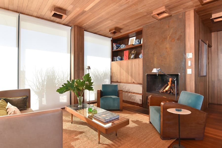 …la propuesta de Farina fue envolver los ambientes en madera, para lo cual escogió una variedad de nogal muy especial, de trama muy definida que trabajó en listones regulares. A partir de su instalación como revestimiento para pavimentos, paredes y cielorraso se generó una relación muy particular fundamentalmente en el equilibrio, proporción y correspondencia adecuada entre los diferentes elementos que generan la estructura y los que luego la equipan y animan. Así la iluminación cenital fue concebida a partir de cajas, también de madera, que nacen del cielorraso, las terrazas cuentan con decks, también de madera y las barandas exteriores, de acero inoxidable dialogan muy fluidamente con el equipamiento estructural de acero corten diseñado por Farina y con el hierro en ángulo y de bajo espesor, que encontramos en la escalera interior o en los detalles de terminación de los ambientes. La planta principal es abierta y contiene sectores claramente delimitados a partir del equipamiento, que definen el espacio cocina, con un comedor integrado, otro sector para el audio y el video que cuenta con un hogar y luego los sectores de dialogo y de trabajo. Todo en una misma planta que funciona circularmente contenida dentro de un espacio de líneas rectas y angulares. La atmósfera lograda es de vitalidad y serenidad y todo fluye…