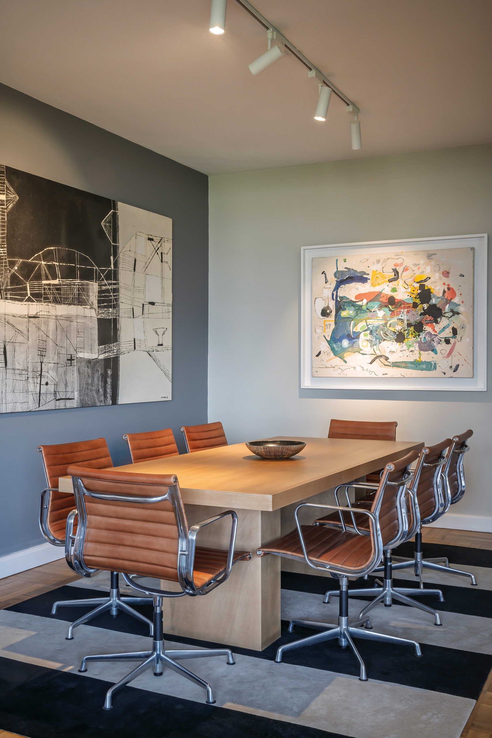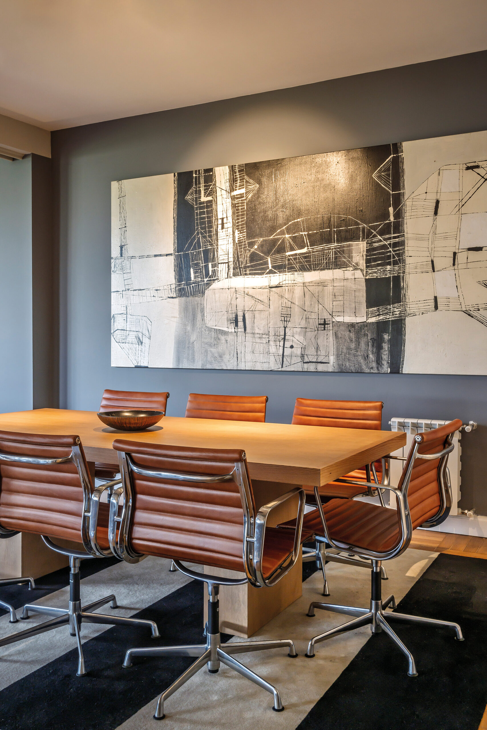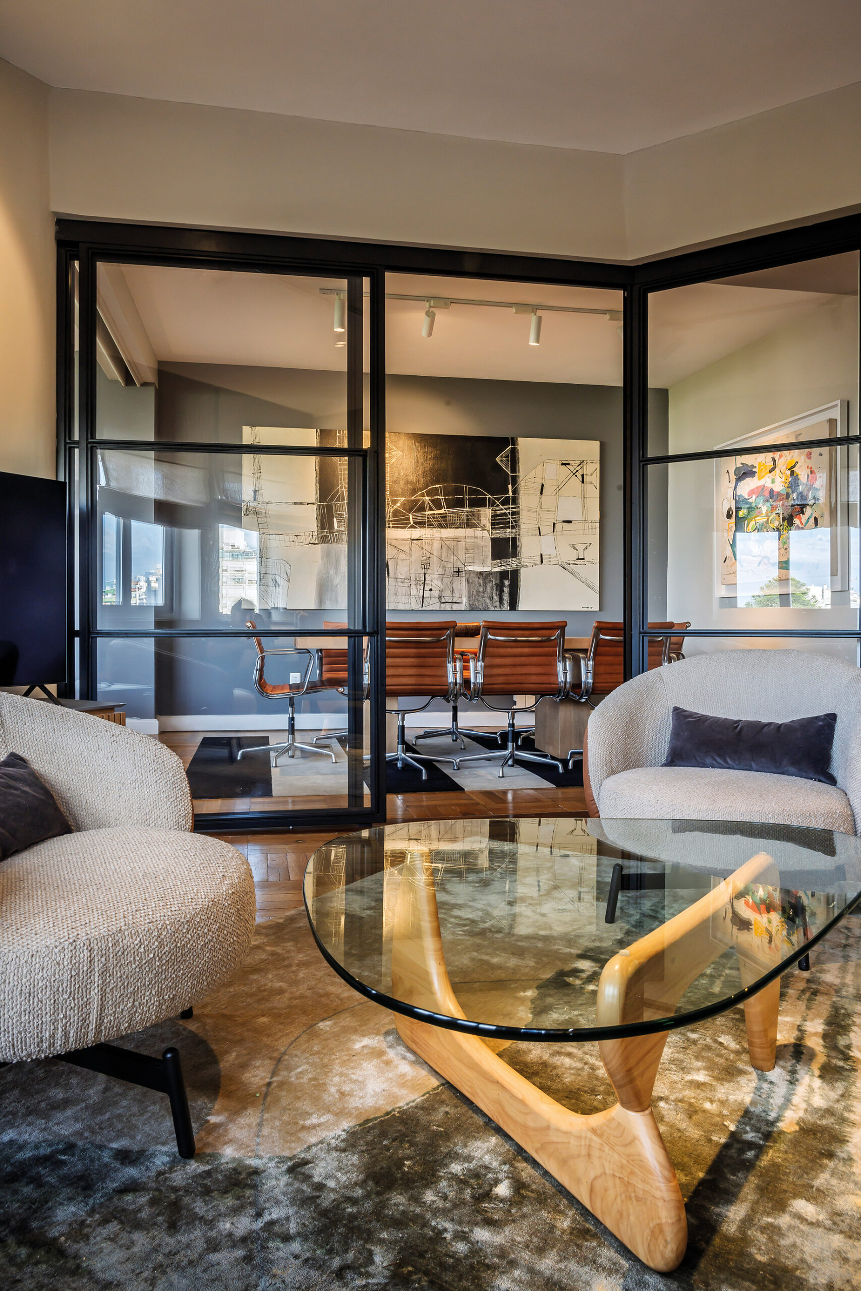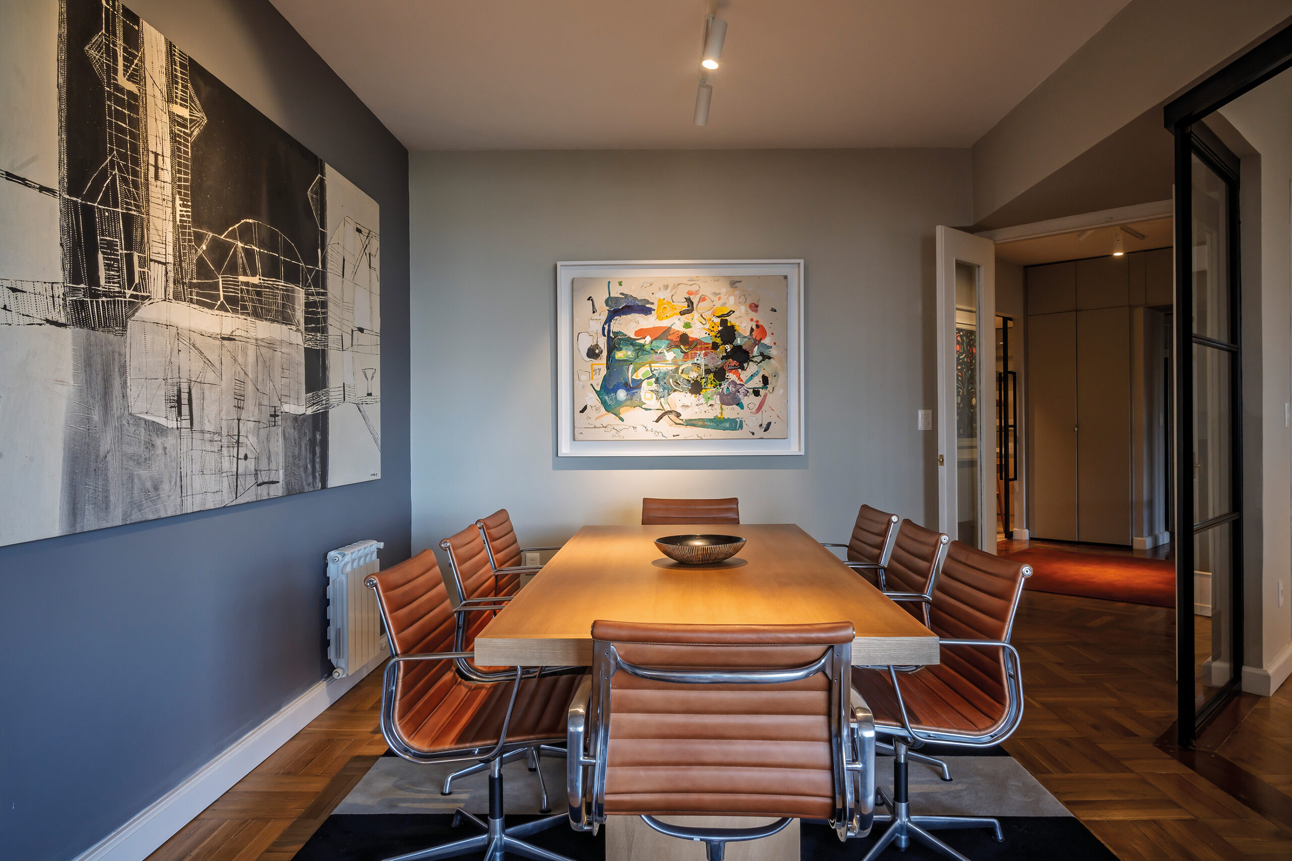 Nada más flanquear el acceso, el impacto es inmediato: una obra de María Freire recibe a los visitantes, acompañada por una alfombra en tonos vibrantes y carpintería de hierro y vidrio que enmarca la zona del escritorio y la cocina. En el comedor, un lienzo de gran escala de Marcelo Legrand domina la escena, funcionando como punto de anclaje para un mobiliario que combina sillas de líneas más corporativas con una mesa neutra de madera laqueada. En el estar, una acuarela imponente de Álvaro Castagnet del Palacio Salvo cobra protagonismo, mientras que piezas de Diego Donner, Bruno Widmann, Sergio Cruz y Molinas alternan con fotografías de Diego Velazco, creando una cadencia entre abstracción y figuración.