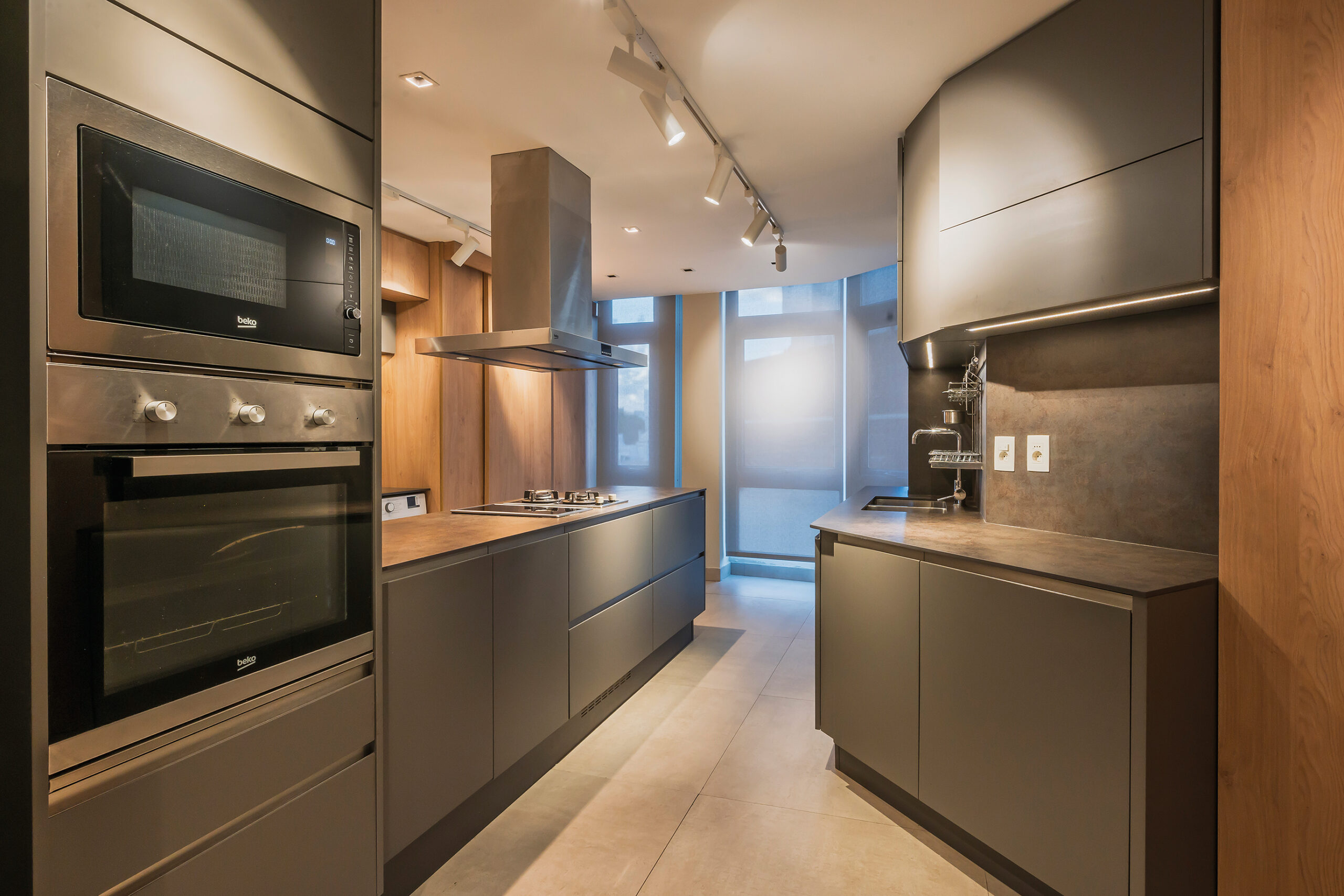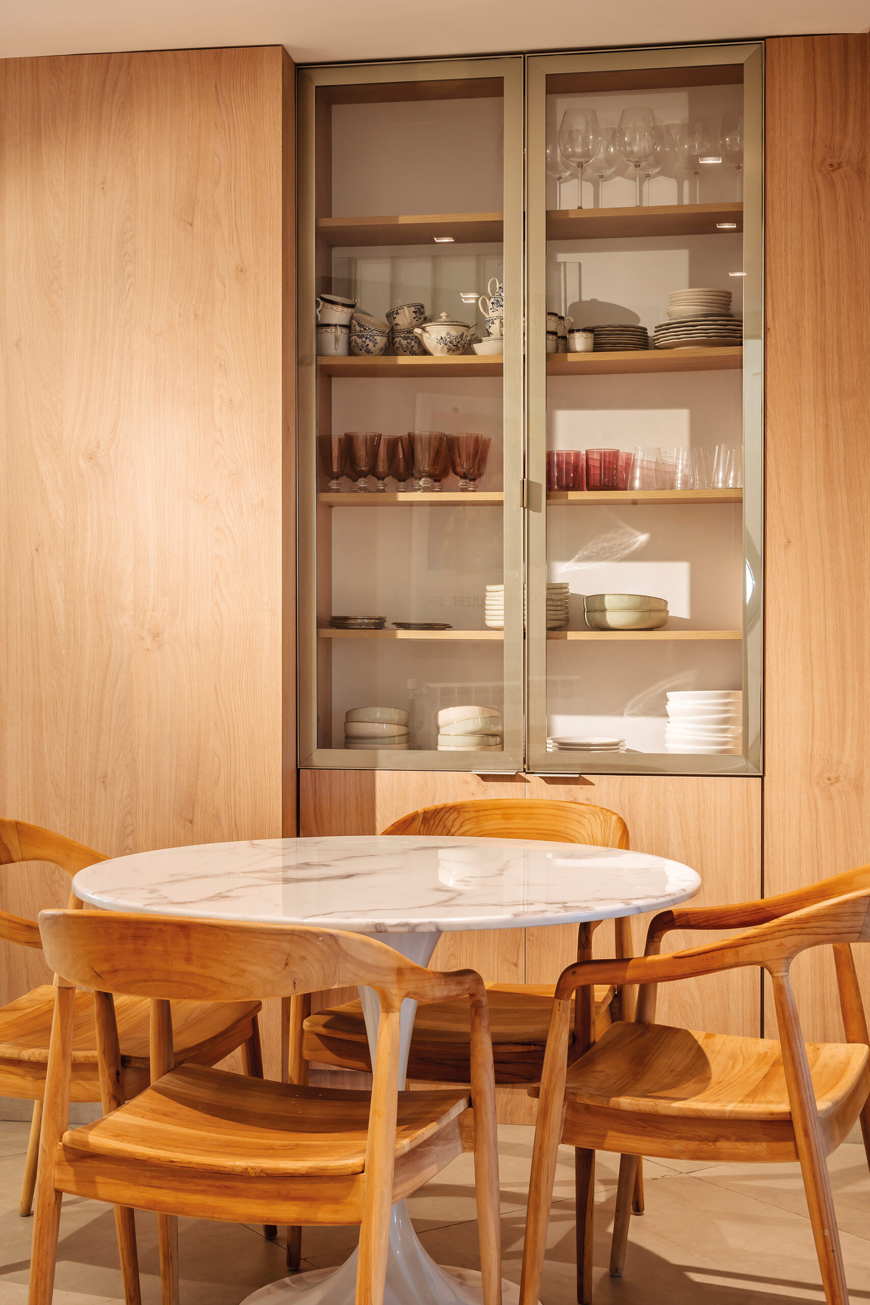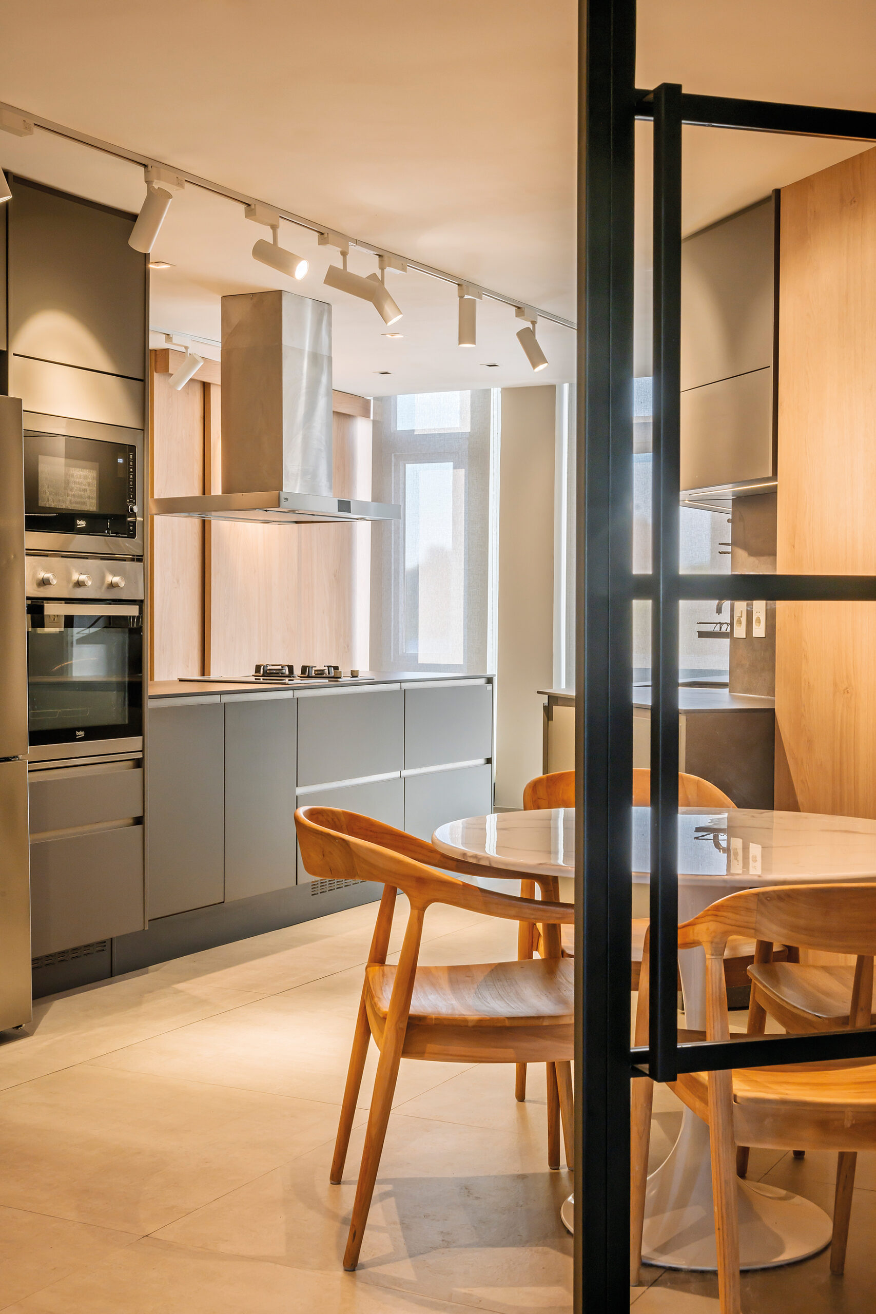 El mobiliario y la iluminación fueron concebidos en la misma línea. En el living, ubicado frente a un gran bow window facetado, las mesas circulares independientes permiten múltiples configuraciones, generando dinamismo en el espacio. La cocina, antes un conjunto fragmentado de pequeñas áreas, se convirtió en un sector amplio y funcional, donde el diseño contemporáneo convive con una iluminación meticulosamente planificada.