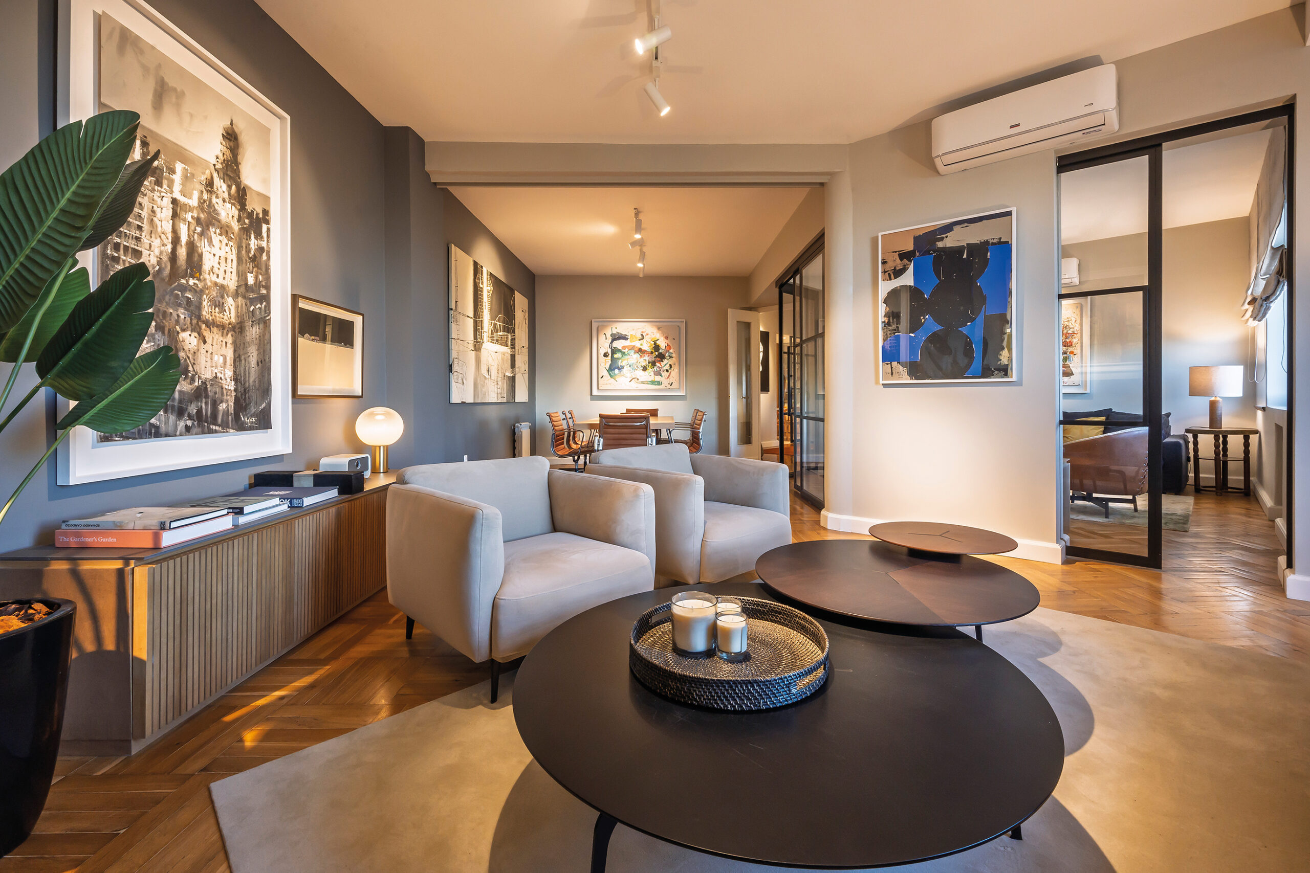 La luz, de hecho, es otro de los elementos claves de la reforma. Se trabajó en diferentes niveles lumínicos para acentuar la atmósfera de cada ambiente: rieles con spots de haces concentrados definen los volúmenes y resaltan las obras de arte, lámparas con pantallas aportan calidez en zonas de descanso y lectura, y un tercer nivel lumínico baña estratégicamente algunas plantas, proyectando sombras en el techo y generando una profundidad envolvente.