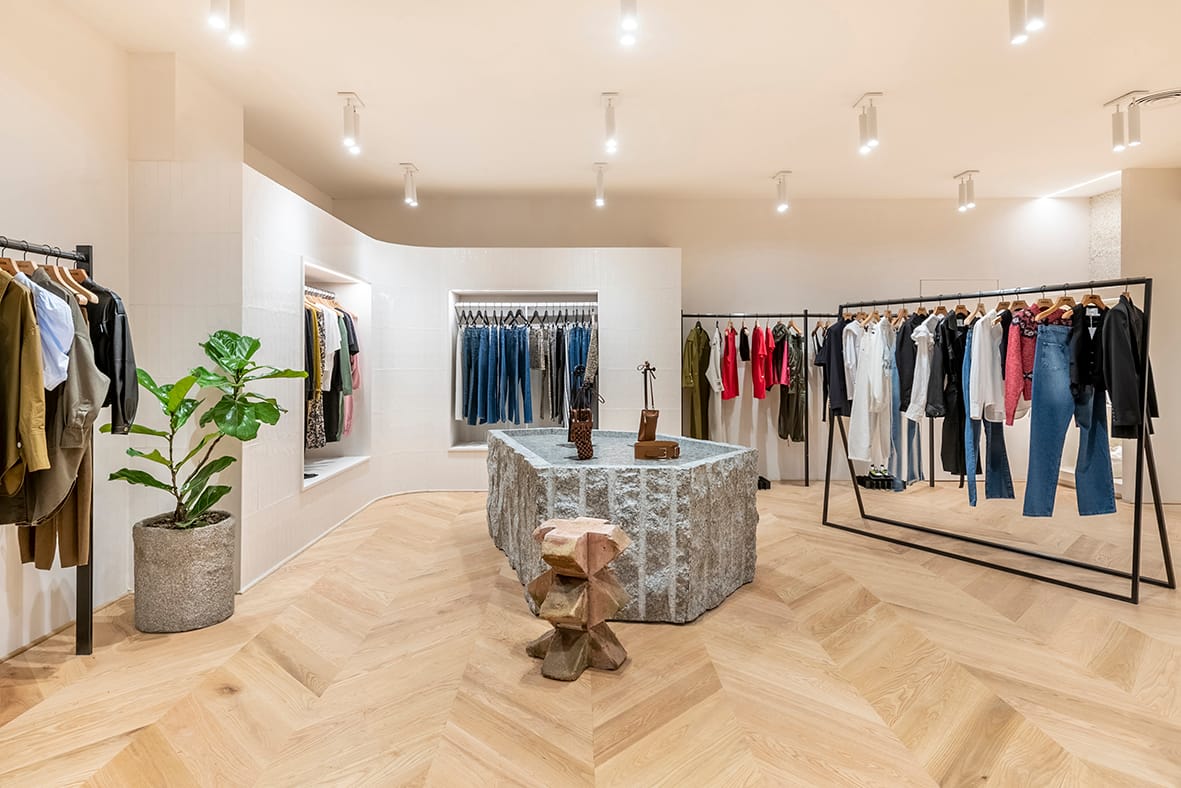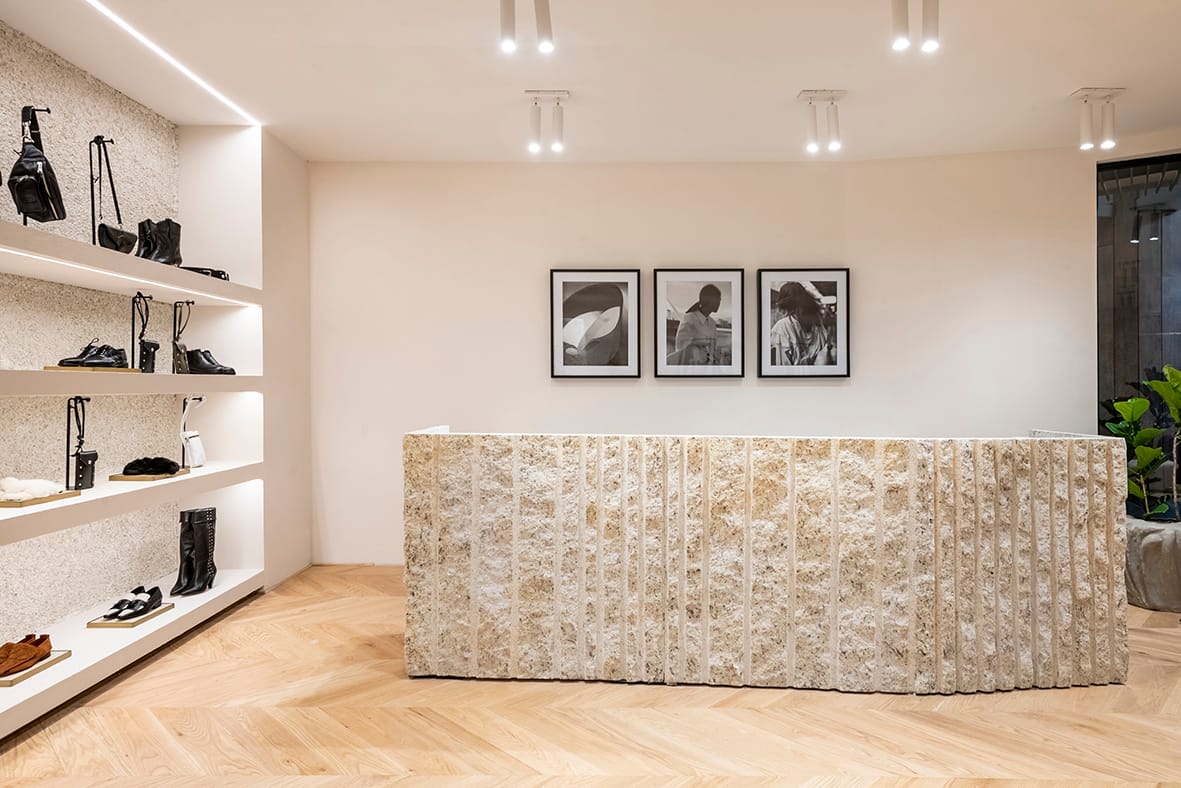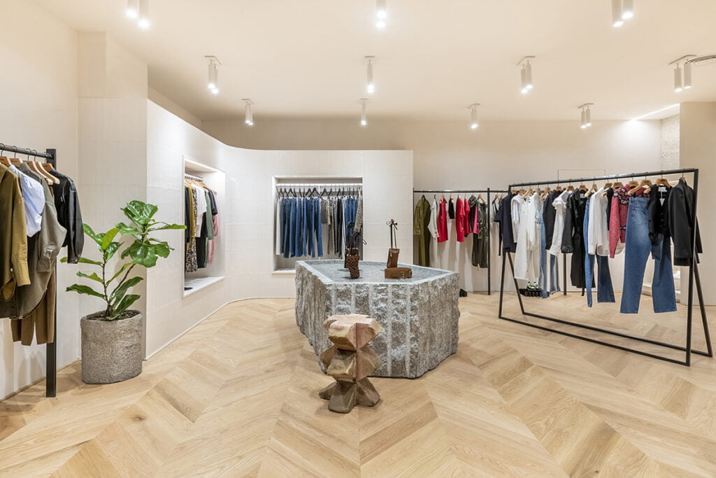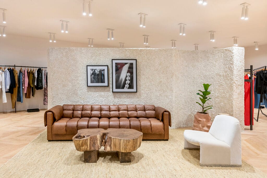 La delicadeza de las prendas y los accesorios de la marca se ve acompañada por finas piezas de diseño tanto en el mobiliario y los artefactos de iluminación, como en los cuadros y fotografías de moda. Un tapiz tejido a mano de Lalana Applied Arts es protagonista en una de las vidrieras principales, como homenaje al arte y los oficios argentinos.
