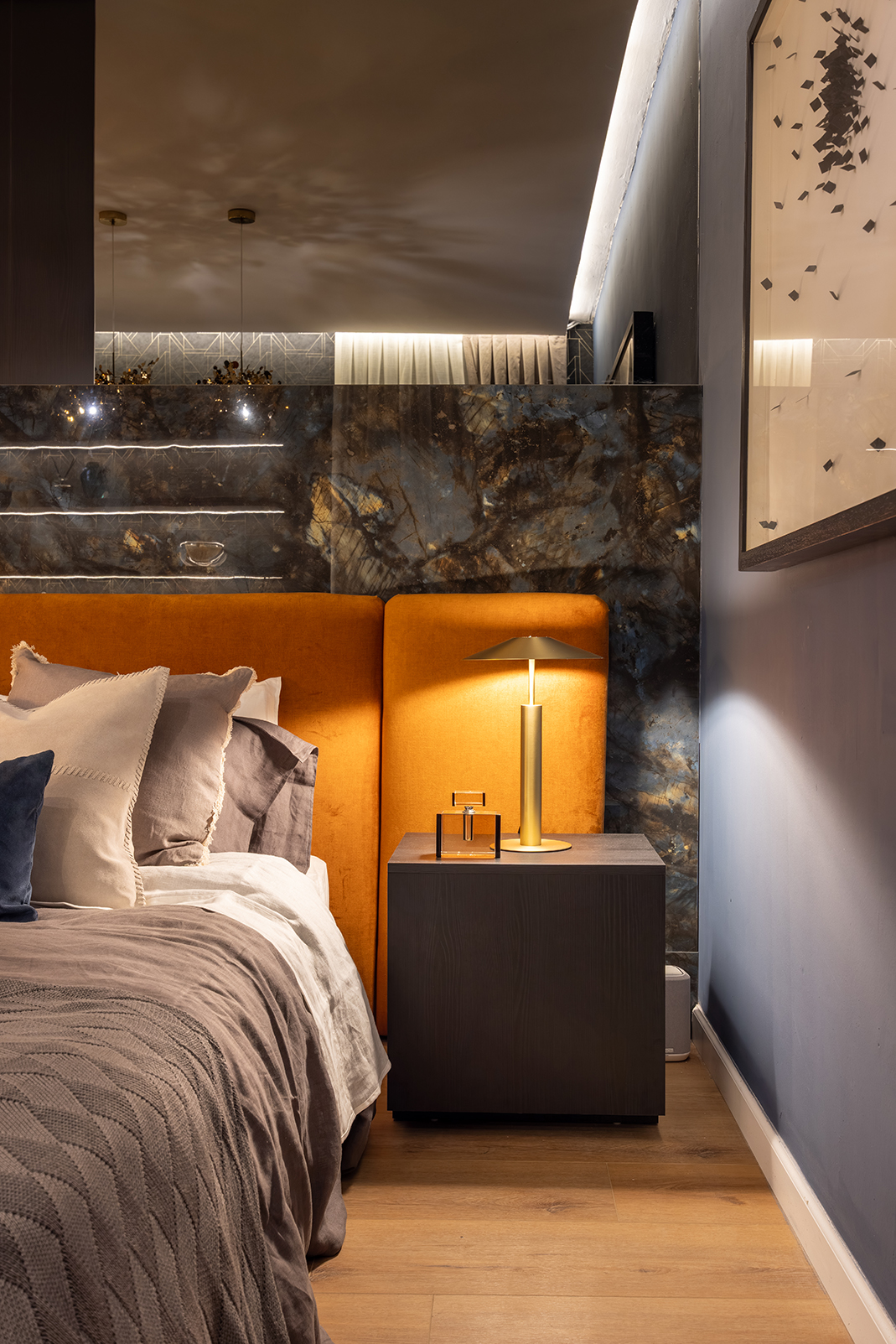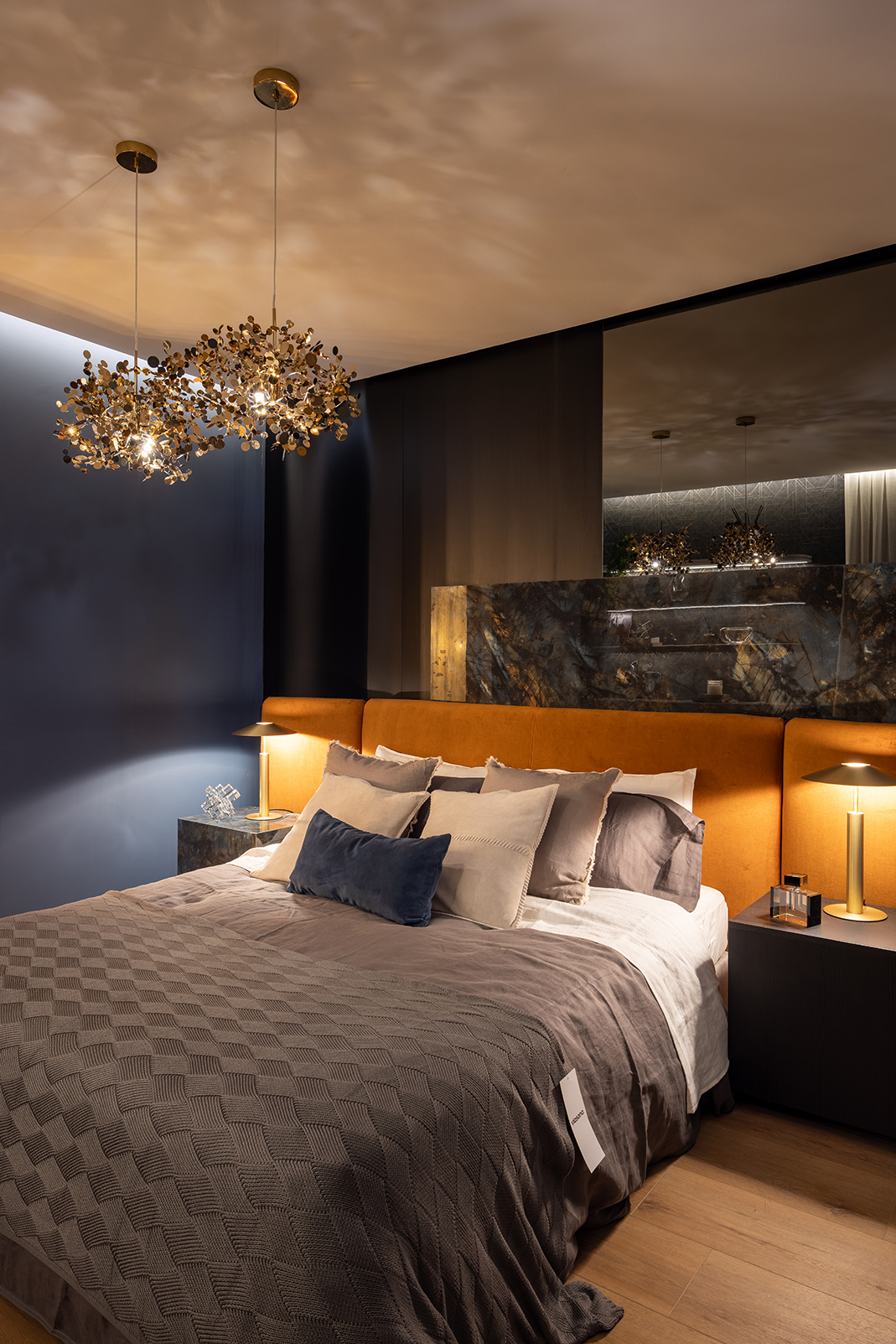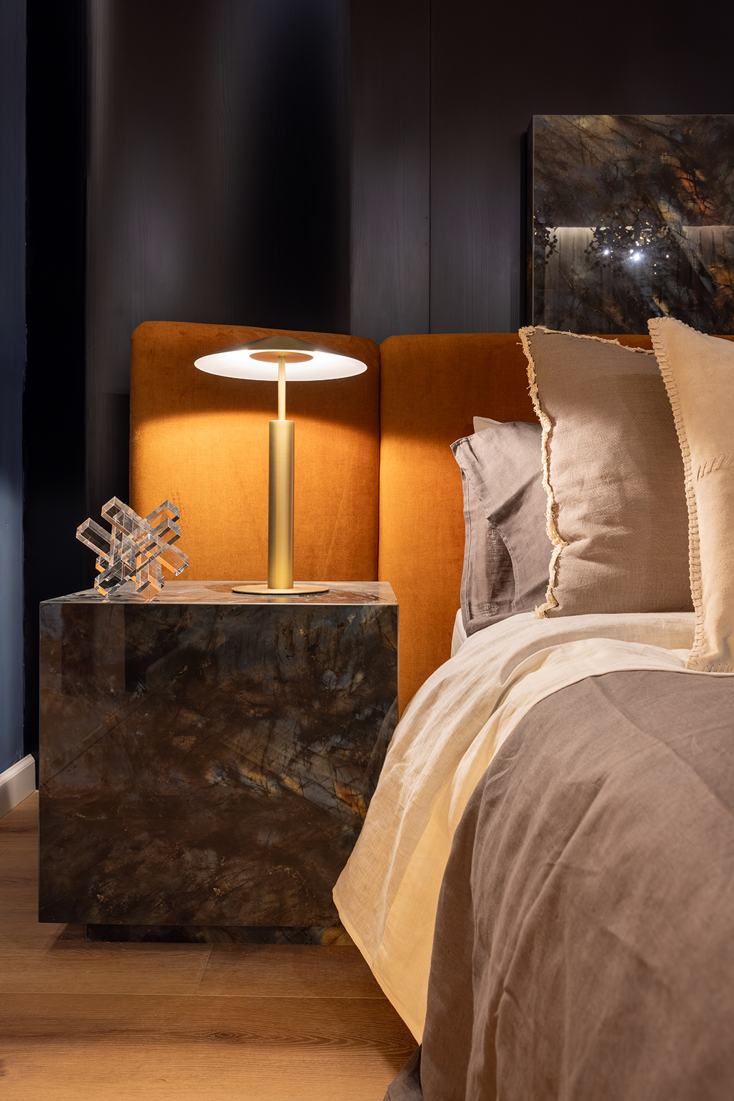 El concepto rector —ese “Lujo Urbano Sofisticado” que invocan— se revela como un manifiesto íntimo: un cuarto que podría pertenecer a un hotel de cinco estrellas oculto en alguna capital cosmopolita, donde la modernidad se lleva de la mano con la voluptuosidad. Azul profundo en las paredes: un azul que no teme oscurecer, que abraza al visitante como un telón que cae lentamente sobre el día. Una atmósfera nocturna, envolvente, casi líquida. A este escenario de penumbra elegante se suman los acentos cálidos: un cabecero ocre que parece haber sido imaginado para recordarnos que incluso en los interiores más oscuros la luz puede tener la última palabra. El contraste es nítido, casi pictórico: azul y negro que se tensan, ocre que responde, texturas que dialogan. La elección de materiales completa el relato: piedras, maderas, granitos, linos, géneros nobles que no pretenden ostentar, sino seducir. Un lujo contemporáneo, preciso, que se apoya más en la armonía de lo sensorial que en el brillo de lo evidente. “Aura Esmeralda” es un refugio donde la sofisticación no es un adorno, sino una filosofía; donde el dramatismo no grita, sino que murmura con elegancia; donde el estudio Puente demuestra que también en la sombra se puede encontrar belleza… siempre que uno se atreva a mirar.