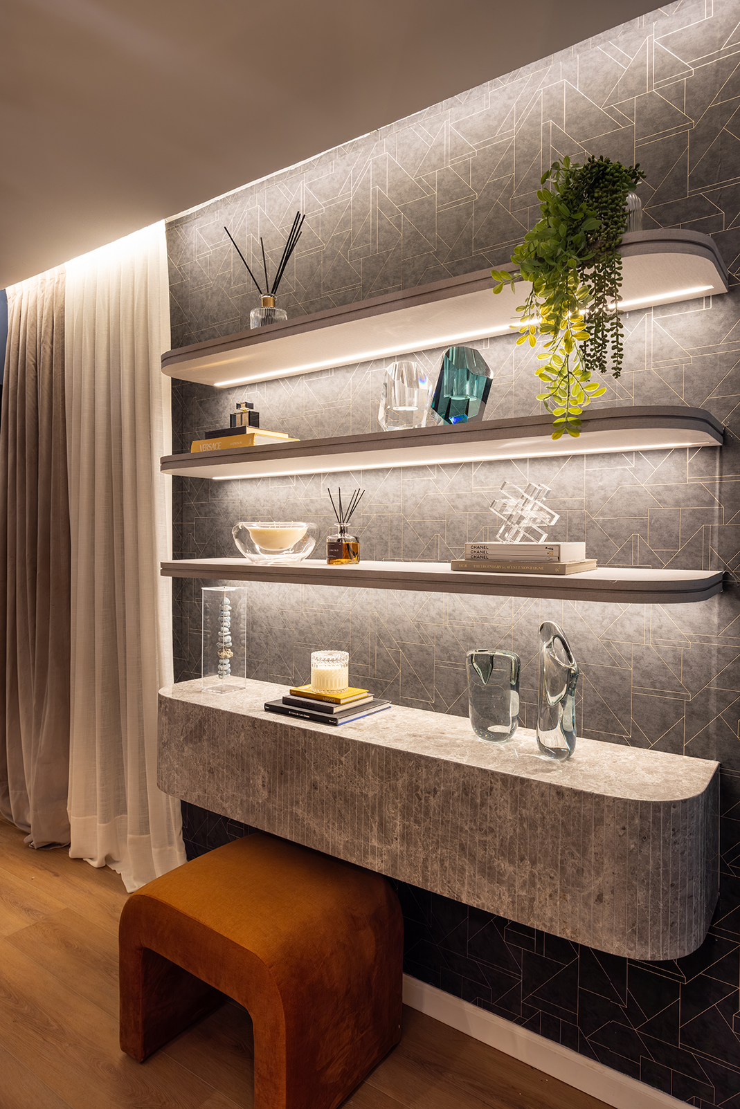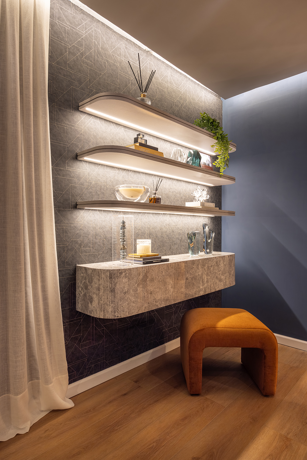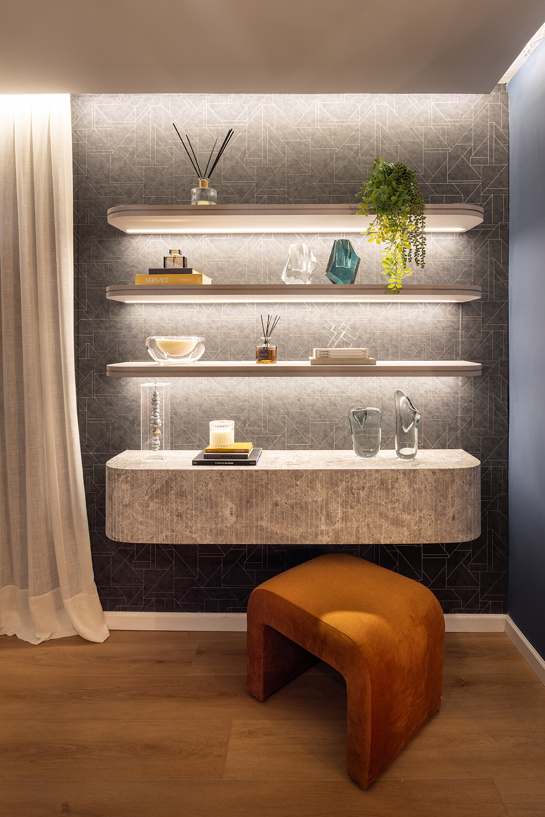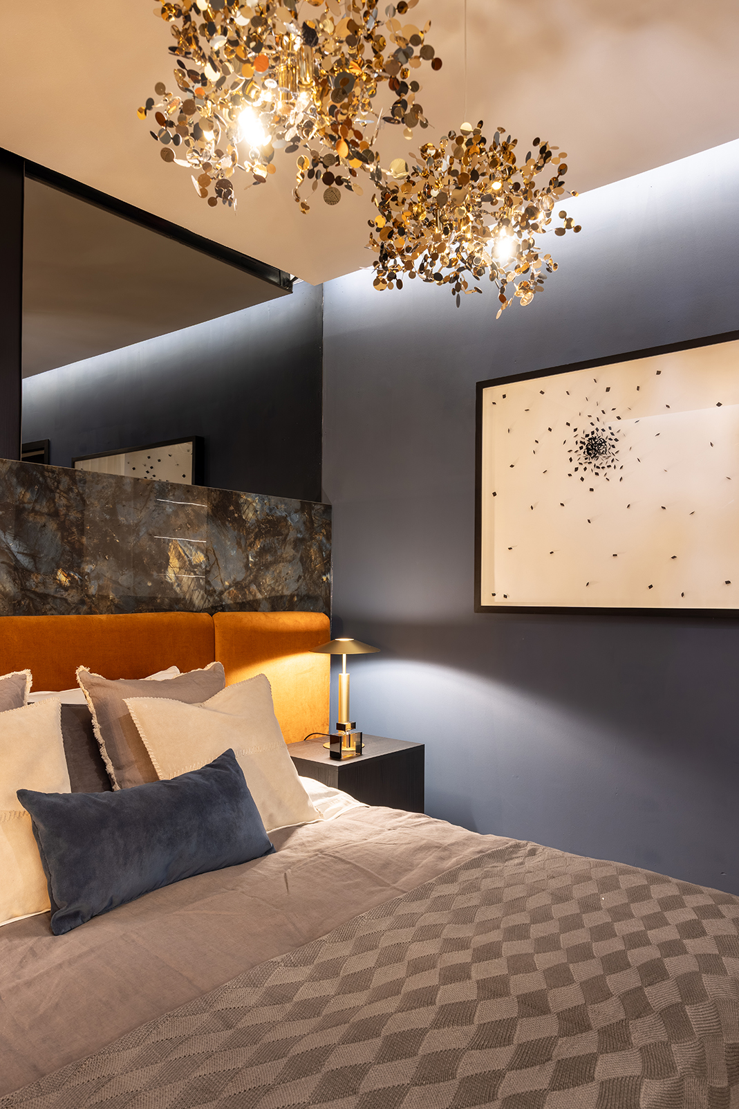 El concepto rector —ese “Lujo Urbano Sofisticado” que invocan— se revela como un manifiesto íntimo: un cuarto que podría pertenecer a un hotel de cinco estrellas oculto en alguna capital cosmopolita, donde la modernidad se lleva de la mano con la voluptuosidad. Azul profundo en las paredes: un azul que no teme oscurecer, que abraza al visitante como un telón que cae lentamente sobre el día. Una atmósfera nocturna, envolvente, casi líquida. A este escenario de penumbra elegante se suman los acentos cálidos: un cabecero ocre que parece haber sido imaginado para recordarnos que incluso en los interiores más oscuros la luz puede tener la última palabra. El contraste es nítido, casi pictórico: azul y negro que se tensan, ocre que responde, texturas que dialogan. La elección de materiales completa el relato: piedras, maderas, granitos, linos, géneros nobles que no pretenden ostentar, sino seducir. Un lujo contemporáneo, preciso, que se apoya más en la armonía de lo sensorial que en el brillo de lo evidente. “Aura Esmeralda” es un refugio donde la sofisticación no es un adorno, sino una filosofía; donde el dramatismo no grita, sino que murmura con elegancia; donde el estudio Puente demuestra que también en la sombra se puede encontrar belleza… siempre que uno se atreva a mirar.