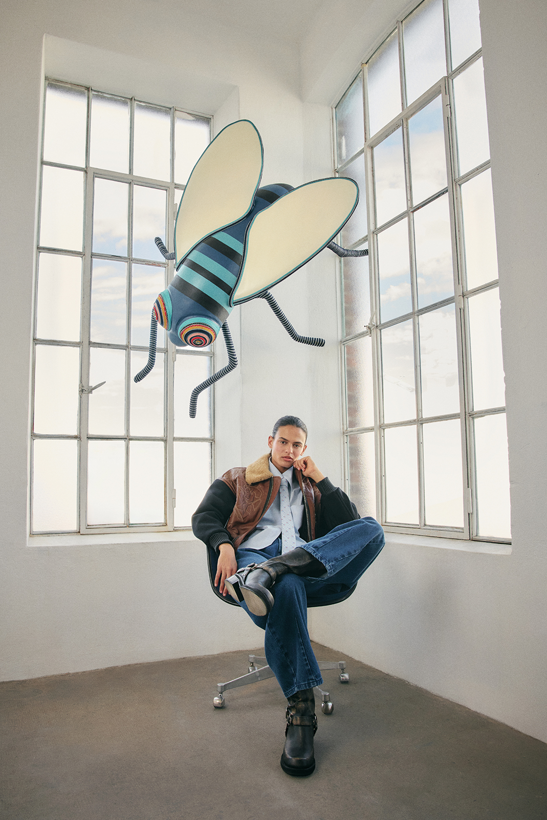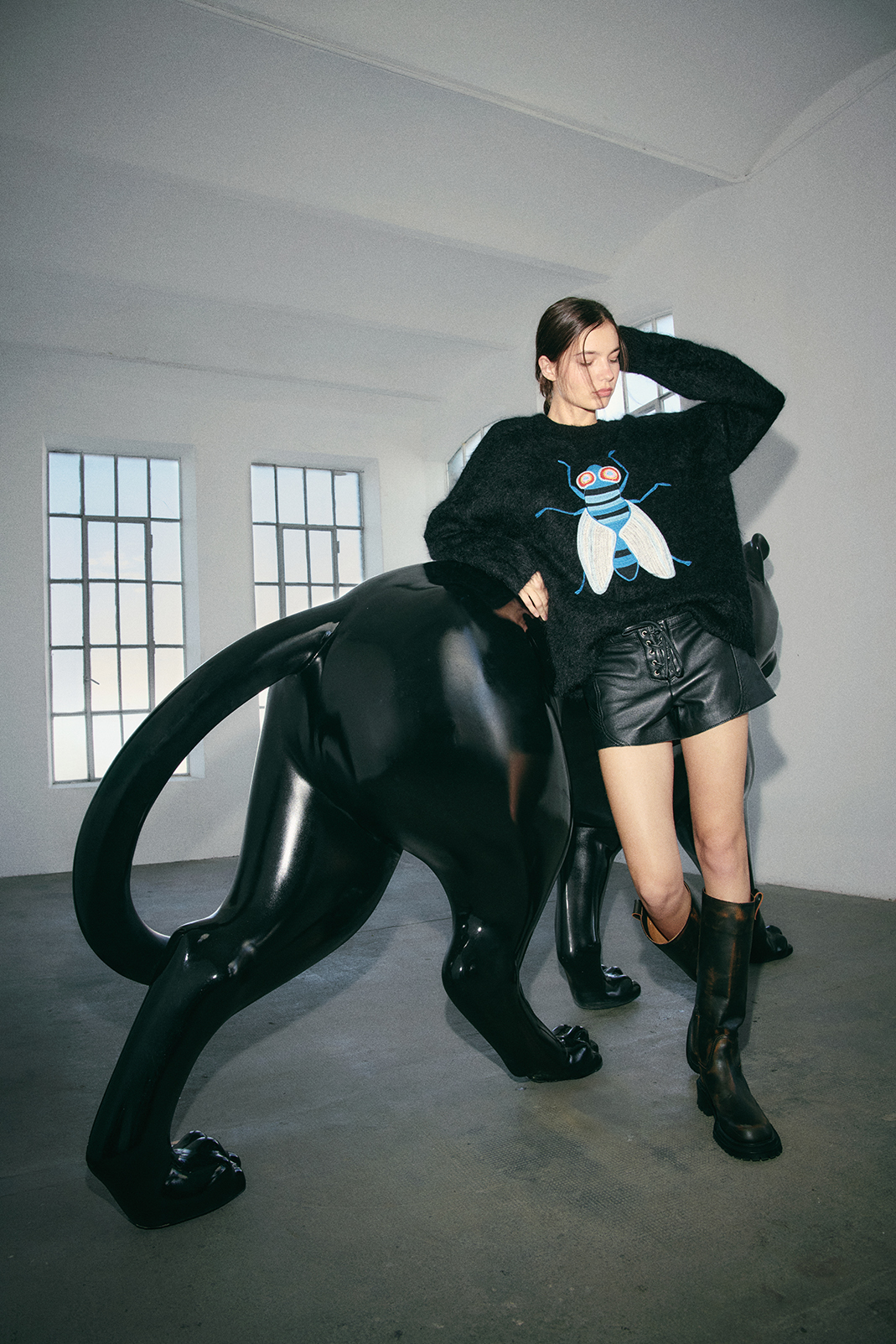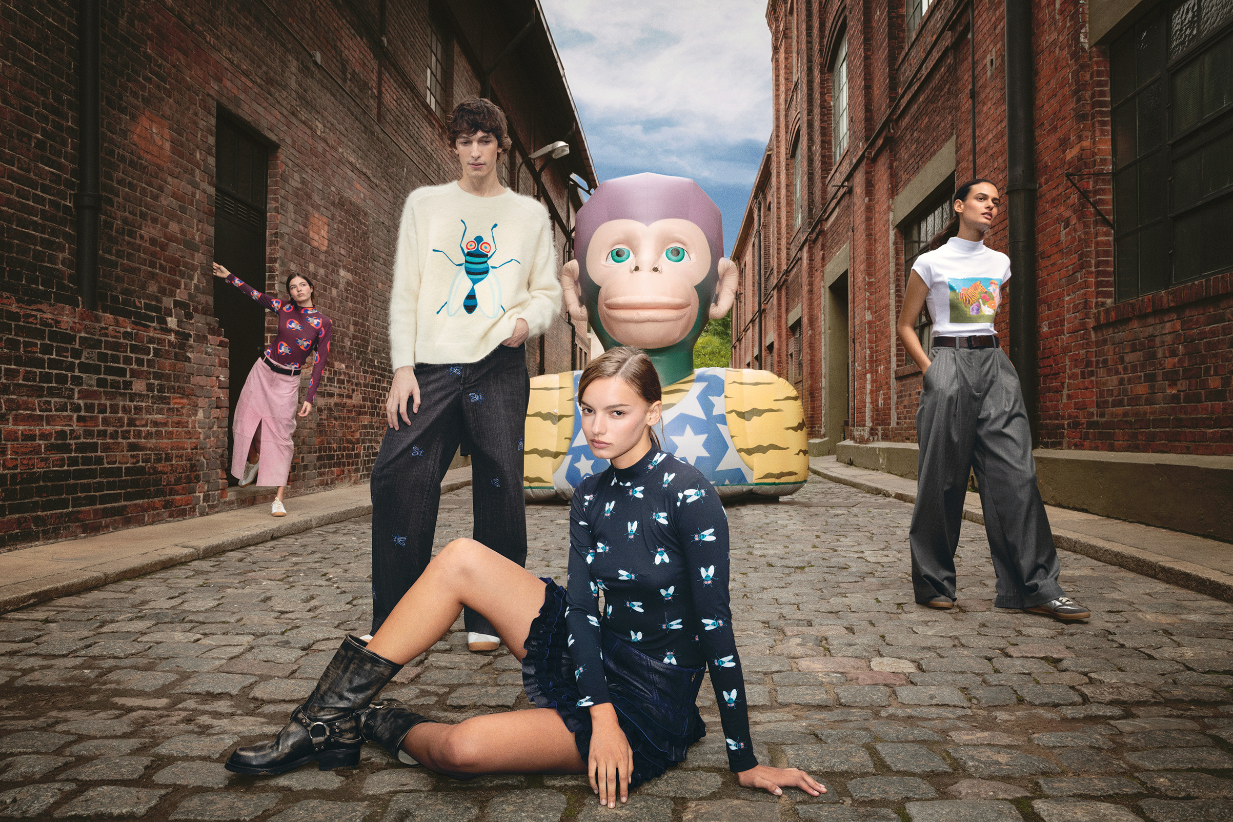 La colección creada por Chebar y Giménez fusiona el ADN vibrante de ambos mundos: cuero, hilados, calzado, accesorios y texturas que dialogan con el universo visual del artista, reinterpretado a través del diseño contemporáneo de la marca. Las famosas monas, las moscas y otras criaturas emblemáticas de Giménez aparecen integradas en las prendas con técnicas como bordados tridimensionales, jacquards y sedas, y con un enfoque que trasciende géneros y estilos, marcando un giro hacia una moda unisex, sofisticada e irreverente.