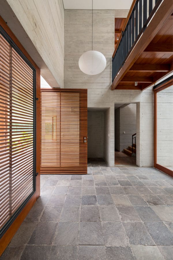 El ingreso aporta poesía y magia, está marcado por un camino revestido por baldosas de piedra, que nos conduce desde una plaza que se encuentra subiendo al nivel del terreno (tres metros sobre el nivel de la calle) hasta el remate de la roca abierta del cerro, atravesando una larga pérgola de madera que en el futuro será cubierta con buganvillas. Este camino atraviesa el interior de la casa, cortando el piso pastelón de todo el interior.