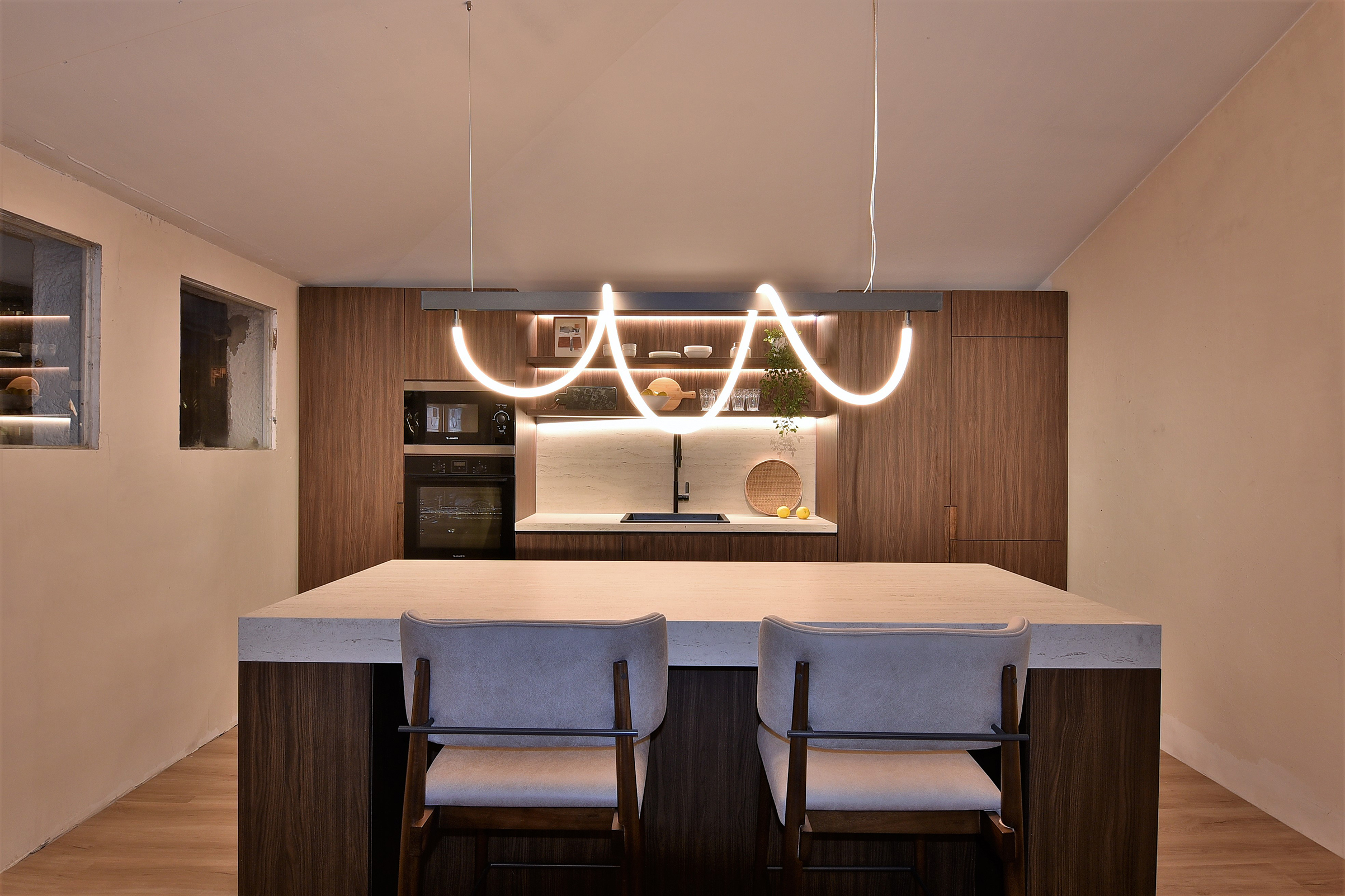 Aplicada en el restaurante CUERVO que se encuentra dentro de la casa, esta terminación con apariencia de piedra natural, en color tostado mediterráneo otorga un carácter cálido y natural. Su efecto piedra realza la atmósfera del ambiente y funciona tanto en interiores como en exteriores.