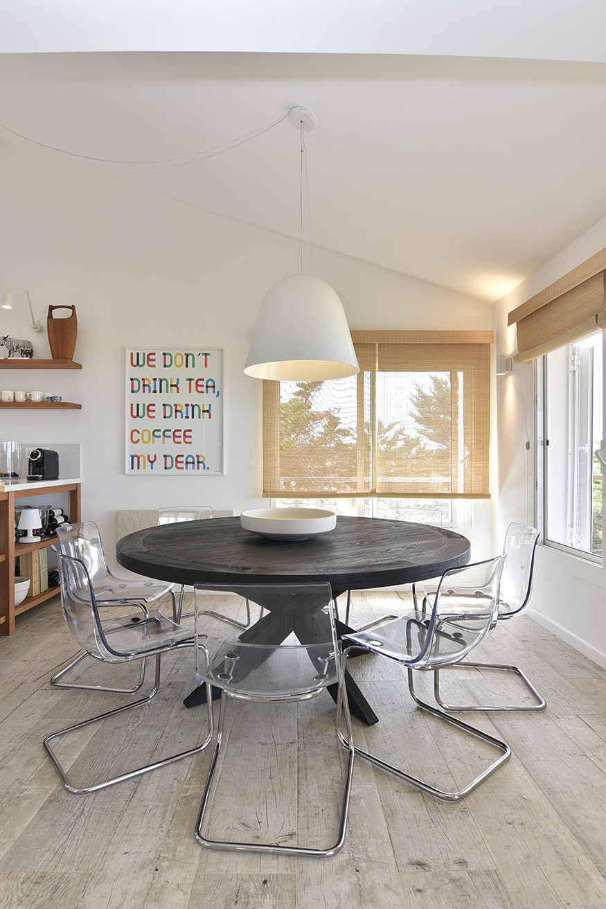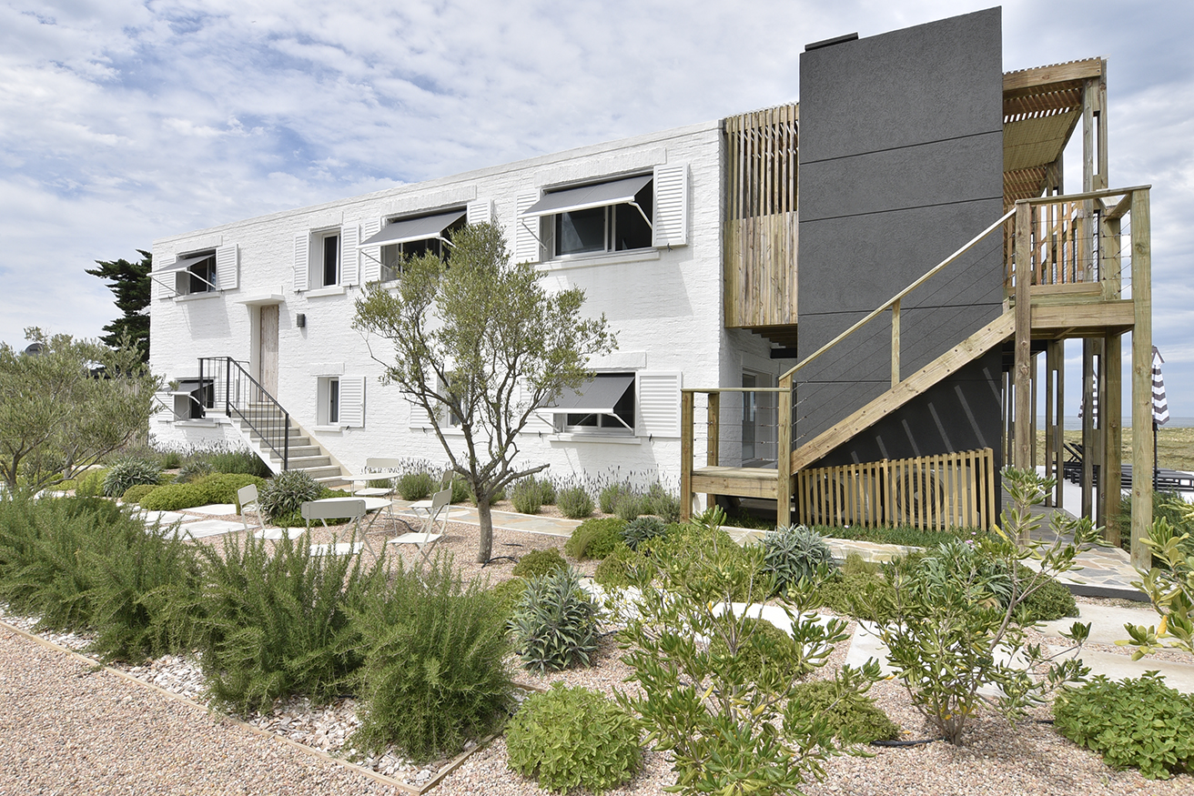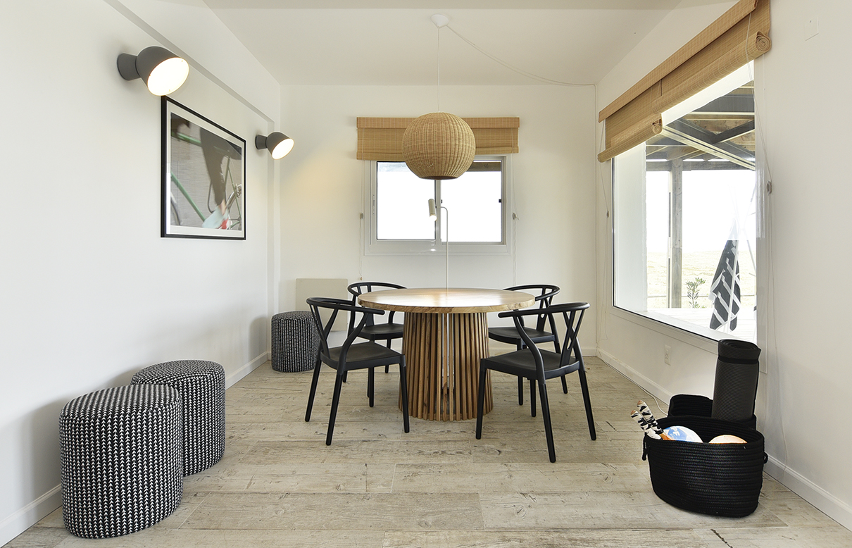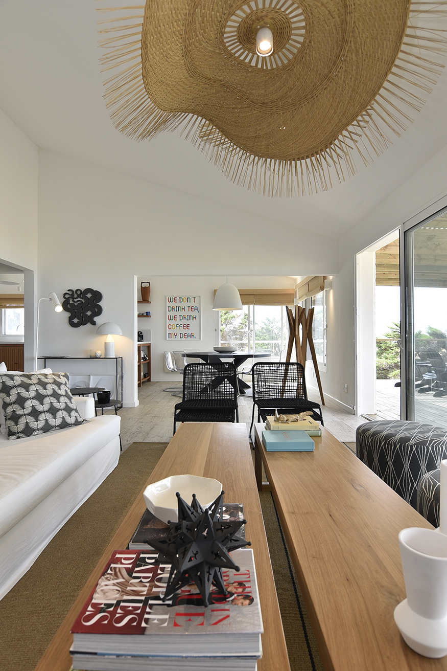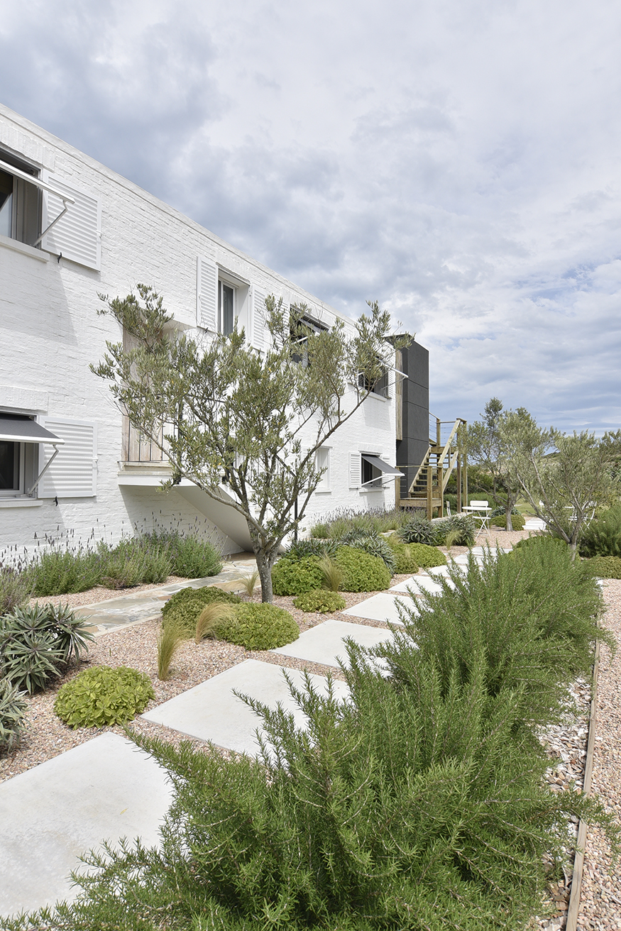 En este gran ambiente fluye la circulación gracias al diseño abierto y espacioso de la cocina y a la gran mesa redonda de madera que protagoniza el comedor y distribuye el espacio hacia el living. La atmósfera buscada y lograda en este espacio se enseña claramente, reunión, integración, contención. Un hogar de hierro pintado de negro resalta con los blancos puros de las paredes y el porcelanato gris símil madera que reviste el pavimento establecen una caja fantástica que permite destacar todo lo que contiene. A la vez el hogar opera como un articulador espacial muy plástico. Un gran sofá de tela blanco y una doble mesa de madera que acompaña su recorrido son contenidos y contrastados por dos sillas de hierro negras que orientan la sala de estar hacia el espacio exterior y se entregan la playa y, en su esencia, destacan claramente las fibras y texturas naturales, la paleta de colores puros acentuando así el sentimiento en cuanto al concepto incorporado como “casa playera” por la diseñadora, con una impronta muy personal y bastante particular. Se puede apreciar también en los espacios comunes la importancia que asignan al arte los habitantes, en el recorrido podemos encontrar obras de autores contemporáneos de la joven artista Francesca Molinari Cattarossi. Estas intervenciones forman parte de sus últimas series de obras y cada una de ellas fue seleccionada a medida para el espacio donde se encuentra, entregando color originalidad y armonía en cuanto a los distintos diseños en cada espacio. Ubicado al fondo, contenido por un acceso que otorga privacidad, se encuentra el dormitorio principal, en suite con vestidor. En el exterior, se resolvió dividir el jardín en dos, generando situaciones y espacios diferentes. Al frente un patio seco con plantas que resuelven una vegetación árida de bajo mantenimiento compuesto por Lavandas que se apoyan en la casa y marcan dos caminos, el primero que se abre y el más ajustado es el ya existente del viejo chalet, revestido en piedra y angosto que se cierra por un muro de Pittosporum que enmarcan un camino sendero ancho contenido por romeros que presenta a la escalera de hierro en la entrada principal de la fachada. Como protagonista aparece un breve parque que se resguarda de los vientos que se resuelve por medio de los Olivos, compuesto por un juego de mesa y sillas tipo bistró de chapa que invita a disfrutar del sector jardín en cualquier momento del día.