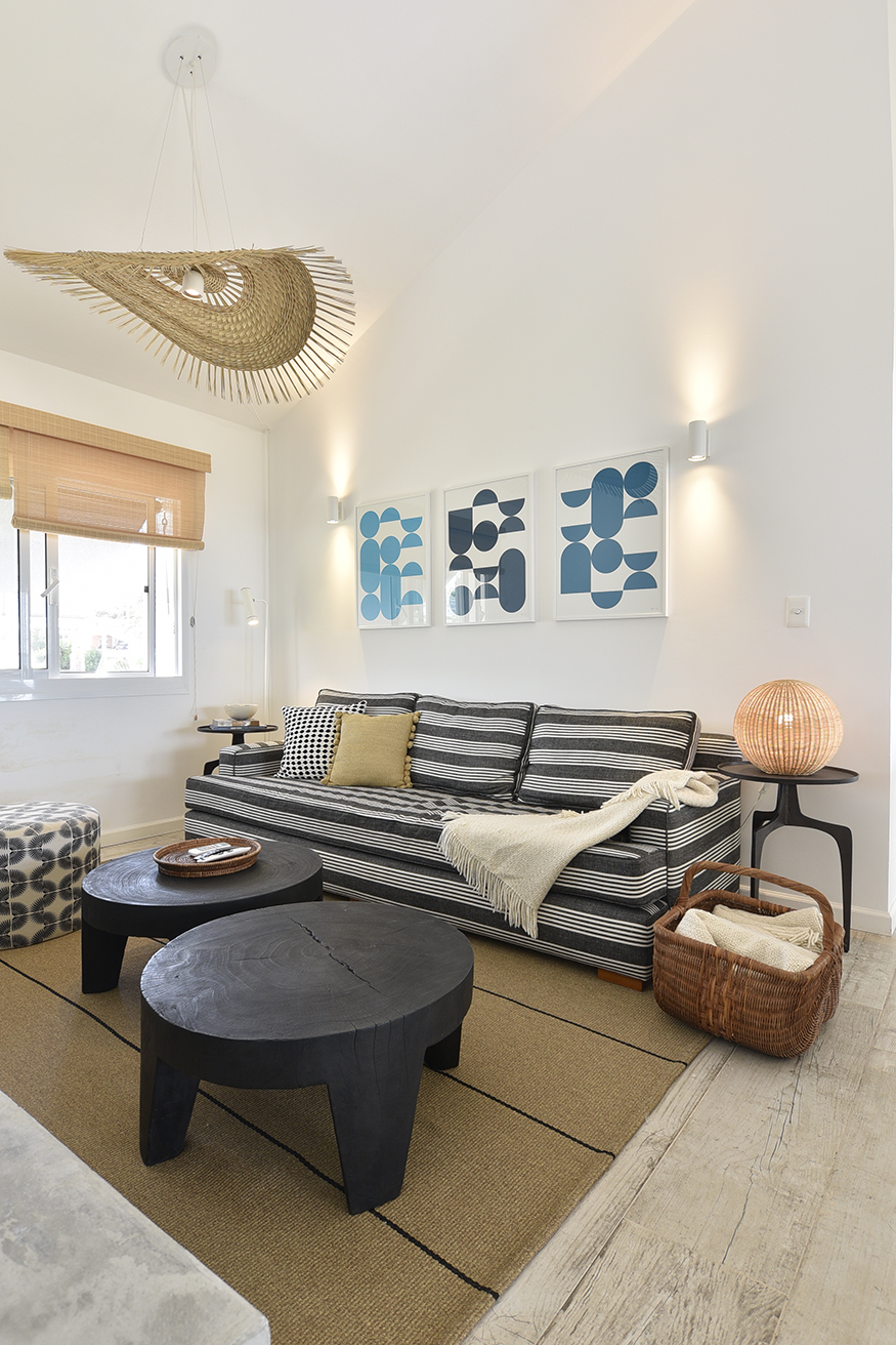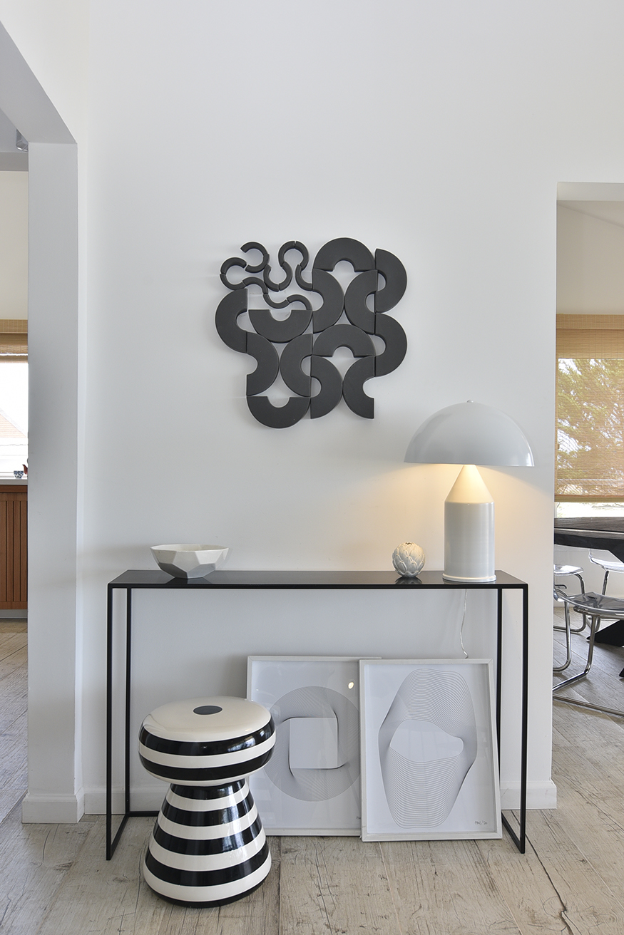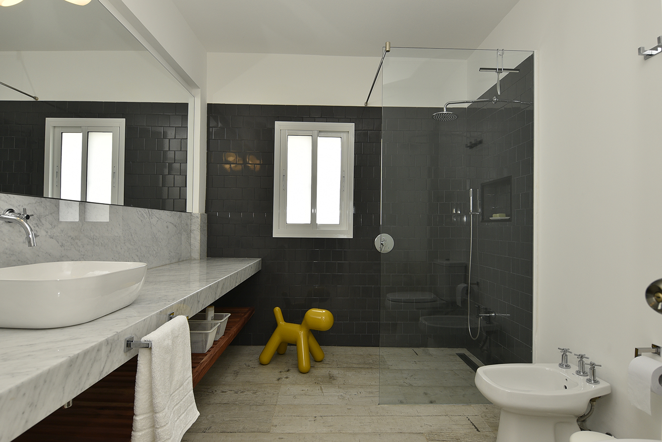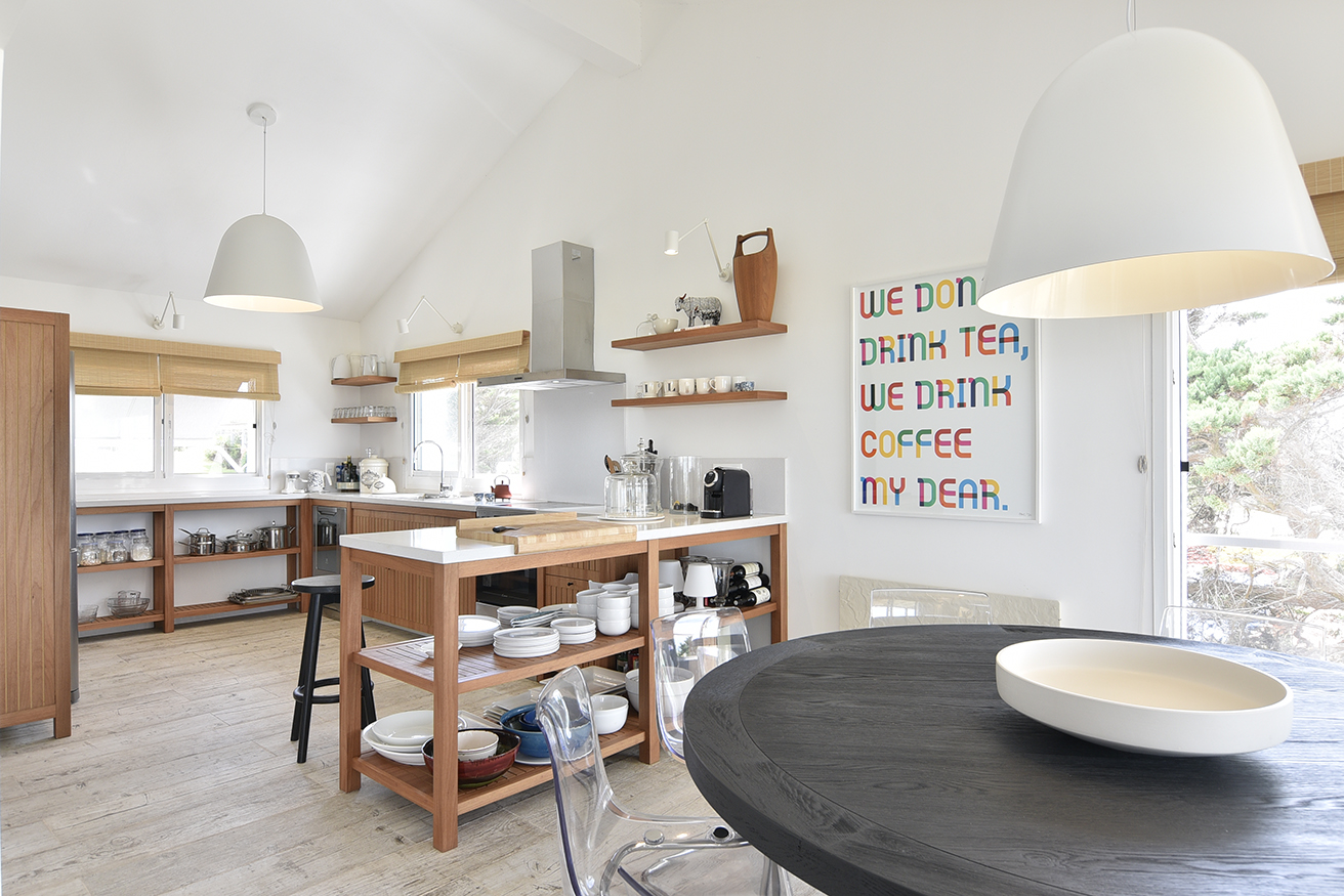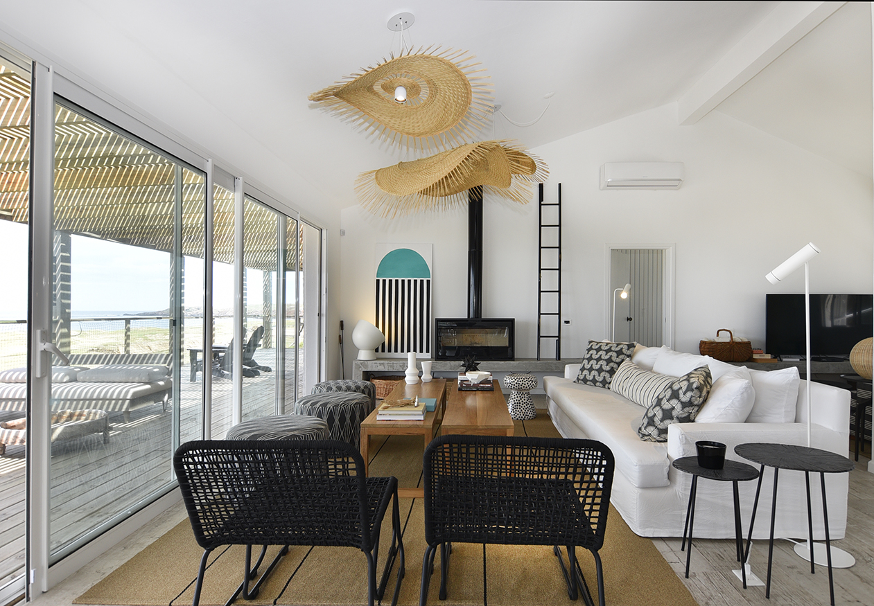 En este gran ambiente fluye la circulación gracias al diseño abierto y espacioso de la cocina y a la gran mesa redonda de madera que protagoniza el comedor y distribuye el espacio hacia el living. La atmósfera buscada y lograda en este espacio se enseña claramente, reunión, integración, contención. Un hogar de hierro pintado de negro resalta con los blancos puros de las paredes y el porcelanato gris símil madera que reviste el pavimento establecen una caja fantástica que permite destacar todo lo que contiene. A la vez el hogar opera como un articulador espacial muy plástico. Un gran sofá de tela blanco y una doble mesa de madera que acompaña su recorrido son contenidos y contrastados por dos sillas de hierro negras que orientan la sala de estar hacia el espacio exterior y se entregan la playa y, en su esencia, destacan claramente las fibras y texturas naturales, la paleta de colores puros acentuando así el sentimiento en cuanto al concepto incorporado como “casa playera” por la diseñadora, con una impronta muy personal y bastante particular. Se puede apreciar también en los espacios comunes la importancia que asignan al arte los habitantes, en el recorrido podemos encontrar obras de autores contemporáneos de la joven artista Francesca Molinari Cattarossi. Estas intervenciones forman parte de sus últimas series de obras y cada una de ellas fue seleccionada a medida para el espacio donde se encuentra, entregando color originalidad y armonía en cuanto a los distintos diseños en cada espacio. Ubicado al fondo, contenido por un acceso que otorga privacidad, se encuentra el dormitorio principal, en suite con vestidor. En el exterior, se resolvió dividir el jardín en dos, generando situaciones y espacios diferentes. Al frente un patio seco con plantas que resuelven una vegetación árida de bajo mantenimiento compuesto por Lavandas que se apoyan en la casa y marcan dos caminos, el primero que se abre y el más ajustado es el ya existente del viejo chalet, revestido en piedra y angosto que se cierra por un muro de Pittosporum que enmarcan un camino sendero ancho contenido por romeros que presenta a la escalera de hierro en la entrada principal de la fachada. Como protagonista aparece un breve parque que se resguarda de los vientos que se resuelve por medio de los Olivos, compuesto por un juego de mesa y sillas tipo bistró de chapa que invita a disfrutar del sector jardín en cualquier momento del día.