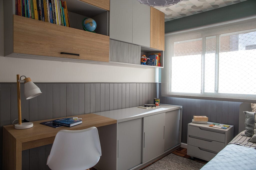 El dormitorio Infantil es espacio diseñado para un niño de siete años de edad. Con la premisa de poder invitar amigos y poder guardar la gran cantidad de juguetes que tenía se diseñó un gran mueble que contempla área de almacenaje, escritorio y biblioteca. La cama es marinera y la mesa de luz tiene ruedas para poder ser posicionada bajo el escritorio con mayor facilidad. La mesa de luz y el baúl también fueron diseñados exclusivamente siendo su terminación laqueado color gris con detalles de buñas muy originales.