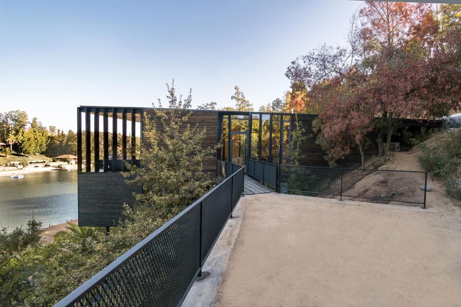 El diseño se compone de una estructura elemental de acero y hormigón que interviene poco en el terreno, para luego recibir una piel de madera y cristal.