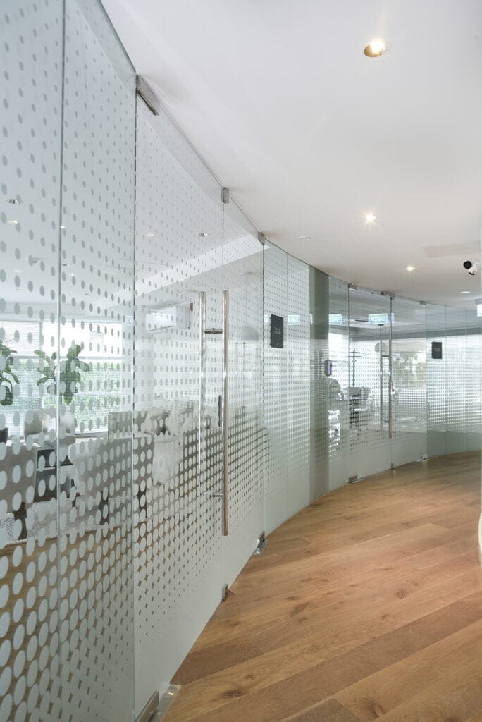 Más allá de las aberturas, aporte específico y sustancial para la ejecución de la obra, BIA participó equipando los baños de todas las unidades con sus mamparas de última generación y con los revestimientos y cerramientos de las zonas comunes donde se instalaron espejos, glass splash y cristales opalinos. En el hall de acceso se instalaron cerramientos Curtain Wall con DVH conformados con cristales de altísima prestación y en el cuerpo de acceso cristales y revestimientos. Para el estanque de la fuente se aplicaron paneles de laminado templado con inscripción digital.