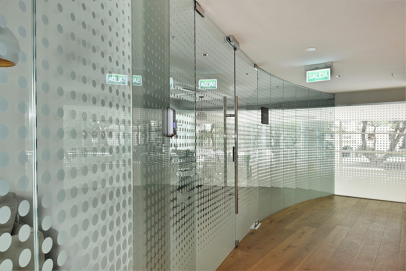 Más allá de las aberturas, aporte específico y sustancial para la ejecución de la obra, BIA participó equipando los baños de todas las unidades con sus mamparas de última generación y con los revestimientos y cerramientos de las zonas comunes donde se instalaron espejos, glass splash y cristales opalinos. En el hall de acceso se instalaron cerramientos Curtain Wall con DVH conformados con cristales de altísima prestación y en el cuerpo de acceso cristales y revestimientos. Para el estanque de la fuente se aplicaron paneles de laminado templado con inscripción digital.