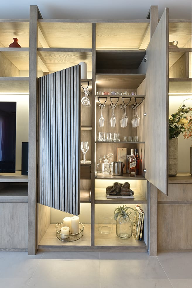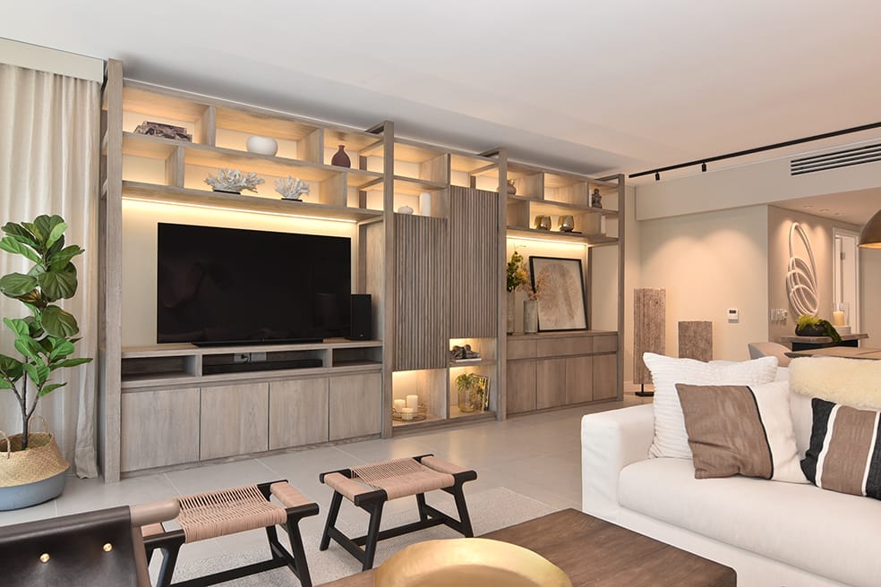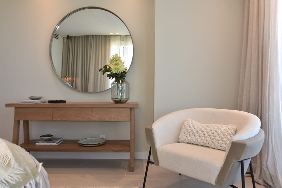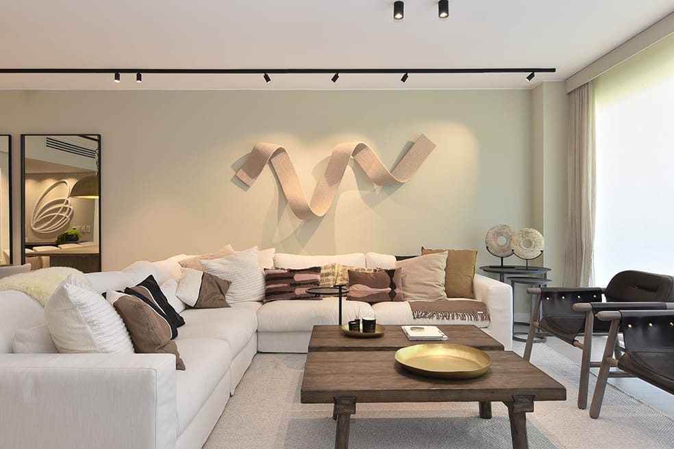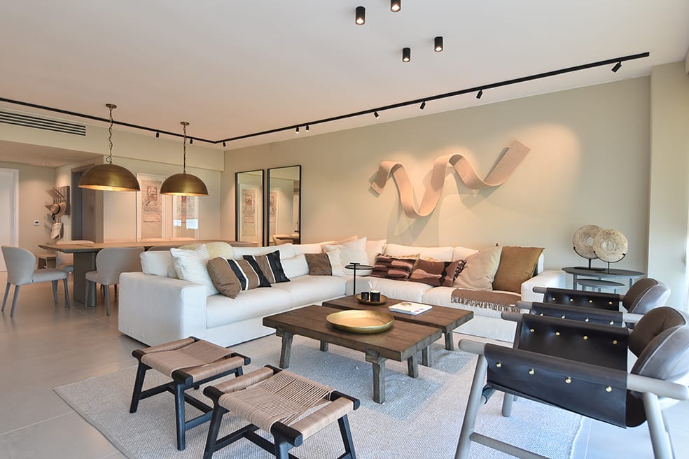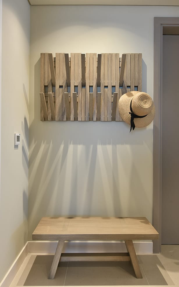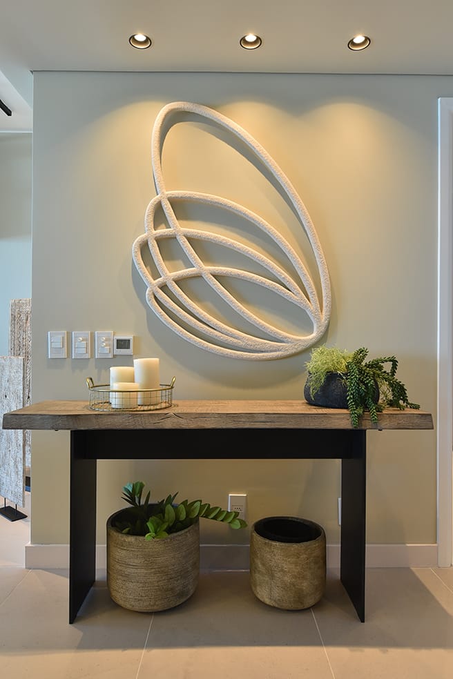 Al ingresar, nos encontramos un gran espacio central que libera y purifica la planta y divide los espacios de uso común con las áreas privadas, rápidamente hacemos cuenta de cada uno de los detalles en cuanto al diseño que absorbe la propuesta; estilo contemporáneo que se define a través de la selección de colores puros en el revestimiento de los pisos y la contención de igual forma en el cielorraso optando por tonalidades neutras en las paredes que concilian con las distintas texturas y colores que propone el mobiliario. En esa sintonía, el acceso al apartamento se muestra con un recibidor que ejerce de articulador en la distribución de ambientes.