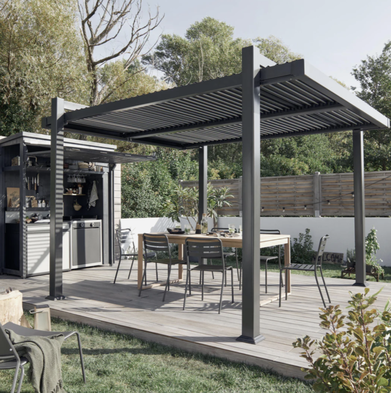 Diseñada para una instalación permanente, la Pérgola Persea te ofrece un espacio de protección ampliado durante todo el año que te permitirá colocar una mesa y sillas para 8 personas para disfrutar de una agradable comida. Además de protegerte de la lluvia y el sol, la Pérgola Persea es bioclimática: su techo rectangular está formado por lamas de aluminio impermeables que pueden orientarse con una manivela para adaptarse a tus necesidades. Podes ajustarla para aprovechar el sol, dejar pasar un poco de aire refrescante o protegerte de la lluvia. Fabricada íntegramente en aluminio, su estructura es resistente a la humedad y al óxido. Los soportes del armazón y los pies han sido especialmente diseñados para facilitar la evacuación del agua de lluvia y evitar su estancamiento.
