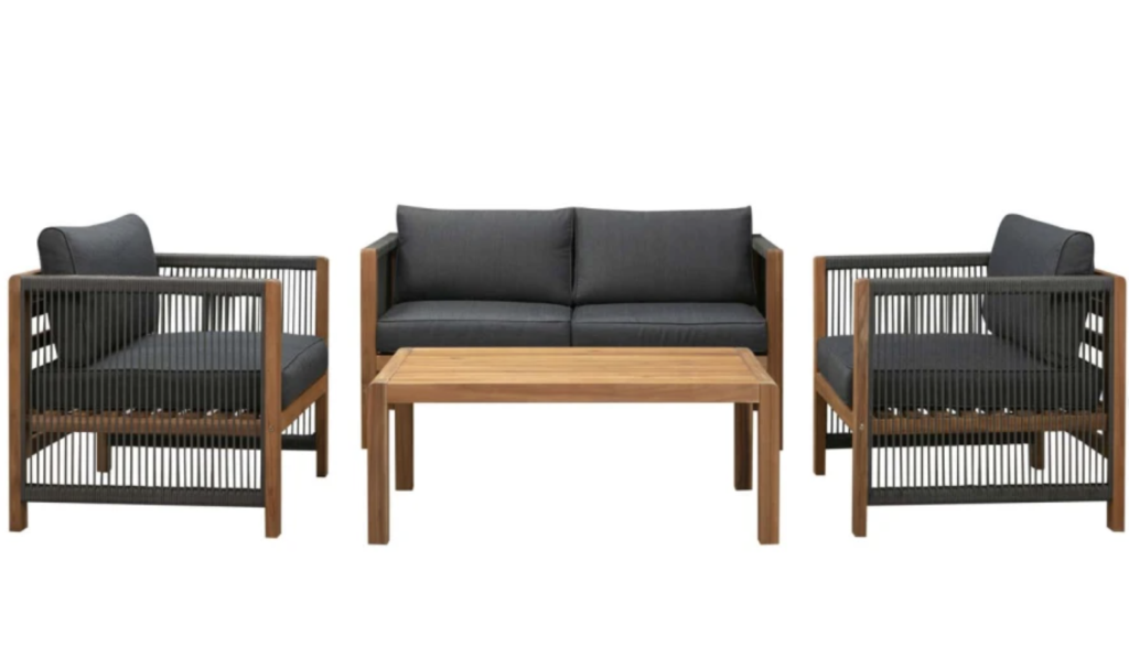 Fabricado en madera maciza de acacia con certificación´+on FSC y diseñado con un distintivo entramado vertical de cuerda de seis milímetros, combina estilo y funcionalidad. Almohadones tapizados en tela Spunpoly de 230 gramos con fundas desmontables, diseñada para uso exterior, garantizando durabilidad y resistencia a la decoloración por rayos UV. El set incluye un sofá de dos cuerpos, dos butacas y una mesa central.